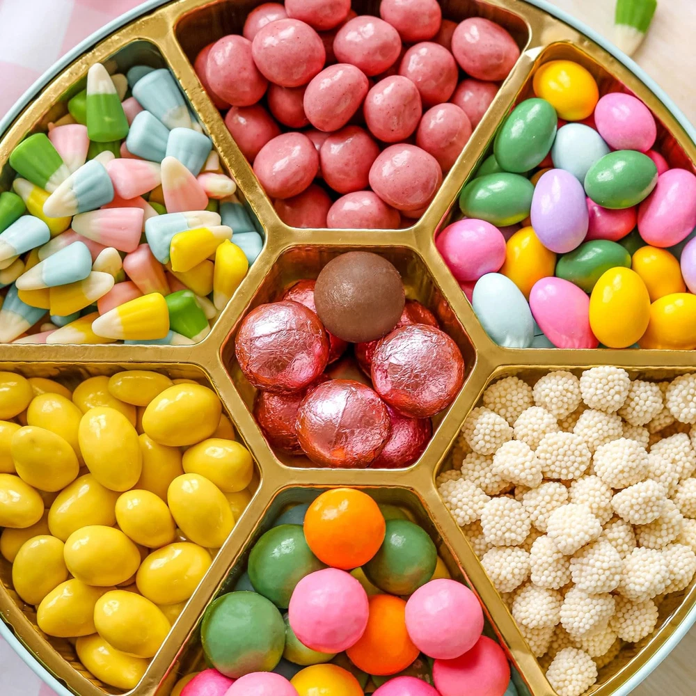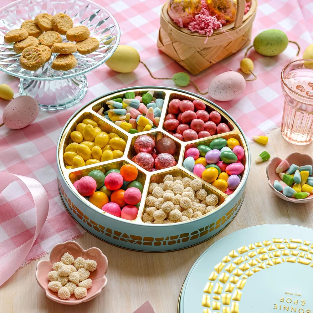 CELEBRATE sweetness with our delightful gift tin. Adorned in soft light blue, this round tin harbors a scrumptious assortment of seasonal favorites. Perfect for holiday gifting or indulging in the joyous spirit of Easter celebrations. CELEBRATE sweetness with our delightful gift tin. Adorned in soft light blue, this round tin harbors a scrumptious assortment of seasonal favorites. Perfect for holiday gifting or indulging Mom. GREAT GIFT: Arrives in an elegant keepsake tin packed with Candy Corn, Malt Balls, Strawberry Shortbread, Candy Champagne Gummies, Colorful Chocolate Almonds and Pink Foiled Chocolate Balls SAFE AND CONVENIENT PACKAGING: Each snack section arrives INDIVIDUALLY WRAPPED to promote hygiene safety, freshness and cleanliness for sharing. Keepsake tin is a remembrance long after the occasion and snacks are gone - send one to yourself! SAY IT SWEETLY: Great gift for families and corporate gifting alike. The right choice for multiple holidays like Mother’s Day, Father’s Day, Summer Cheer, Christmas, Valentine’s Day, Easter, Hanukkah, Birthdays, Sympathy, Condolence, to say Thank You, I Love You, and everything in between. ELEGANT GIFTING: Our Bonine and Pop embellished tin makes this an elegant gift that will be a keepsake long after the occasion and snacks are gone.