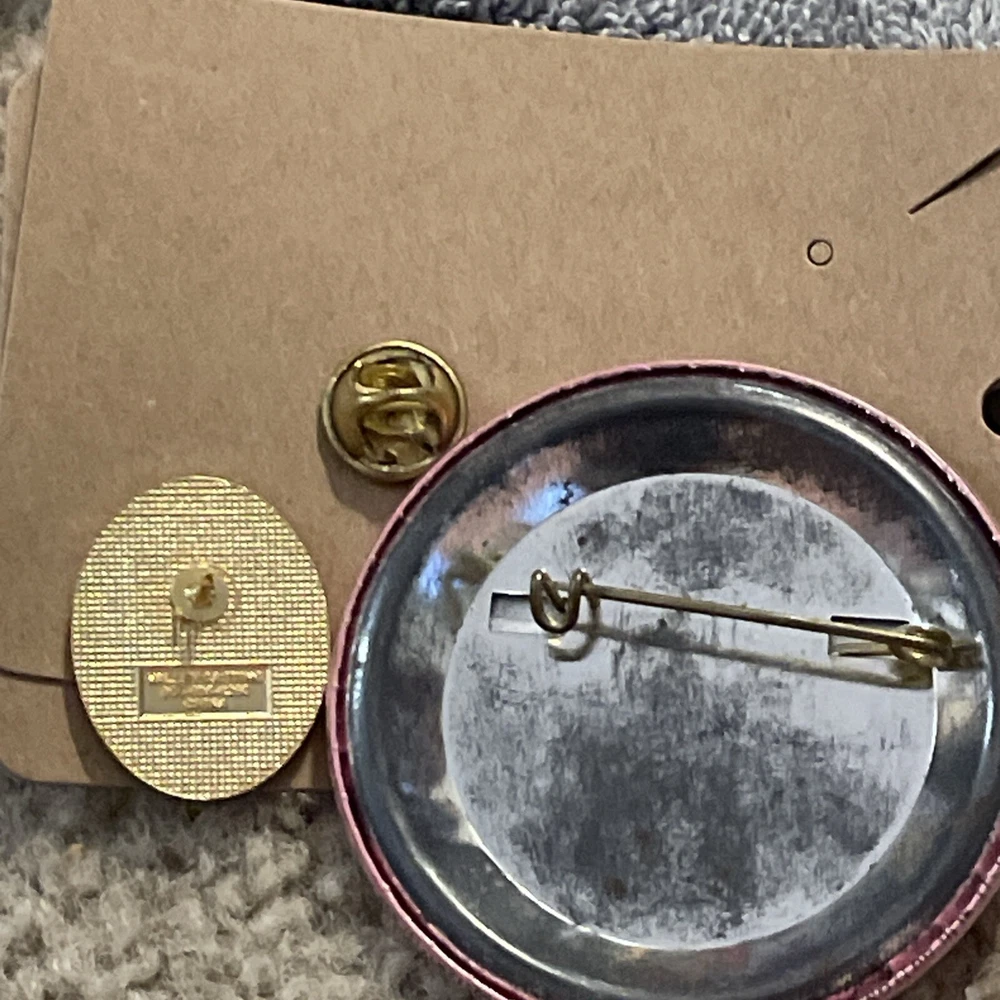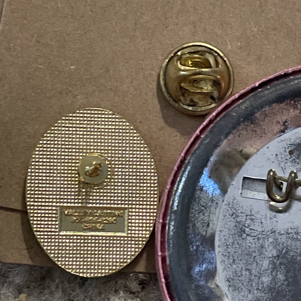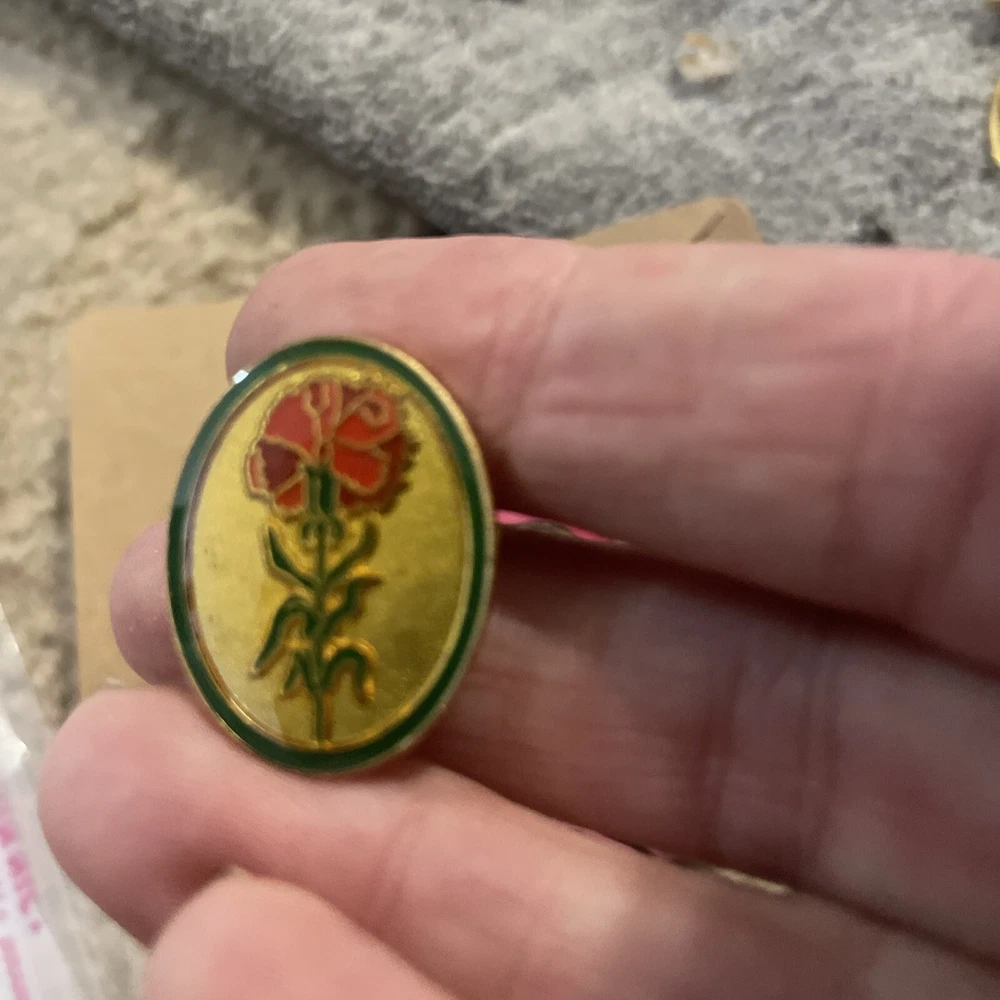 This elegant pin is the perfect gift for Mother's Day. With a beautiful oval-shaped red flower design, this gold-tone accessory will add a touch of sophistication to any outfit. The flower shape is reminiscent of a carnation, making it a perfect addition to any vintage or antique jewelry collection. Crafted with high-quality materials, this pin is not only stylish but also durable. It can be worn on a lapel, shirt, or even as a brooch. The gold-tone base metal and main stone color make it a versatile accessory that will complement any outfit. Get this unique piece today and show your mother how much you appreciate her. Plus you get the button that says happy Mother’s Day. I love you both from the 70s.