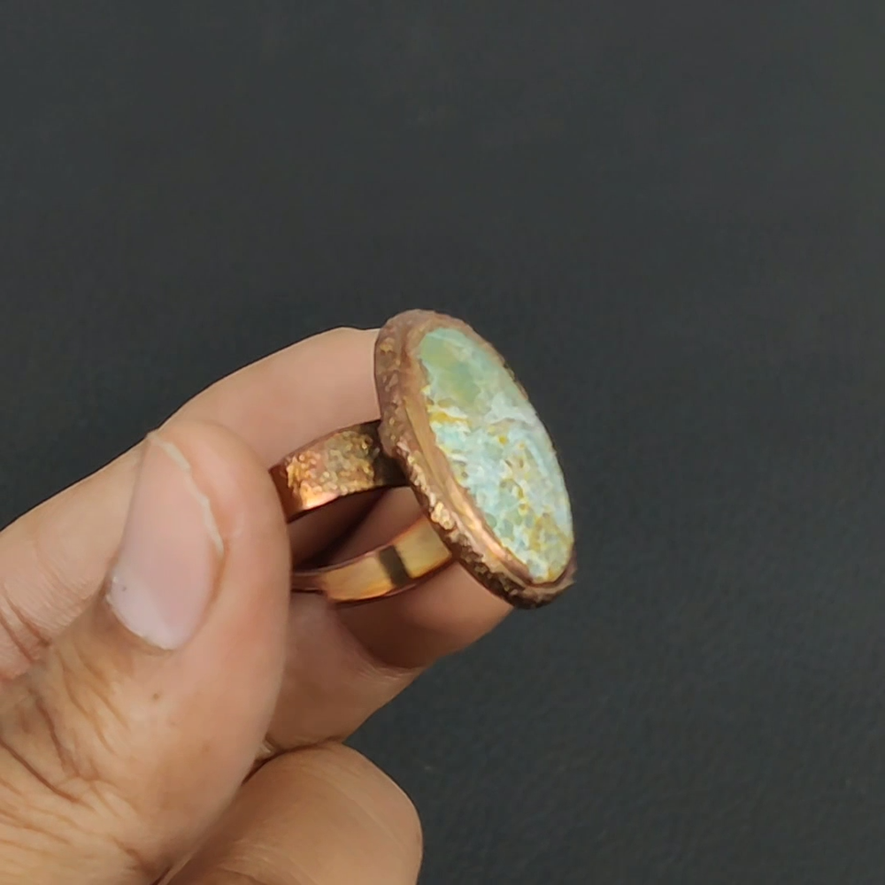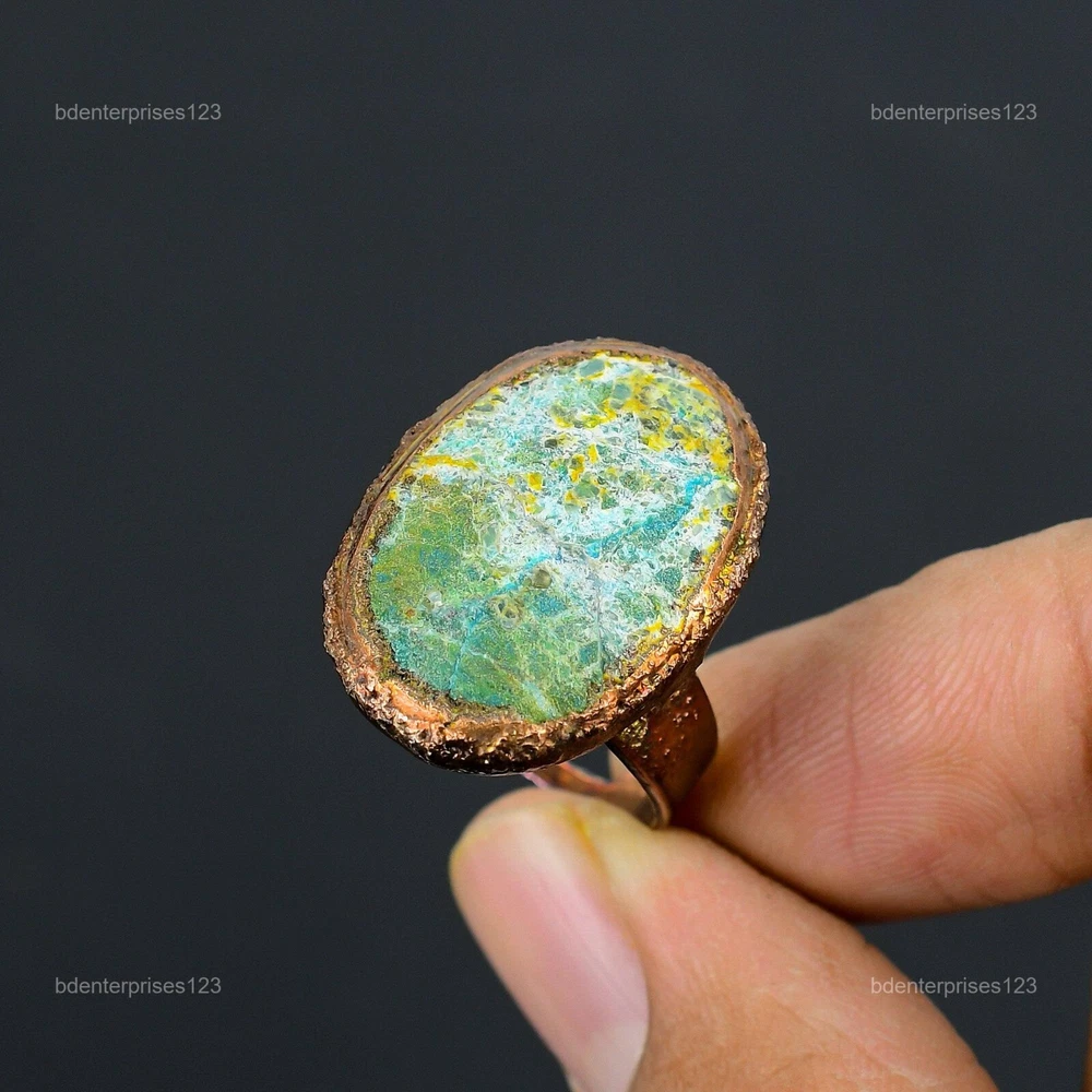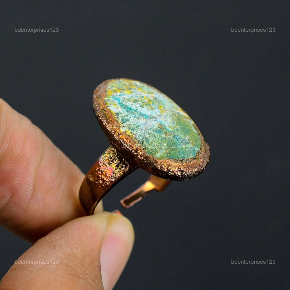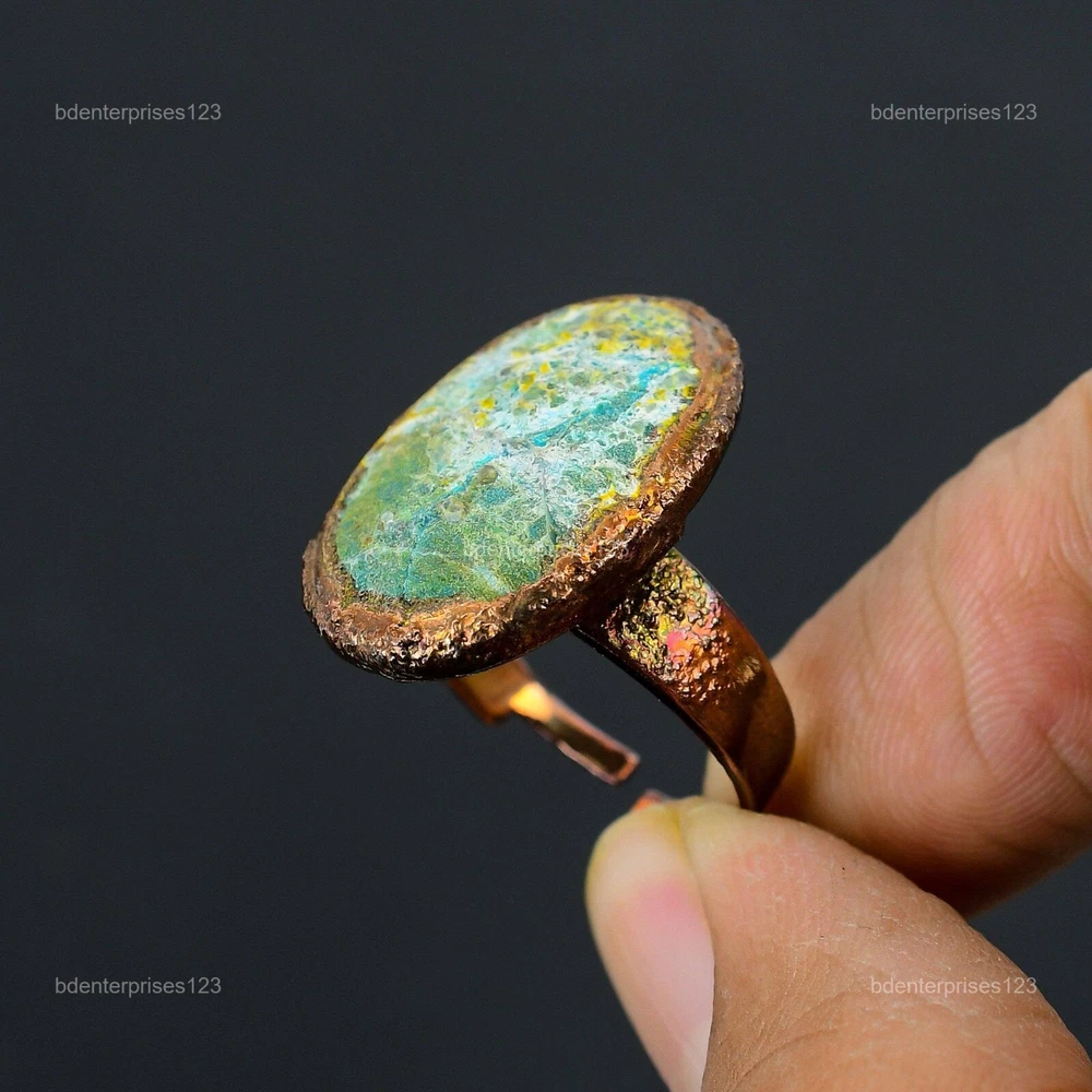 Welcome to bdenterprises123 Mothers day Deal Copper Chrysocolla Rough Gemstone Wedding Electroformed Ring Handmade Ring, Wire Wrapped Ring, Wire Wrapped Jewelry, Copper Pendant, Copper Wire Ring, Wrapped Jewelry, Wire Wrap Ring, Wire Wrap Jewelry SKU : HZR-76 Gemstone : Chrysocolla Rough Stone Shape : Oval Metal Purity : Unknown Copper Ring Size : Adjustable US Adjustable : Yes Copper has been used for jewelry making for thousands of years, dating back to ancient civilizations such as the Egyptians, Romans, and Aztecs. Copper was valued for its beauty, versatility, and durability, and was often used to make everything from jewelry and coins to cookware and tools. In addition to its historical significance, copper jewelry also offers several benefits. Copper is a natural conductor of heat and electricity, which makes it ideal for energy healing and therapeutic purposes. Wearing copper jewelry is believed to have various health benefits, such as improving circulation, reducing inflammation, and boosting the immune system. Some people also believe that copper jewelry has the ability to balance energy and improve mood. For Mother's Day Gift For Father's Day Gift For Promise For Valentine's Day For Halloween Party For Christmas Day Gift For New Year Party For Mom For Her If you can't find the information you need or need some advice for your design? Feel free to contact us. We are fast to reply :) All our work is made by hand with Love and Care in our workshop Thank you so much for visiting and hope you enjoy shopping with us bdenterprises123 is committed to delivering the best quality sterling silver jewelry to customers. As a handmade jewelry manufacturer, we offer an extensive selection of copper gemstone jewelry that showcases the brilliance of our craftsmanship. We are an experienced handmade jewelry supplier with expertise in embellishing gemstones to suit every style. We offer you the liberty to create your jewelry ensemble with sparkling, earthy, and pure gemstones. Our Talented artisans masterfully handcraft each piece of jewelry you see here. Our pieces are made with genuine gemstones. The one-of-a-kind piece you see here is the same exact piece you will receive.