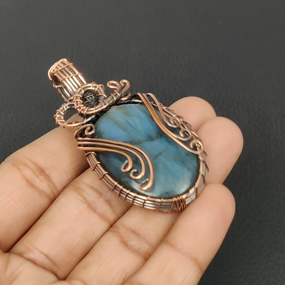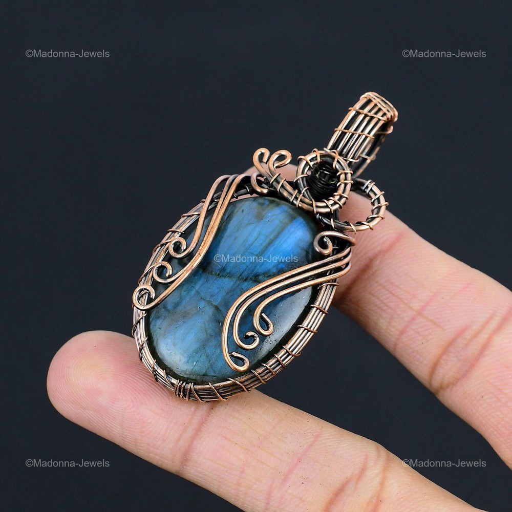 Welcome to Madonna Jewels Mothers day Sale Copper Natural Labradorite Ethnic Sister Wire Wrapped Pendant Handmade Pendant, Wire Wrapped Pendant, Wire Wrapped Jewelry, Copper Pendant, Copper Wire Pendant, Wrapped Jewelry, Wire Wrap Pendant, Wire Wrap Jewelry SKU : BWRP-809 Gemstone : Labradorite Stone Shape : Oval Metal Purity : Unknown Copper Length : 64 Millimeters Width : 32 Millimeters Copper has been used for jewelry making for thousands of years, dating back to ancient civilizations such as the Egyptians, Romans, and Aztecs. Copper was valued for its beauty, versatility, and durability, and was often used to make everything from jewelry and coins to cookware and tools. In addition to its historical significance, copper jewelry also offers several benefits. Copper is a natural conductor of heat and electricity, which makes it ideal for energy healing and therapeutic purposes. Wearing copper jewelry is believed to have various health benefits, such as improving circulation, reducing inflammation, and boosting the immune system. Some people also believe that copper jewelry has the ability to balance energy and improve mood. For Mother's Day Gift For Father's Day Gift For Promise For Valentine's Day For Halloween Party For Christmas Day Gift For New Year Party For Mom For Her If you can't find the information you need or need some advice for your design? Feel free to contact us. We are fast to reply :) All our work is made by hand with Love and Care in our workshop Thank you so much for visiting and hope you enjoy shopping with us MadonnaJewels is committed to delivering the best quality sterling silver jewelry to customers. As a handmade jewelry manufacturer, we offer an extensive selection of copper gemstone jewelry that showcases the brilliance of our craftsmanship. We are an experienced handmade jewelry supplier with expertise in embellishing gemstones to suit every style. We offer you the liberty to create your jewelry ensemble with sparkling, earthy, and pure gemstones. Our Talented artisans masterfully handcraft each piece of jewelry you see here. Our pieces are made with genuine gemstones. The one-of-a-kind piece you see here is the same exact piece you will receive.