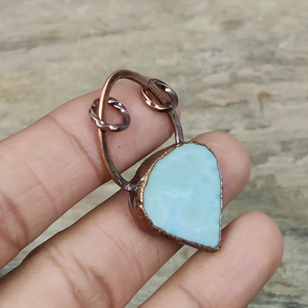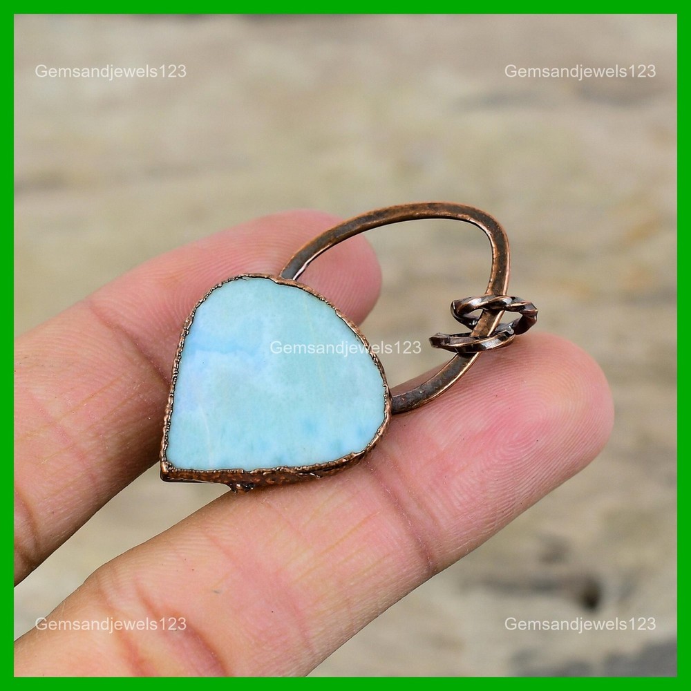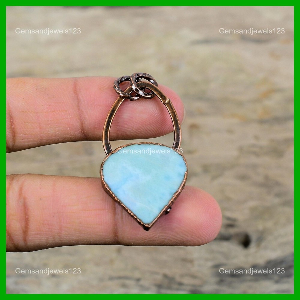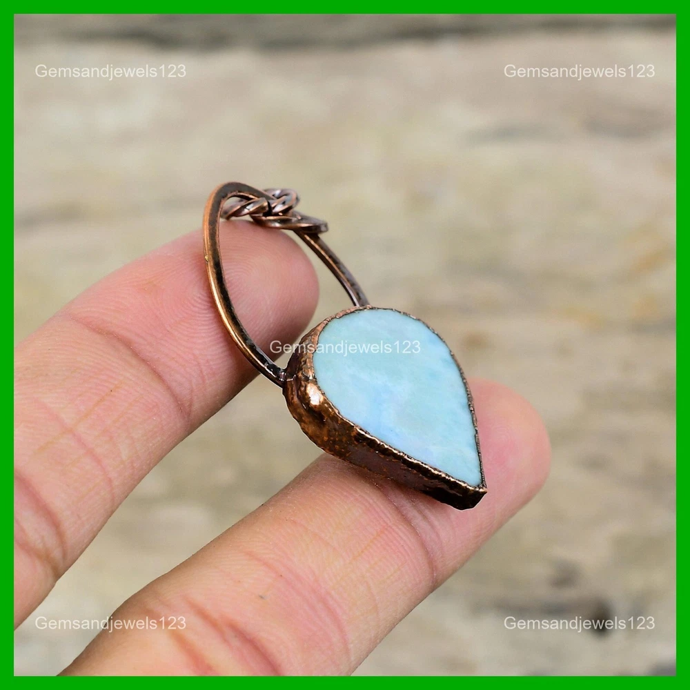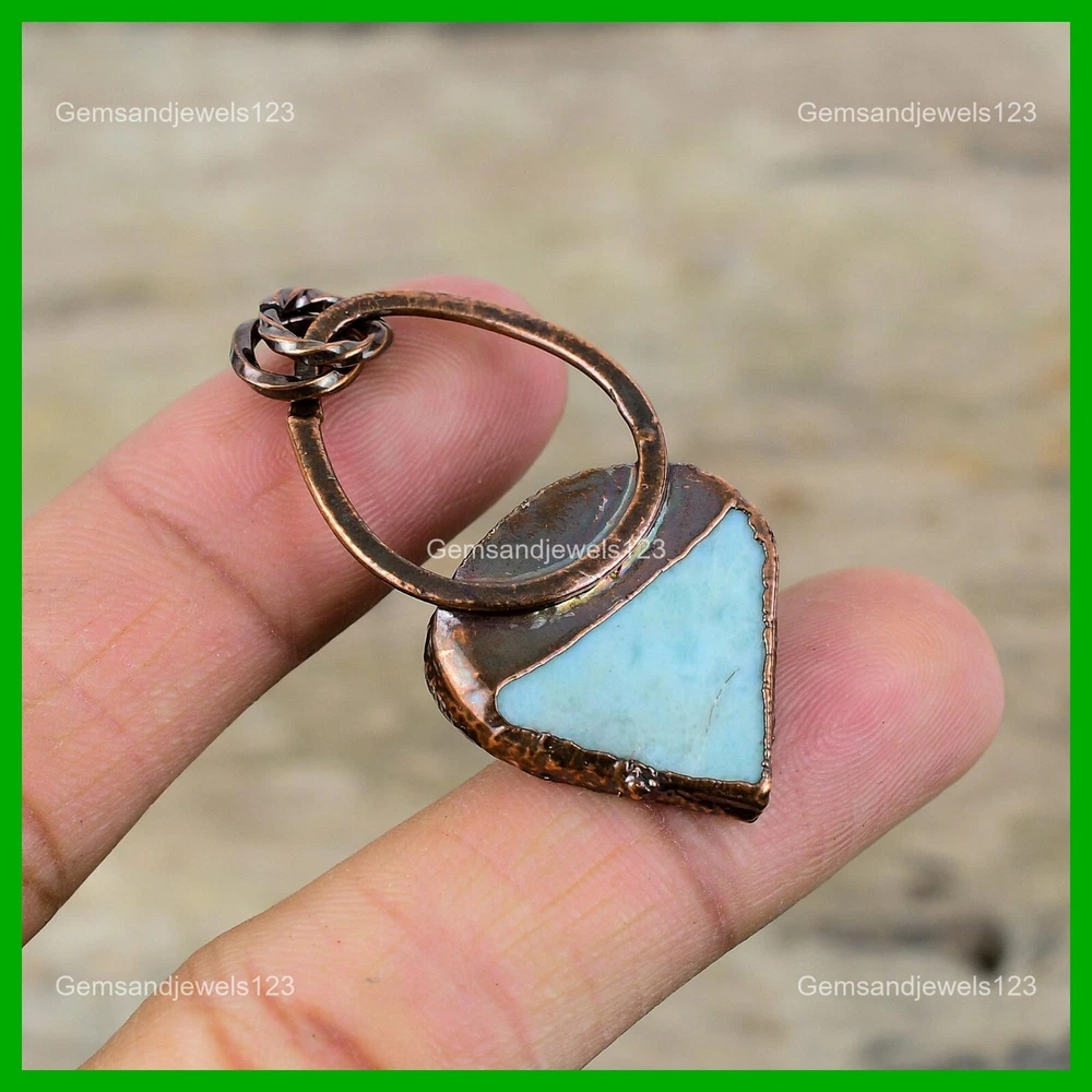 Note : Due to the natural formation of this gemstone. Slight Variation in design and color are to be expected. Welcome to gemsandjewels123 Mothers day Deal Copper Larimar Stone Electroformed Bezel New Pendant Jewelry Handmade Pendant, Wire Wrapped Pendant, Wire Wrapped Jewelry, Copper Pendant, Copper Wire Pendant, Wrapped Jewelry, Wire Wrap Pendant, Wire Wrap Jewelry SKU : VZP-29 Gemstone : Larimar Stone Shape : Pear Metal Purity : Unknown Copper Length : 52 Millimeters Width : 25 Millimeters Copper has been used for jewelry making for thousands of years, dating back to ancient civilizations such as the Egyptians, Romans, and Aztecs. Copper was valued for its beauty, versatility, and durability, and was often used to make everything from jewelry and coins to cookware and tools. In addition to its historical significance, copper jewelry also offers several benefits. Copper is a natural conductor of heat and electricity, which makes it ideal for energy healing and therapeutic purposes. Wearing copper jewelry is believed to have various health benefits, such as improving circulation, reducing inflammation, and boosting the immune system. Some people also believe that copper jewelry has the ability to balance energy and improve mood. For Mother's Day Gift For Father's Day Gift For Promise For Valentine's Day For Halloween Party For Christmas Day Gift For New Year Party For Mom For Her If you can't find the information you need or need some advice for your design? Feel free to contact us. We are fast to reply :) All our work is made by hand with Love and Care in our workshop Thank you so much for visiting and hope you enjoy shopping with us gemsandjewels123 is committed to delivering the best quality sterling silver jewelry to customers. As a handmade jewelry manufacturer, we offer an extensive selection of copper gemstone jewelry that showcases the brilliance of our craftsmanship. We are an experienced handmade jewelry supplier with expertise in embellishing gemstones to suit every style. We offer you the liberty to create your jewelry ensemble with sparkling, earthy, and pure gemstones. Our Talented artisans masterfully handcraft each piece of jewelry you see here. Our pieces are made with genuine gemstones. The one-of-a-kind piece you see here is the same exact piece you will receive.