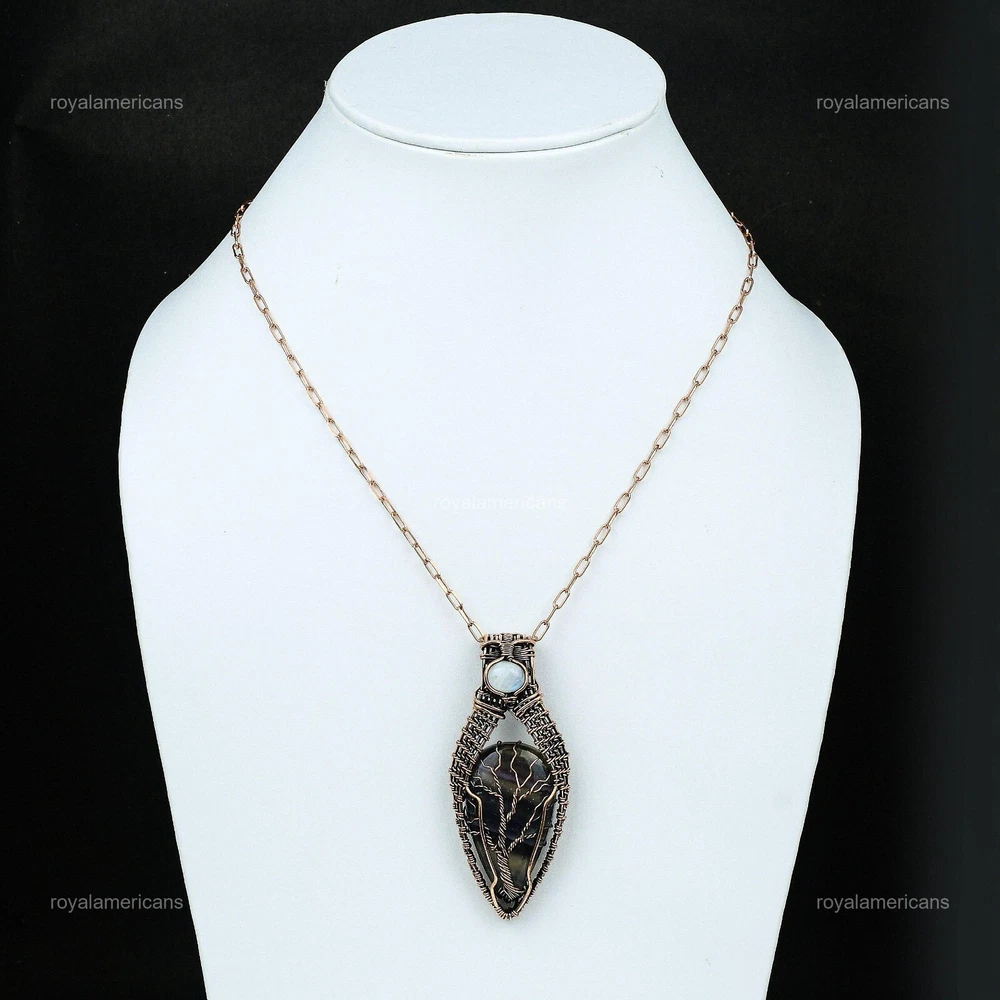 Note : Due to the natural formation of this gemstone. Slight variation in design and color are to be expected. Welcome to Royalamericans Mothers day Deal Copper Multi Fluorite Stone Rainbow Moonstone Birthday Pendant Handmade Pendant, Wire Wrapped Pendant, Wire Wrapped Jewelry, Copper Pendant, Copper Wire Pendant, Wrapped Jewelry, Wire Wrap Pendant, Wire Wrap Jewelry SKU : UWP-113 Gemstone : Multi Fluorite Stone Shape : Pear Metal Purity : Unknown Copper Length : 75 Millimeters Width : 30 Millimeters Copper has been used for jewelry making for thousands of years, dating back to ancient civilizations such as the Egyptians, Romans, and Aztecs. Copper was valued for its beauty, versatility, and durability, and was often used to make everything from jewelry and coins to cookware and tools. In addition to its historical significance, copper jewelry also offers several benefits. Copper is a natural conductor of heat and electricity, which makes it ideal for energy healing and therapeutic purposes. Wearing copper jewelry is believed to have various health benefits, such as improving circulation, reducing inflammation, and boosting the immune system. Some people also believe that copper jewelry has the ability to balance energy and improve mood. For Mother's Day Gift For Father's Day Gift For Promise For Valentine's Day For Halloween Party For Christmas Day Gift For New Year Party For Mom For Her If you can't find the information you need or need some advice for your design? Feel free to contact us. We are fast to reply :) All our work is made by hand with Love and Care in our workshop Thank you so much for visiting and hope you enjoy shopping with us Royalamericans is committed to delivering the best quality sterling silver jewelry to customers. As a handmade jewelry manufacturer, we offer an extensive selection of copper gemstone jewelry that showcases the brilliance of our craftsmanship. We are an experienced handmade jewelry supplier with expertise in embellishing gemstones to suit every style. We offer you the liberty to create your jewelry ensemble with sparkling, earthy, and pure gemstones. Our Talented artisans masterfully handcraft each piece of jewelry you see here. Our pieces are made with genuine gemstones.