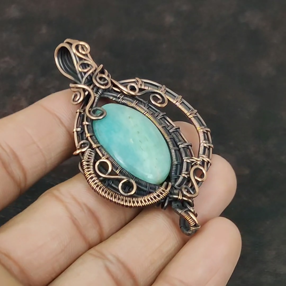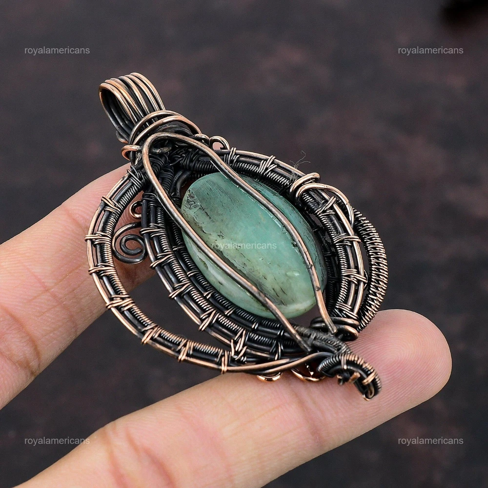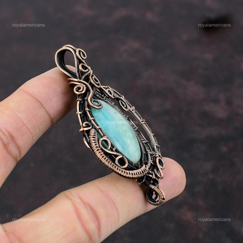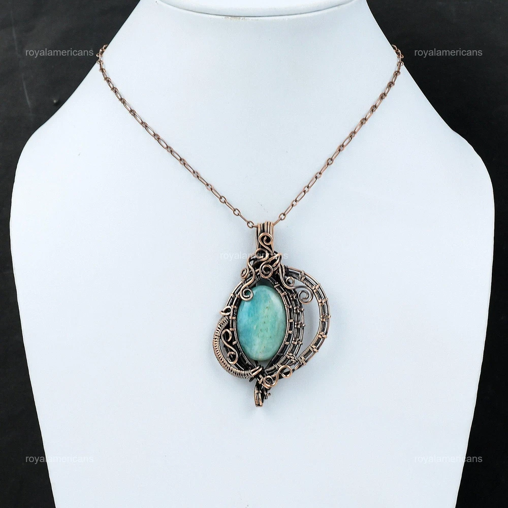 Note : Due to the natural formation of this gemstone. Slight variation in design and color are to be expected. Welcome to Royalamericans Mothers day Sale Copper Oval Amazonite Stone Confirmation/Communion Wife Pendant Handmade Pendant, Wire Wrapped Pendant, Wire Wrapped Jewelry, Copper Pendant, Copper Wire Pendant, Wrapped Jewelry, Wire Wrap Pendant, Wire Wrap Jewelry SKU : UFWP-1216 Gemstone : Amazonite Stone Shape : Oval Metal Purity : Unknown Copper Length : 75 Millimeters Width : 51 Millimeters Copper has been used for jewelry making for thousands of years, dating back to ancient civilizations such as the Egyptians, Romans, and Aztecs. Copper was valued for its beauty, versatility, and durability, and was often used to make everything from jewelry and coins to cookware and tools. In addition to its historical significance, copper jewelry also offers several benefits. Copper is a natural conductor of heat and electricity, which makes it ideal for energy healing and therapeutic purposes. Wearing copper jewelry is believed to have various health benefits, such as improving circulation, reducing inflammation, and boosting the immune system. Some people also believe that copper jewelry has the ability to balance energy and improve mood. For Mother's Day Gift For Father's Day Gift For Promise For Valentine's Day For Halloween Party For Christmas Day Gift For New Year Party For Mom For Her If you can't find the information you need or need some advice for your design? Feel free to contact us. We are fast to reply :) All our work is made by hand with Love and Care in our workshop Thank you so much for visiting and hope you enjoy shopping with us Royalamericans is committed to delivering the best quality sterling silver jewelry to customers. As a handmade jewelry manufacturer, we offer an extensive selection of copper gemstone jewelry that showcases the brilliance of our craftsmanship. We are an experienced handmade jewelry supplier with expertise in embellishing gemstones to suit every style. We offer you the liberty to create your jewelry ensemble with sparkling, earthy, and pure gemstones. Our Talented artisans masterfully handcraft each piece of jewelry you see here. Our pieces are made with genuine gemstones.