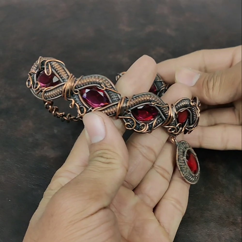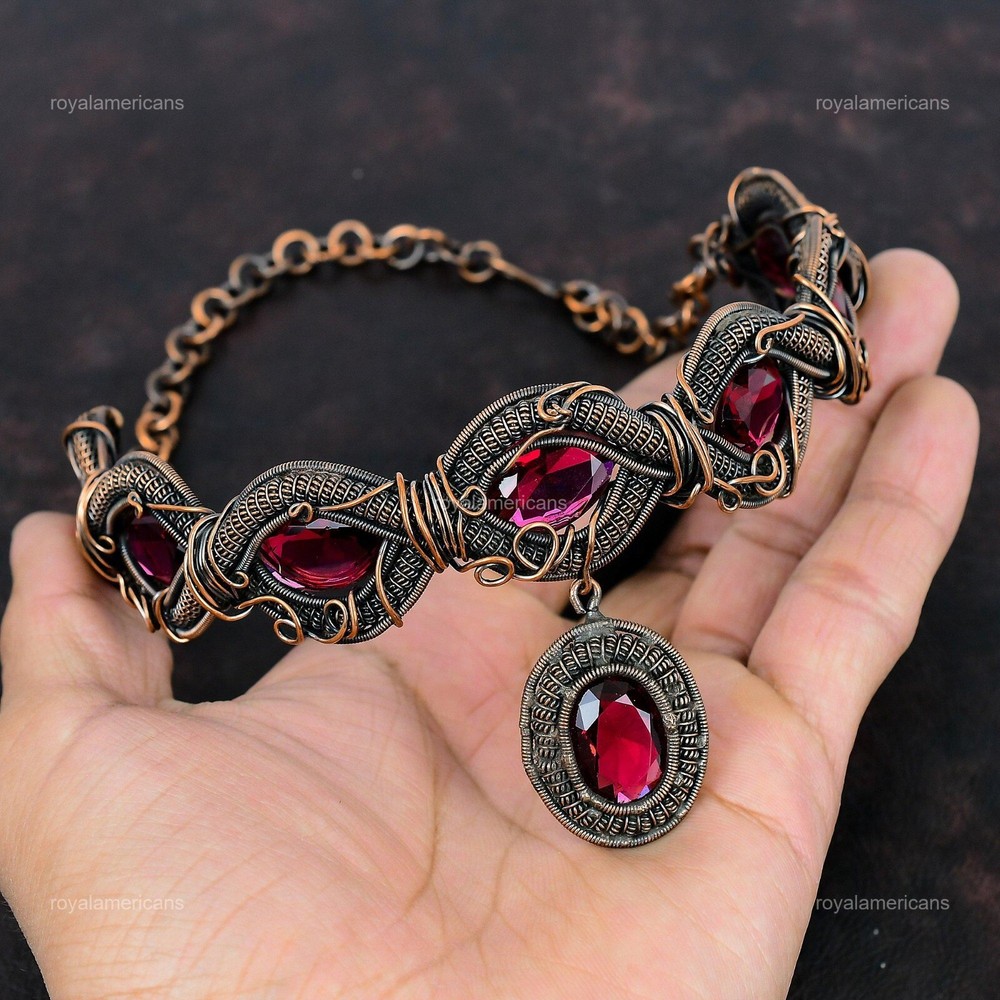 Note : Due to the natural formation of this gemstone. Slight variation in design and color are to be expected. Welcome to Royalamericans Mothers day Sale Copper Oval Rubellite Stone Wife Chain Wedding Necklace Jewelry Handmade Necklace, Wire Wrapped Necklace, Wire Wrapped Jewelry, Copper Pendant, Copper Wire Necklace, Wrapped Jewelry, Wire Wrap Necklace, Wire Wrap Jewelry SKU : UFWN-328 Gemstone : Rubellite Stone Shape : Oval Metal Purity : Unknown Copper Length : 18 Inches Width : Inches Copper has been used for jewelry making for thousands of years, dating back to ancient civilizations such as the Egyptians, Romans, and Aztecs. Copper was valued for its beauty, versatility, and durability, and was often used to make everything from jewelry and coins to cookware and tools. In addition to its historical significance, copper jewelry also offers several benefits. Copper is a natural conductor of heat and electricity, which makes it ideal for energy healing and therapeutic purposes. Wearing copper jewelry is believed to have various health benefits, such as improving circulation, reducing inflammation, and boosting the immune system. Some people also believe that copper jewelry has the ability to balance energy and improve mood. For Mother's Day Gift For Father's Day Gift For Promise For Valentine's Day For Halloween Party For Christmas Day Gift For New Year Party For Mom For Her If you can't find the information you need or need some advice for your design? Feel free to contact us. We are fast to reply :) All our work is made by hand with Love and Care in our workshop Thank you so much for visiting and hope you enjoy shopping with us Royalamericans is committed to delivering the best quality sterling silver jewelry to customers. As a handmade jewelry manufacturer, we offer an extensive selection of copper gemstone jewelry that showcases the brilliance of our craftsmanship. We are an experienced handmade jewelry supplier with expertise in embellishing gemstones to suit every style. We offer you the liberty to create your jewelry ensemble with sparkling, earthy, and pure gemstones. Our Talented artisans masterfully handcraft each piece of jewelry you see here. Our pieces are made with genuine gemstones.