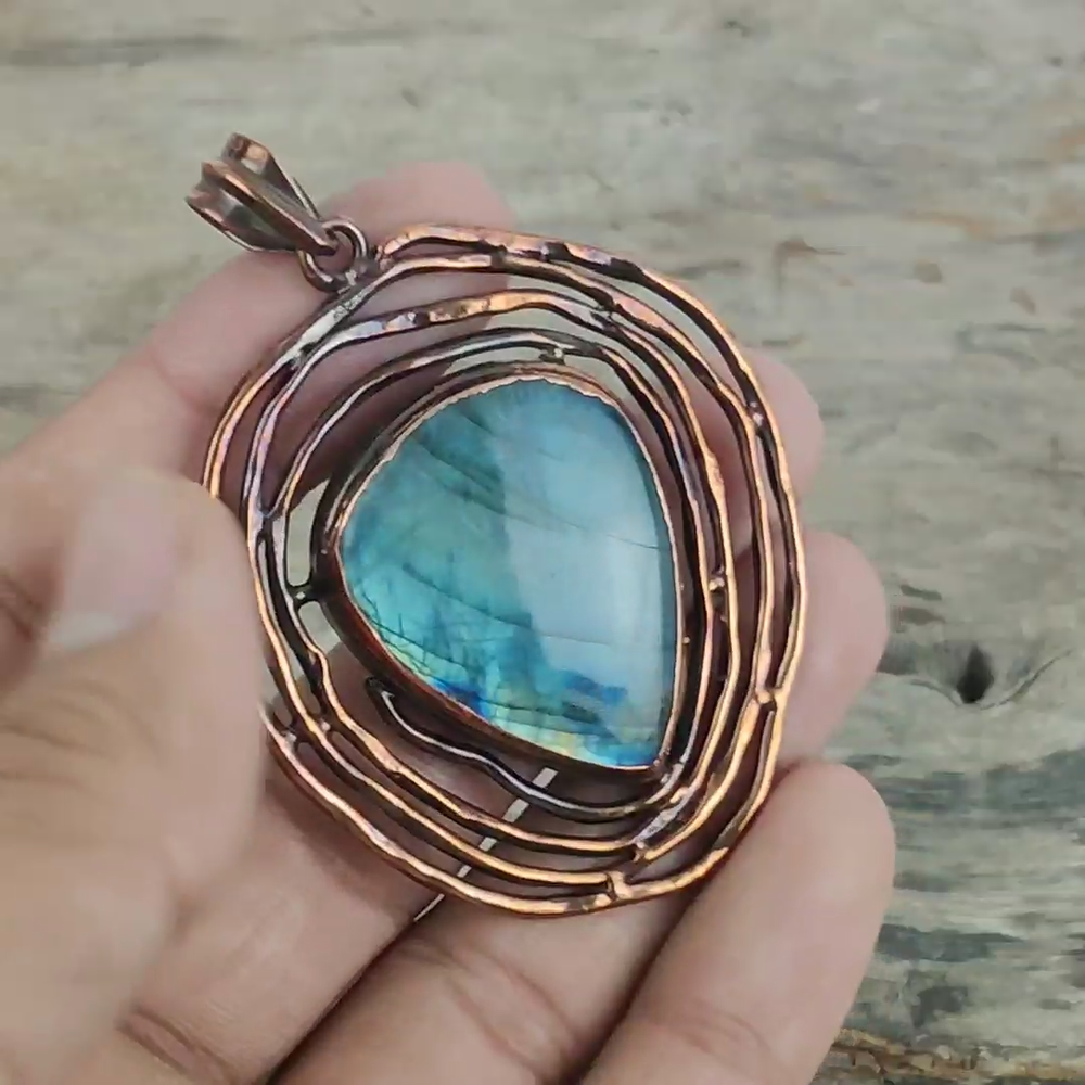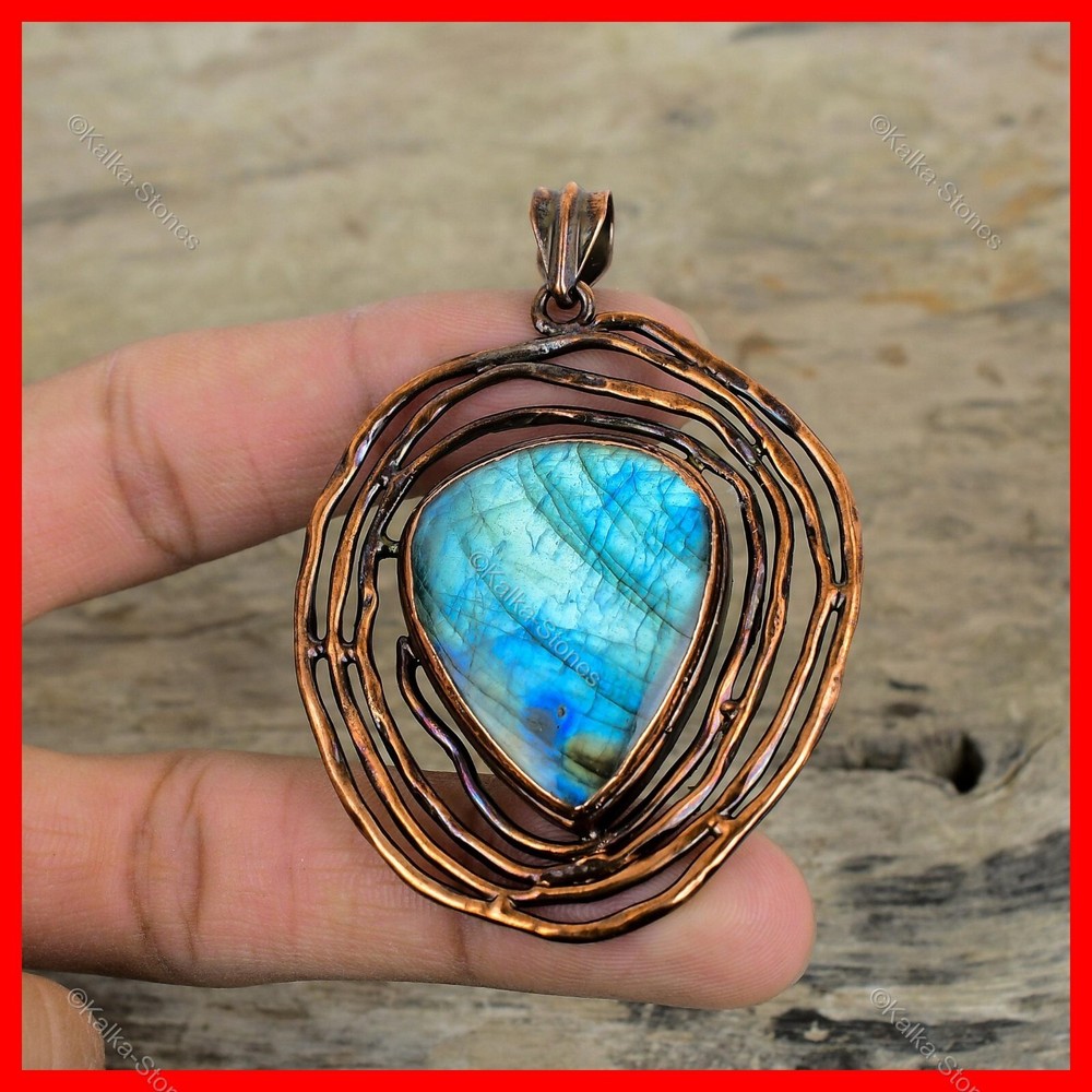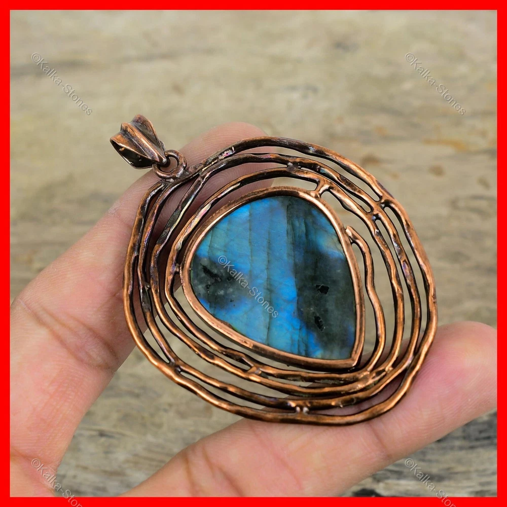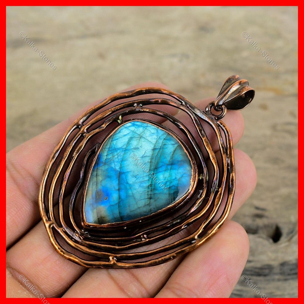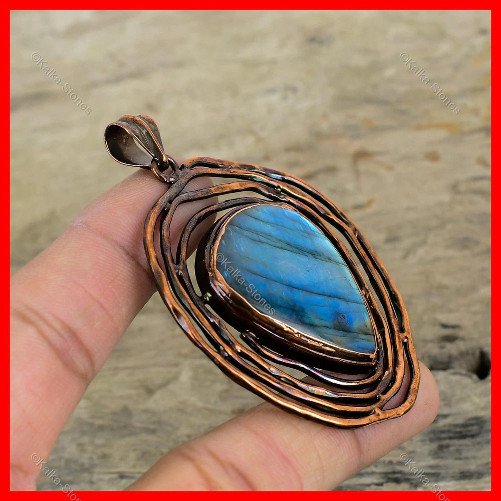 Note : Due to the natural formation of this gemstone. Slight variation in design and color are to be expected. Welcome to Kalka Stones Mothers day Sale Copper Pear Natural Labradorite Electroformed Pendant Jewelry Handmade Pendant, Wire Wrapped Pendant, Wire Wrapped Jewelry, Copper Pendant, Copper Wire Pendant, Wrapped Jewelry, Wire Wrap Pendant, Wire Wrap Jewelry SKU : VZP-114 Gemstone : Labradorite Stone Shape : Pear Metal Purity : Unknown Copper Length : 74 Millimeters Width : 54 Millimeters Copper has been used for jewelry making for thousands of years, dating back to ancient civilizations such as the Egyptians, Romans, and Aztecs. Copper was valued for its beauty, versatility, and durability, and was often used to make everything from jewelry and coins to cookware and tools. In addition to its historical significance, copper jewelry also offers several benefits. Copper is a natural conductor of heat and electricity, which makes it ideal for energy healing and therapeutic purposes. Wearing copper jewelry is believed to have various health benefits, such as improving circulation, reducing inflammation, and boosting the immune system. Some people also believe that copper jewelry has the ability to balance energy and improve mood. For Mother's Day Gift For Father's Day Gift For Promise For Valentine's Day For Halloween Party For Christmas Day Gift For New Year Party For Mom For Her If you can't find the information you need or need some advice for your design? Feel free to contact us. We are fast to reply :) All our work is made by hand with Love and Care in our workshop Thank you so much for visiting and hope you enjoy shopping with us Kalka Stones is committed to delivering the best quality jewelry to customers. As a handmade jewelry manufacturer, we offer an extensive selection of copper gemstone jewelry that showcases the brilliance of our craftsmanship. We are an experienced handmade jewelry supplier with expertise in embellishing gemstones to suit every style. We offer you the liberty to create your jewelry ensemble with sparkling, earthy, and pure gemstones. Our Talented artisans masterfully handcraft each piece of jewelry you see here. Our pieces are made with genuine gemstones.