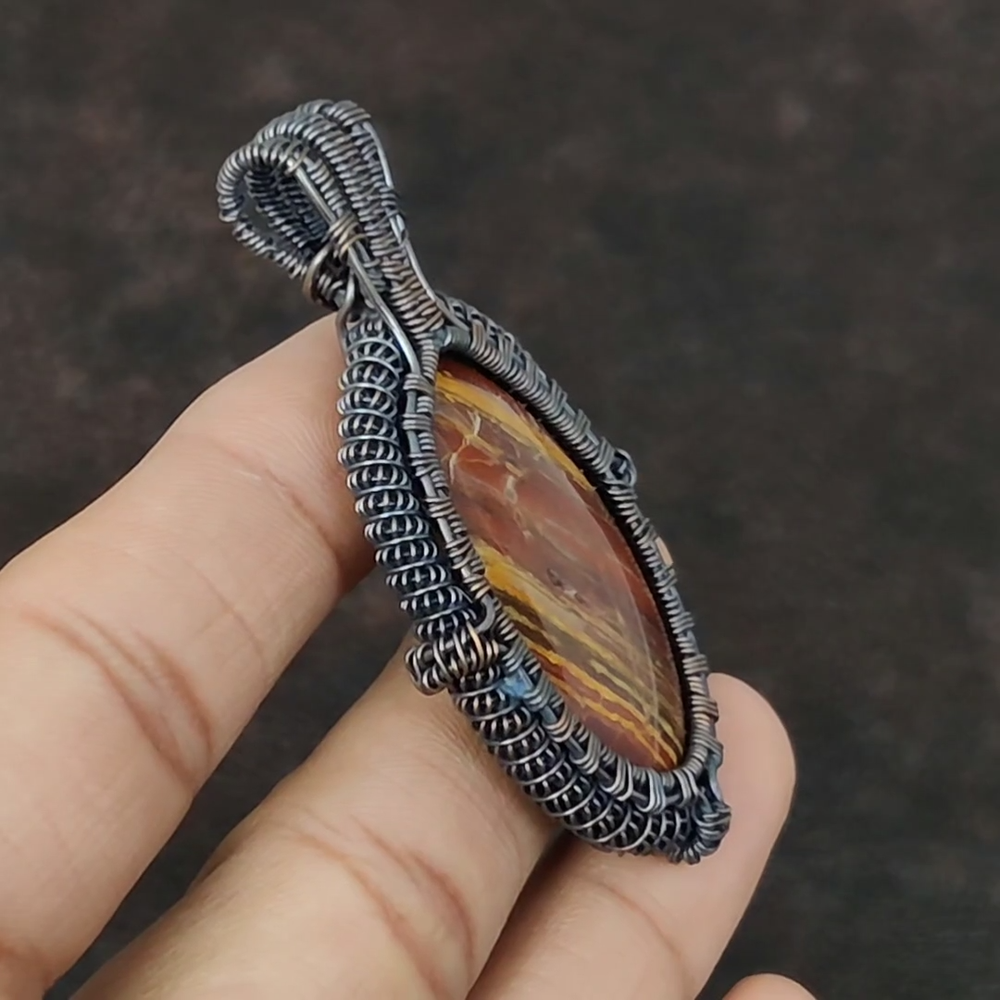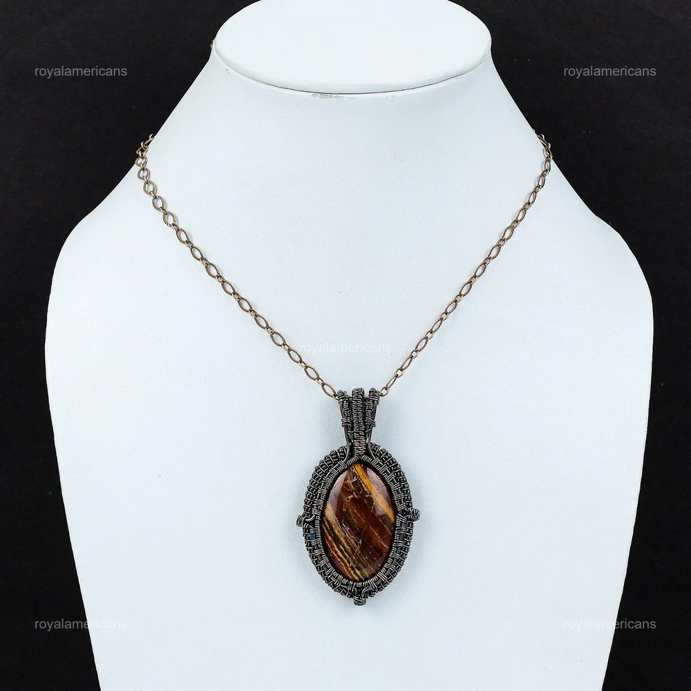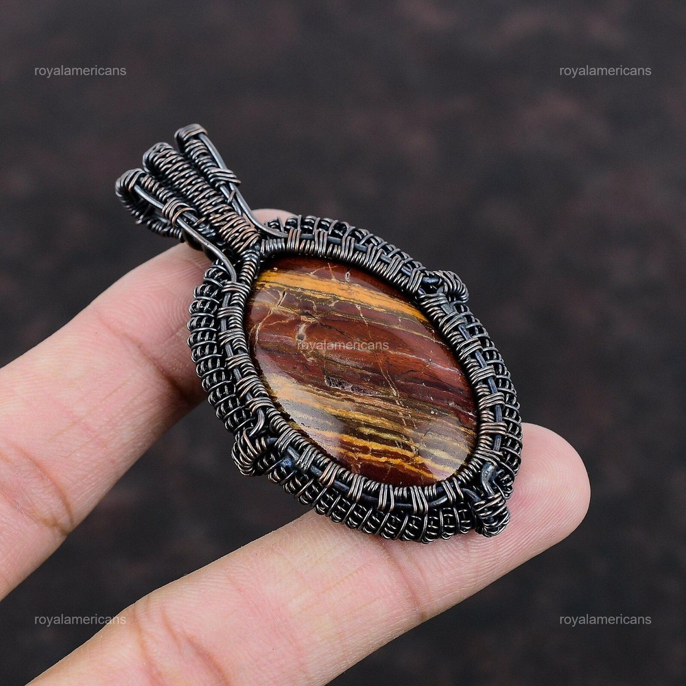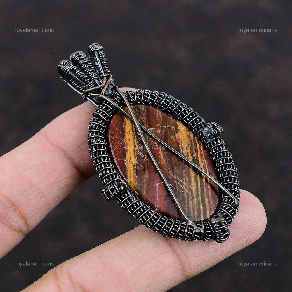 Note : Due to the natural formation of this gemstone. Slight variation in design and color are to be expected. Welcome to Royalamericans Mothers day Deal Copper Red Snakeskin Jasper Gemstone Engagement Wedding Pendant Handmade Pendant, Wire Wrapped Pendant, Wire Wrapped Jewelry, Copper Pendant, Copper Wire Pendant, Wrapped Jewelry, Wire Wrap Pendant, Wire Wrap Jewelry SKU : UFWP-2797 Gemstone : Red Snakeskin Jasper Stone Shape : Oval Metal Purity : Unknown Copper Length : 67 Millimeters Width : 40 Millimeters Copper has been used for jewelry making for thousands of years, dating back to ancient civilizations such as the Egyptians, Romans, and Aztecs. Copper was valued for its beauty, versatility, and durability, and was often used to make everything from jewelry and coins to cookware and tools. In addition to its historical significance, copper jewelry also offers several benefits. Copper is a natural conductor of heat and electricity, which makes it ideal for energy healing and therapeutic purposes. Wearing copper jewelry is believed to have various health benefits, such as improving circulation, reducing inflammation, and boosting the immune system. Some people also believe that copper jewelry has the ability to balance energy and improve mood. For Mother's Day Gift For Father's Day Gift For Promise For Valentine's Day For Halloween Party For Christmas Day Gift For New Year Party For Mom For Her If you can't find the information you need or need some advice for your design? Feel free to contact us. We are fast to reply :) All our work is made by hand with Love and Care in our workshop Thank you so much for visiting and hope you enjoy shopping with us Royalamericans is committed to delivering the best quality sterling silver jewelry to customers. As a handmade jewelry manufacturer, we offer an extensive selection of copper gemstone jewelry that showcases the brilliance of our craftsmanship. We are an experienced handmade jewelry supplier with expertise in embellishing gemstones to suit every style. We offer you the liberty to create your jewelry ensemble with sparkling, earthy, and pure gemstones. Our Talented artisans masterfully handcraft each piece of jewelry you see here. Our pieces are made with genuine gemstones.