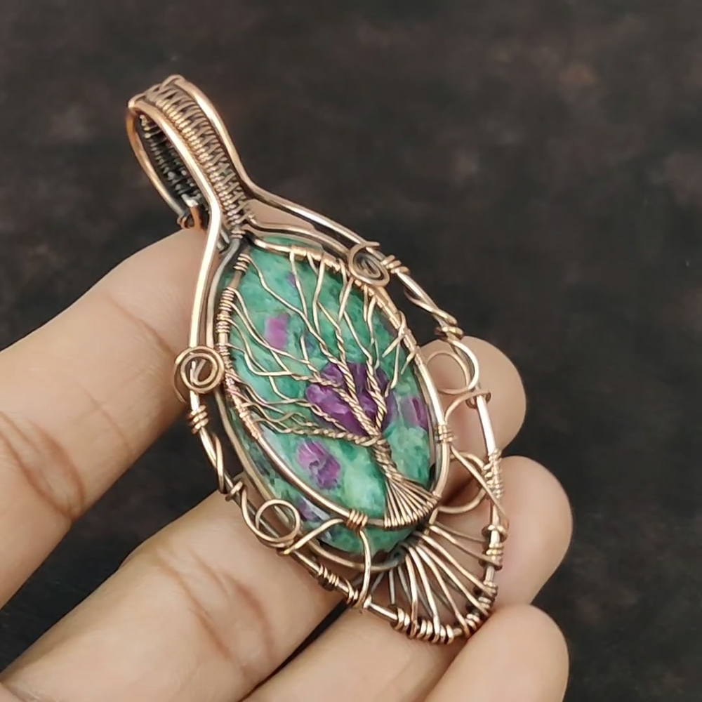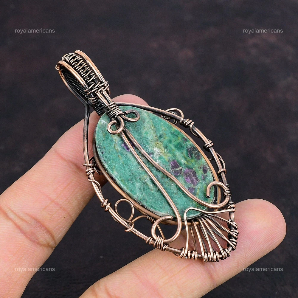 Note : Due to the natural formation of this gemstone. Slight variation in design and color are to be expected. Welcome to Royalamericans Mothers day Sale Copper Ruby Fuchsite Gemstone Wife Tree Of Life Pendant Jewelry Handmade Pendant, Wire Wrapped Pendant, Wire Wrapped Jewelry, Copper Pendant, Copper Wire Pendant, Wrapped Jewelry, Wire Wrap Pendant, Wire Wrap Jewelry SKU : UFWP-931 Gemstone : Ruby Fuchsite Stone Shape : Oval Metal Purity : Unknown Copper Length : 78 Millimeters Width : 40 Millimeters Copper has been used for jewelry making for thousands of years, dating back to ancient civilizations such as the Egyptians, Romans, and Aztecs. Copper was valued for its beauty, versatility, and durability, and was often used to make everything from jewelry and coins to cookware and tools. In addition to its historical significance, copper jewelry also offers several benefits. Copper is a natural conductor of heat and electricity, which makes it ideal for energy healing and therapeutic purposes. Wearing copper jewelry is believed to have various health benefits, such as improving circulation, reducing inflammation, and boosting the immune system. Some people also believe that copper jewelry has the ability to balance energy and improve mood. For Mother's Day Gift For Father's Day Gift For Promise For Valentine's Day For Halloween Party For Christmas Day Gift For New Year Party For Mom For Her If you can't find the information you need or need some advice for your design? Feel free to contact us. We are fast to reply :) All our work is made by hand with Love and Care in our workshop Thank you so much for visiting and hope you enjoy shopping with us Royalamericans is committed to delivering the best quality sterling silver jewelry to customers. As a handmade jewelry manufacturer, we offer an extensive selection of copper gemstone jewelry that showcases the brilliance of our craftsmanship. We are an experienced handmade jewelry supplier with expertise in embellishing gemstones to suit every style. We offer you the liberty to create your jewelry ensemble with sparkling, earthy, and pure gemstones. Our Talented artisans masterfully handcraft each piece of jewelry you see here. Our pieces are made with genuine gemstones.