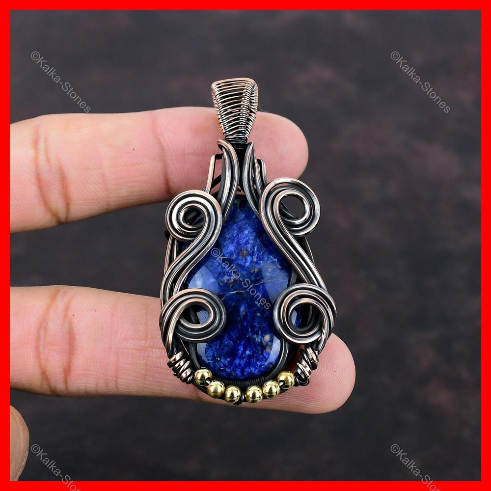 Note : Due to the natural formation of this gemstone. Slight variation in design and color are to be expected. Welcome to Kalka Stones Mothers day Sale Copper Natural Sodalite Wedding New Wire Wrapped Wife Pendant Handmade Pendant, Wire Wrapped Pendant, Wire Wrapped Jewelry, Copper Pendant, Copper Wire Pendant, Wrapped Jewelry, Wire Wrap Pendant, Wire Wrap Jewelry SKU : VFWP-3756 Gemstone : Sodalite Stone Shape : Oval Metal Purity : Unknown Copper Length : 68 Millimeters Width : 34 Millimeters Copper has been used for jewelry making for thousands of years, dating back to ancient civilizations such as the Egyptians, Romans, and Aztecs. Copper was valued for its beauty, versatility, and durability, and was often used to make everything from jewelry and coins to cookware and tools. In addition to its historical significance, copper jewelry also offers several benefits. Copper is a natural conductor of heat and electricity, which makes it ideal for energy healing and therapeutic purposes. Wearing copper jewelry is believed to have various health benefits, such as improving circulation, reducing inflammation, and boosting the immune system. Some people also believe that copper jewelry has the ability to balance energy and improve mood. For Mother's Day Gift For Father's Day Gift For Promise For Valentine's Day For Halloween Party For Christmas Day Gift For New Year Party For Mom For Her If you can't find the information you need or need some advice for your design? Feel free to contact us. We are fast to reply :) All our work is made by hand with Love and Care in our workshop Thank you so much for visiting and hope you enjoy shopping with us Kalka Stones is committed to delivering the best quality jewelry to customers. As a handmade jewelry manufacturer, we offer an extensive selection of copper gemstone jewelry that showcases the brilliance of our craftsmanship. We are an experienced handmade jewelry supplier with expertise in embellishing gemstones to suit every style. We offer you the liberty to create your jewelry ensemble with sparkling, earthy, and pure gemstones. Our Talented artisans masterfully handcraft each piece of jewelry you see here. Our pieces are made with genuine gemstones.