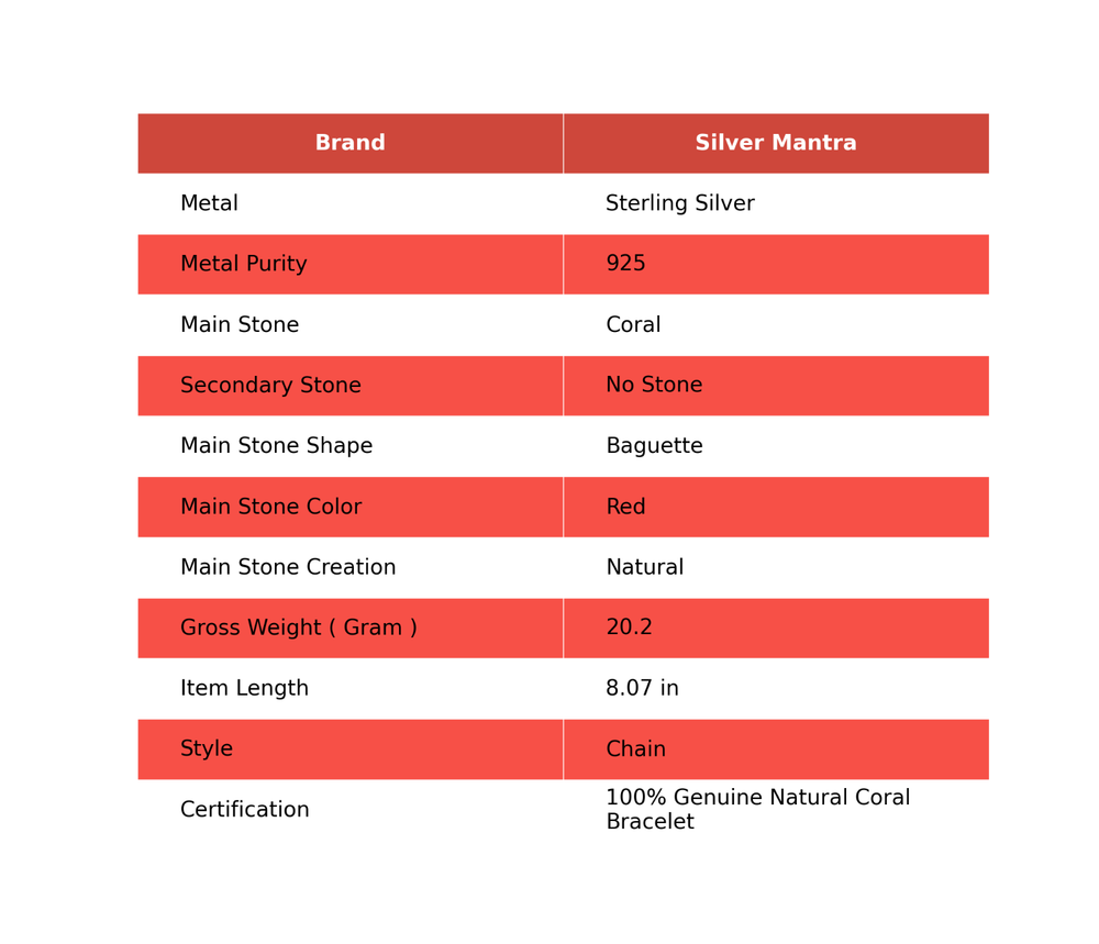 Welcome to Silvermantra2016 Womens day Sale Coral Stone 925 Solid Silver Chain Root Chakra Bezel Bracelet This is a handmade sterling silver bracelet featuring natural coral stones in baguette shape. The bracelet is 8.07 inches long and has a bezel setting. It is nickel-free and engraved, with a unique design perfect for occasions like engagements, weddings, birthdays, and more. The bracelet comes with a seller warranty and certification of 100% genuine natural coral stones. Made in India, this piece exudes beauty, luck, and love with its bohemian and healing vibes. Why silvermantra2016 ? Pure 925 Sterling Silver Jewelry. No alloy and brass nothing. We do not use any type of chemical in our plating process to enhance the shine & luster of the metal which are harmful to your skin. We use high quality stones which gives even better radiance than real gemstones. Customization We offer customization on each product at reasonable price. If you have a design in mind, we can manufacture customized products as well. Gemstone Elegance Choose from a dazzling array of gemstones, including Turquoise, Garnet, Tourmaline, Black Onyx, Tiger Eye, Onyx, Lapis Lazuli, Rainbow Moonstone, Labradorite, Amethyst, Citrine, Cubic Zirconia, Amber, Aquamarine, Rhodochrosite, Amazonite, Aventurine, Azurite, Malachite, Opal, Carnelian, Chalcedony, Chrysoprase, Jasper, Agate, Iolite, Topaz, Larimar, Peridot, Pearl, Prehnite, Ruby, Emerald, Smoky Quartz, Coral, Rutile Quartz and more. Each gemstone boasts unique beauty and energy to enhance your aura. Exquisite Designs Choose from an array of captivating designs, including intricate nature-inspired motifs, timeless classics, and modern interpretations. Our women's gemstone Bracelet cater to your unique style preferences. Diverse Gemstone Selection Explore a vast range of gemstones, each connected to specific birth months and symbolic meanings. Versatile Elegance Whether you're dressing up for a special event or elevating your daily attire, our gemstone Bracelet effortlessly transition from day to night, ensuring you shine in every moment. Value and Quality As proud manufacturers, we prioritize offering premium women's Sterling Silver Bracelet with gemstones at the most affordable prices. Our commitment to value means you can indulge in exceptional jewelry without breaking the bank. ShippingPolicy We do ship worldwide by Registered & Express mail with tracking number. Shipping time takes up to 10 - 14 business days depending on location. All additional payments such as duties & taxes are the buyer's responsibility. We ship only to the approved address that registered in Payoneer. Note: In some cases delay your parcel as per our eBay global shipping partner conveyed us, that shipments may take 25 to 30 days also to reach you due to cross border and customs, delaying clearance of shipments. Note: All Jewelry photos are taken by professional’s photographers. They use many photo equipments, like Flash, Day Light etc. Brightness and contrast are also used in photo editing. So gemstones color can be little dark or light. Handling Time : 2 Business Days Return Policy We Deals in Handmade 925 Sterling Silver Gemstone Jewelry. In any case, if you are not satisfied with the product first, please contact us and we will try to satisfy you by resolving your concern. We only accept returns if product is having any manufacturing defect. If buyer open return request with these reasons like: don't like the item or changed mood, then buyer will have to pay return shipping charges. We didn't accept return of broken piece and stone. If buyer want to return, then return shipping charges will be paid by buyer. Feedback We give immediate positive feedback to our buyers as soon as payment is received in Payoneer. In any case of any problem contact us right away before leaving any Negative or Neutral feedback. We will do our best to resolve any problem and to make you satisfied. Thank you for shopping!