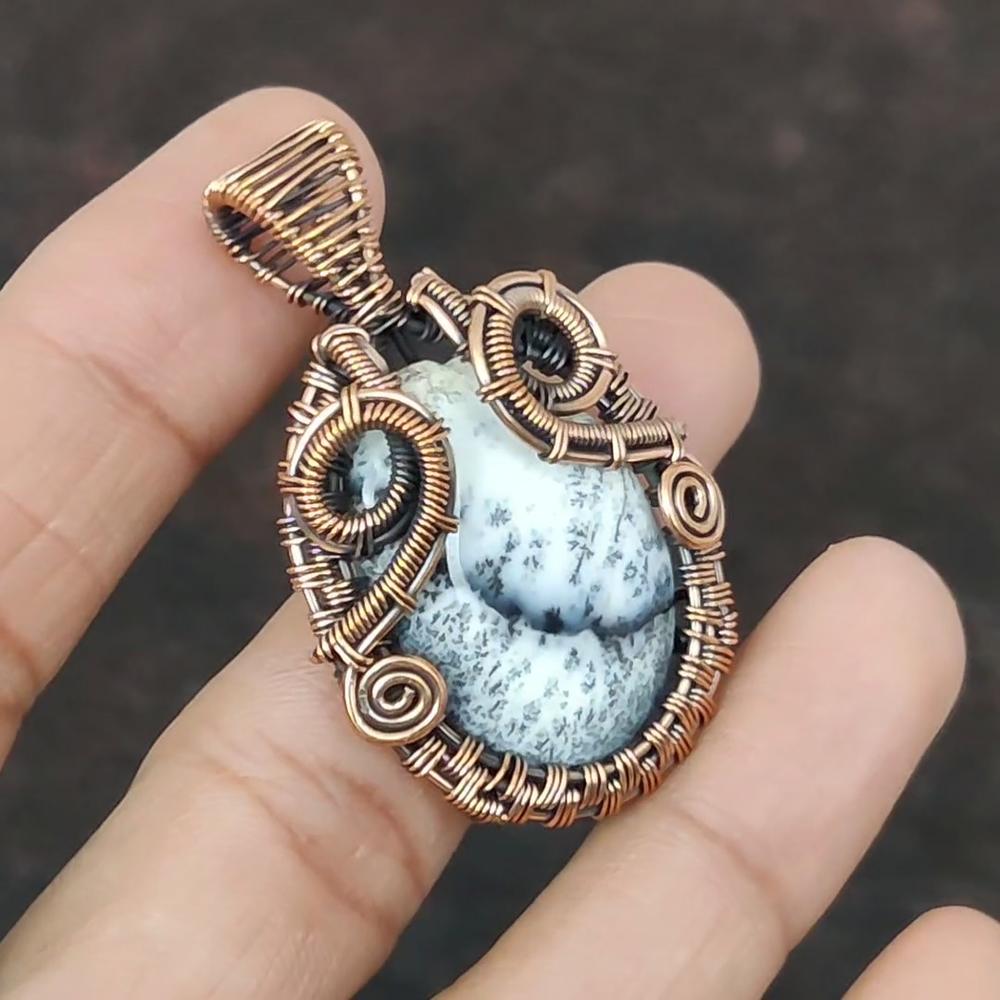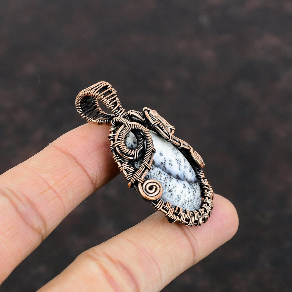 Note : Due to the natural formation of this gemstone. Slight variation in design and color are to be expected. Welcome to Silver Creation Mothers day Deal Natural Dendrite Opal Copper Daughter Boho Wire Wrapped Pendant Handmade Pendant, Wire Wrapped Pendant, Wire Wrapped Jewelry, Copper Pendant, Copper Wire Pendant, Wrapped Jewelry, Wire Wrap Pendant, Wire Wrap Jewelry SKU : VFWP-2874 Stone Shape : Oval Metal Purity : Unknown Copper Length : 54 Millimeters Width : 34 Millimeters Copper has been used for jewelry making for thousands of years, dating back to ancient civilizations such as the Egyptians, Romans, and Aztecs. Copper was valued for its beauty, versatility, and durability, and was often used to make everything from jewelry and coins to cookware and tools. In addition to its historical significance, copper jewelry also offers several benefits. Copper is a natural conductor of heat and electricity, which makes it ideal for energy healing and therapeutic purposes. Wearing copper jewelry is believed to have various health benefits, such as improving circulation, reducing inflammation, and boosting the immune system. Some people also believe that copper jewelry has the ability to balance energy and improve mood. For Mother's Day Gift For Father's Day Gift For Promise For Valentine' Day For Halloween Party For Christmas Day Gift For New Year Party For Mom For Her If you can't find the information you need or need some advice for your design? Feel free to contact us. We are fast to reply :) All our work is made by hand with Love and Care in our workshop Thank you so much for visiting and hope you enjoy shopping with us Silvercreations is committed to delivering the best quality sterling silver jewelry to customers. As a handmade jewelry manufacturer, we offer an extensive selection of copper gemstone jewelry that showcases the brilliance of our craftsmanship. We are an experienced handmade jewelry supplier with expertise in embellishing gemstones to suit every style. We offer you the liberty to create your jewelry ensemble with sparkling, earthy, and pure gemstones. Our Talented artisans masterfully handcraft each piece of jewelry you see here. Our pieces are made with genuine gemstones.