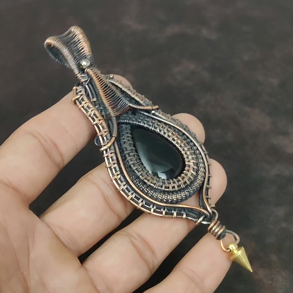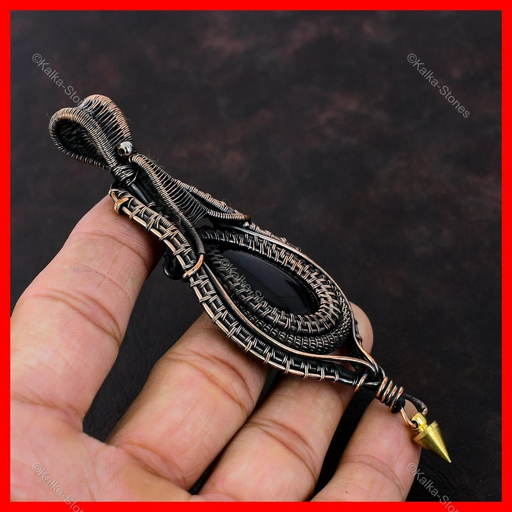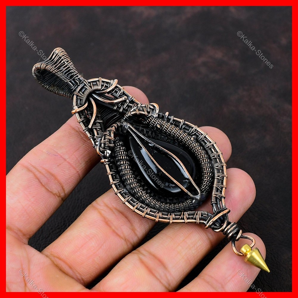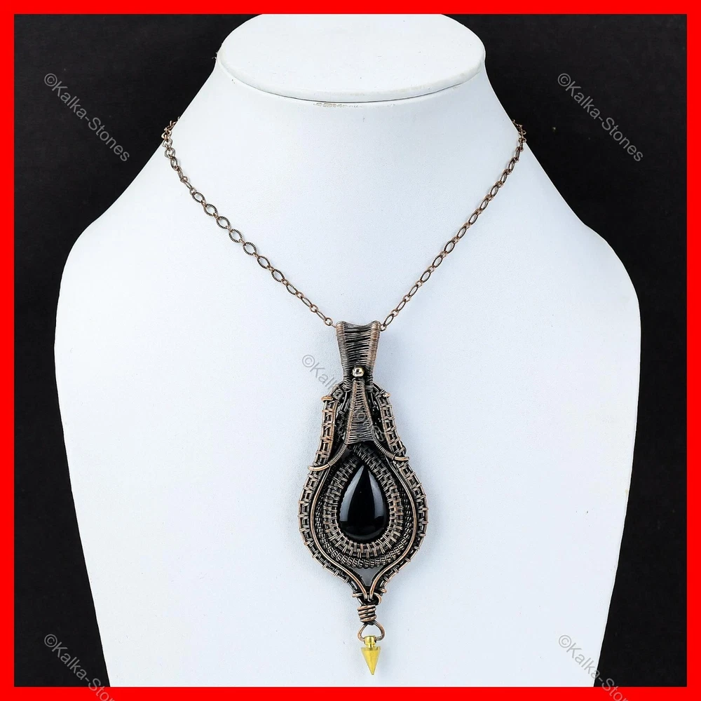 Note : Due to the natural formation of this gemstone. Slight variation in design and color are to be expected. Welcome to Kalka Stones Mothers day Deal Natural Black Onyx Wire Wrapped Wedding Pendant Jewelry Copper Handmade Pendant, Wire Wrapped Pendant, Wire Wrapped Jewelry, Copper Pendant, Copper Wire Pendant, Wrapped Jewelry, Wire Wrap Pendant, Wire Wrap Jewelry SKU : VFWP-3986 Gemstone : Black Onyx Stone Shape : Pear Metal Purity : Unknown Copper Length : 106 Millimeters Width : 43 Millimeters Copper has been used for jewelry making for thousands of years, dating back to ancient civilizations such as the Egyptians, Romans, and Aztecs. Copper was valued for its beauty, versatility, and durability, and was often used to make everything from jewelry and coins to cookware and tools. In addition to its historical significance, copper jewelry also offers several benefits. Copper is a natural conductor of heat and electricity, which makes it ideal for energy healing and therapeutic purposes. Wearing copper jewelry is believed to have various health benefits, such as improving circulation, reducing inflammation, and boosting the immune system. Some people also believe that copper jewelry has the ability to balance energy and improve mood. For Mother's Day Gift For Father's Day Gift For Promise For Valentine's Day For Halloween Party For Christmas Day Gift For New Year Party For Mom For Her If you can't find the information you need or need some advice for your design? Feel free to contact us. We are fast to reply :) All our work is made by hand with Love and Care in our workshop Thank you so much for visiting and hope you enjoy shopping with us Kalka Stones is committed to delivering the best quality jewelry to customers. As a handmade jewelry manufacturer, we offer an extensive selection of copper gemstone jewelry that showcases the brilliance of our craftsmanship. We are an experienced handmade jewelry supplier with expertise in embellishing gemstones to suit every style. We offer you the liberty to create your jewelry ensemble with sparkling, earthy, and pure gemstones. Our Talented artisans masterfully handcraft each piece of jewelry you see here. Our pieces are made with genuine gemstones.