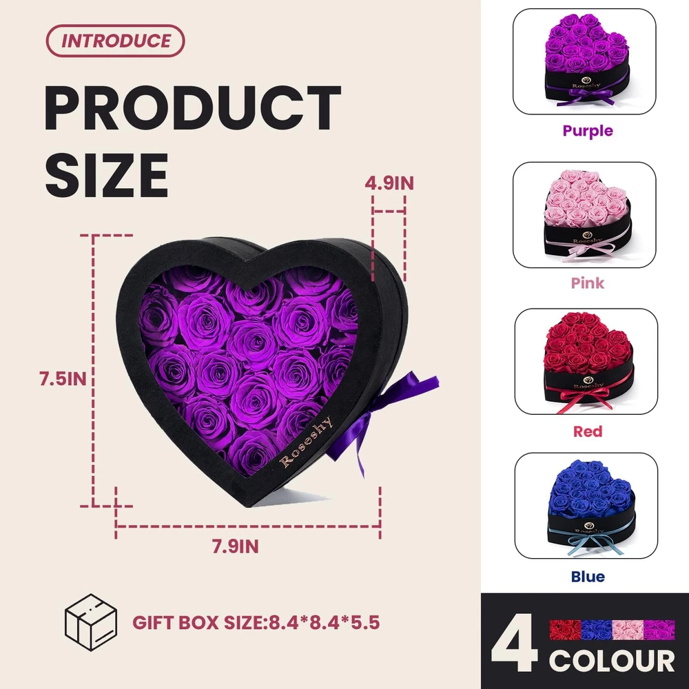 Store New Arrivals Add to Favorite View Feedback Contact Mothers Day Flowers Roses Gifts for Mom,16Pcs Forever Preserved Roses in Heart Shape Gift Box,Mothers Day Delivery Prime Gifts-Roses Gifts for Her Women,Mom Wife Description Color Purple Item Weight 1.32 pounds Batteries required No Package Dimensions 8.54 x 8.5 x 5.59 inches Number of pieces 16 Eternal Preserved Roses: These preserved roses can be kept for 1-3 years, expressing everlasting love and affection. Heart-Shaped Gift Box: The set includes 16pcs of forever preserved roses beautifully arranged in a heart-shaped gift box, perfect for romantic occasions. Thoughtful Gifts: Ideal for girlfriends, wives, moms, or any special woman in your life, these roses make heartfelt gifts that convey love and appreciation. Versatile Occasion: Whether it's Christmas, Valentine's Day, Mother's Day, anniversary, or a birthday, these preserved roses are a fitting gift choice. Lasting Beauty: Unlike fresh flowers that wither quickly, this preserved rose set stays vibrant and attractive, serving as a lasting symbol of your love and care. Product Description Soft Velvet Material The box is made of soft velvet fabric, which makes the hand feel more comfortable and the product more exquisite. Transparent Window With a transparent window at the top to better display the roses inside, it can be used as a home decoration to adorn a room or living room. Gift Box Packaging With a gift box packaging, not only to protect the product but also to make the gift more precious, the recipient will be more like the gift. Proportioned Roses Our roses are carefully selected for their full and well-proportioned foliage, and the roses are displayed at their best. Suitable Places Christmas Day Valentine's Day Mother's Day Anniversary Birthday Thanksgiving Day Confession/Proposal Wedding Express your love Make your loved ones feel truly special with our remarkable collection of Eternal Roses! Product Information Size Product size: 7.9in*7.5in*4.9in Package size: 8.0in*8.0in*5.5in Weight: 1.4BL Shape: Heart shape Color Red Purple Pink Blue Add to Cart Add to Cart Add to Cart Add to Cart Customer Reviews 4.8 out of 5 stars 284 4.8 out of 5 stars 284 4.8 out of 5 stars 284 4.8 out of 5 stars 284 Price $59.99 $ 59 . 99 $59.99 $ 59 . 99 $59.99 $ 59 . 99 $59.99 $ 59 . 99 Shape Round Round Round Round Color Red Purple Blue Pink No. of roses 16 Roses 16 Roses 16 Roses 16 Roses Size 7.9in*5.0in 7.9in*5.0in 7.9in*5.0in 7.9in*5.0in ABOUT US We offer the best prices around on high quality products. Our E-store includes media such as books, movies, music and games while offering electronics, toys, sporting apparel, clothing, tools, general home, garden items and more. SHIPPING We are always working hard to ensure your package arrives as soon as possible. Please understand that some factors like weather, high postal traffic, and the performance of shipping companies are outside of our control. We offer free shipping to the lower 48 states and ship within 2 business days of payment, usually sooner. We do not accept P.O. Boxes. Please provide a physical address. For shipping outside of the continental USA, we only use eBay's Global Shipping Program.The item is shipped to KY and then sent to the rest of the world. International customers are responsible for all duties and taxes. Continue to 'check out' to calculate costs for shipping the item to your country. Messages regarding eBay's Global Shipping Program MUST be directed at eBay EXCLUSIVELY. RETURNS We offer a 30-Day Return Policy on items in which you are not completely satisfied with. You have the option of a full-refund or an exchange of the item. No returns are available on items shipped outside of the USA. PAYMENT We accept PayPal. CONTACT US This page content is yet to come Please ad us to your favorite seller and visit again later Thank You CUSTOMER SATISFACTION We try our very best to make sure every customer is completely satisfied. If there's a problem, message us! We're happy to help. 2025 ROE STORE | All Rights Reserved