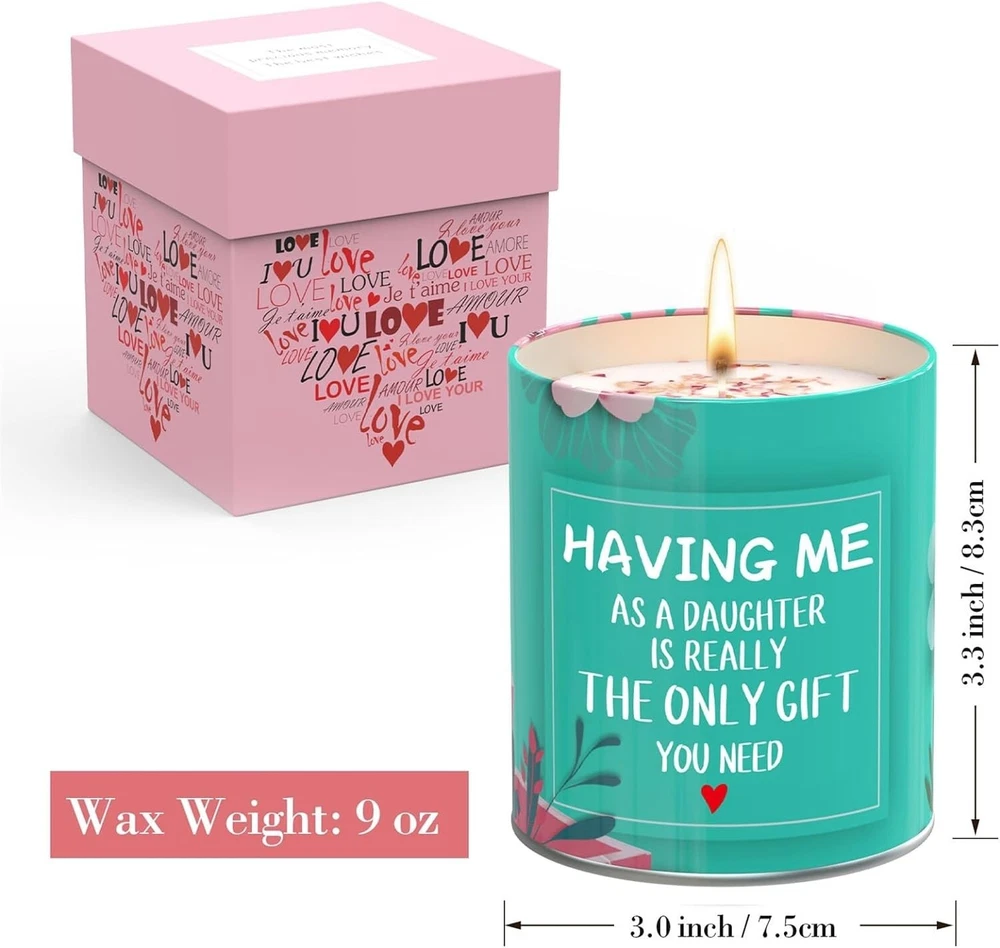 【100% Natural Soy Wax】- Candle is made of natural soy wax and premium gardenia essential oils,the wax core is made of 100% lead-free cotton and will not produce black smoke when ignited. Soy wax candles are free from paraffin and and burnt without fumes. 💕【Funny Gifts Ideas】- Scented candles 9 oz, each can burn for 50-60 hours;Fragrance: gardenia,reusable jars,beautifully designed candle boxes. 💕【Gifts For Mom From Daughter】- This scented candle comes with funny humorous quote. A perfect gifts for mom,mother-in-law,aunt,step mother,a new mom,first-time mom,godmother,mother,her,mama,bonus mom,pregnancy mom,foster mom gifts,dad,father,husband,new dad,first time dad,bonus dad,dad-to-be,father-in-law,stepfather from daughter. 💕【Mom Gifts For Any Occasions】- Great gifts ideas for Mothers day,Fathers day,Thanksgiving gifts,Christmas gifts,Valentines day,Bday,Holidays,Retirement,Birthday gift for mom/dad,mom birthday gifts,dad birthday gifts,best mom ever gifts,mom gifts, dad gifts. Funny candles to show your love for mom,dad,gift for the parent who has everything! 💕【Birthday Gifts For Mom】- Scented candle smells like real gardenias,the aroma is pure and fresh,very helpful in reducing stress,promoting sleep and relieving anxiety. It can be used for insomnia,meditation,aromatherapy,yoga,odor removal,etc.