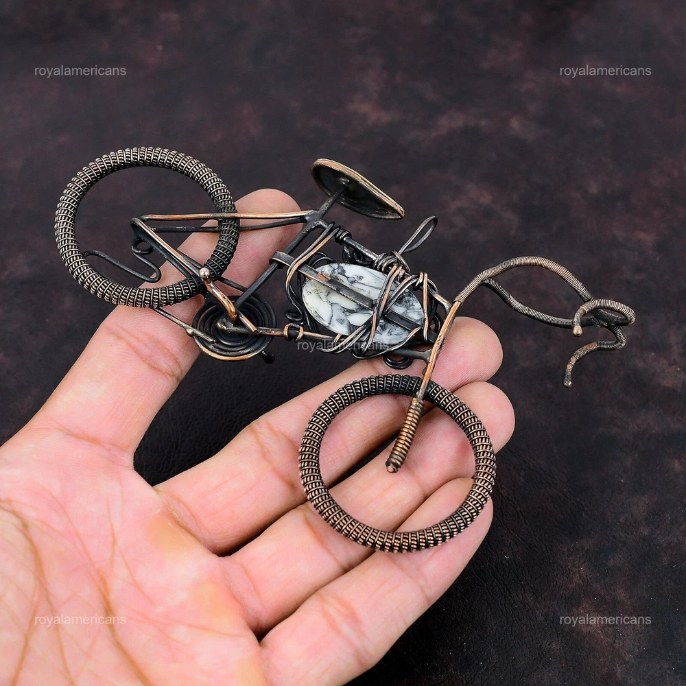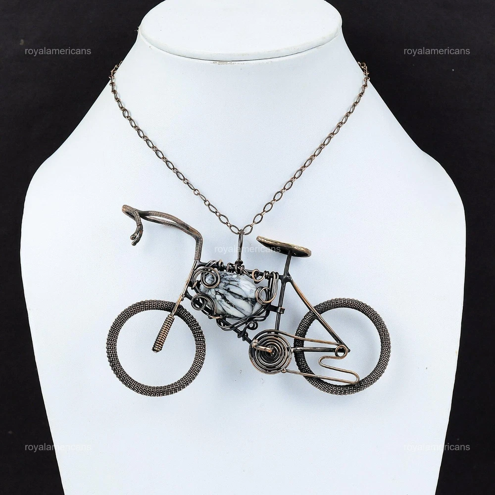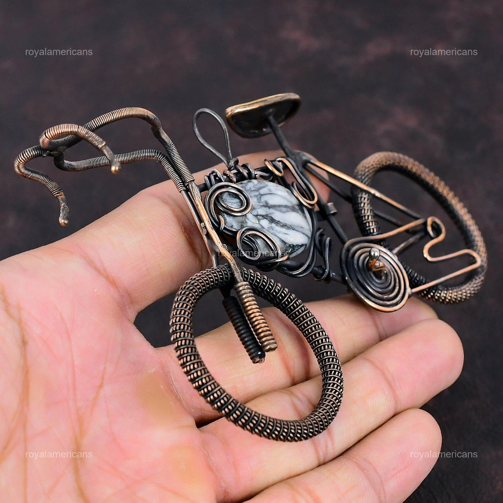 Note : Due to the natural formation of this gemstone. Slight variation in design and color are to be expected. Welcome to Royalamericans Mothers day Deal Copper Natural Pinolith Jasper Cycle Daughter Pendant Jewelry Handmade Pendant, Wire Wrapped Pendant, Wire Wrapped Jewelry, Copper Pendant, Copper Wire Pendant, Wrapped Jewelry, Wire Wrap Pendant, Wire Wrap Jewelry SKU : UFWP-4153 Gemstone : Pinolith Jasper Stone Shape : As Seen In Picture Metal Purity : Unknown Copper Length : Millimeters Width : Millimeters Copper has been used for jewelry making for thousands of years, dating back to ancient civilizations such as the Egyptians, Romans, and Aztecs. Copper was valued for its beauty, versatility, and durability, and was often used to make everything from jewelry and coins to cookware and tools. In addition to its historical significance, copper jewelry also offers several benefits. Copper is a natural conductor of heat and electricity, which makes it ideal for energy healing and therapeutic purposes. Wearing copper jewelry is believed to have various health benefits, such as improving circulation, reducing inflammation, and boosting the immune system. Some people also believe that copper jewelry has the ability to balance energy and improve mood. For Mother's Day Gift For Father's Day Gift For Promise For Valentine's Day For Halloween Party For Christmas Day Gift For New Year Party For Mom For Her If you can't find the information you need or need some advice for your design? Feel free to contact us. We are fast to reply :) All our work is made by hand with Love and Care in our workshop Thank you so much for visiting and hope you enjoy shopping with us Royalamericans is committed to delivering the best quality sterling silver jewelry to customers. As a handmade jewelry manufacturer, we offer an extensive selection of copper gemstone jewelry that showcases the brilliance of our craftsmanship. We are an experienced handmade jewelry supplier with expertise in embellishing gemstones to suit every style. We offer you the liberty to create your jewelry ensemble with sparkling, earthy, and pure gemstones. Our Talented artisans masterfully handcraft each piece of jewelry you see here. Our pieces are made with genuine gemstones.