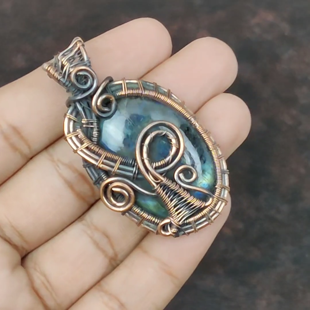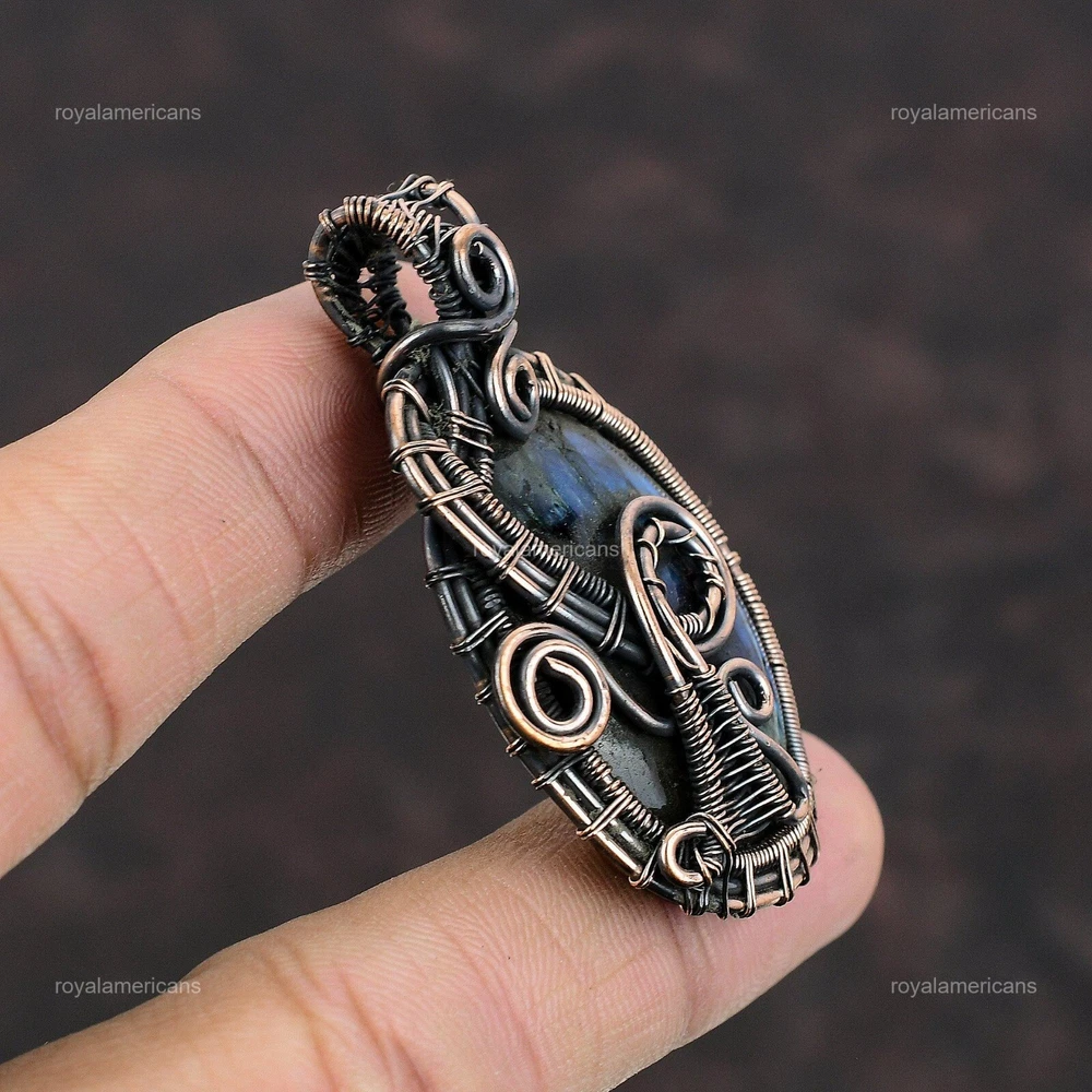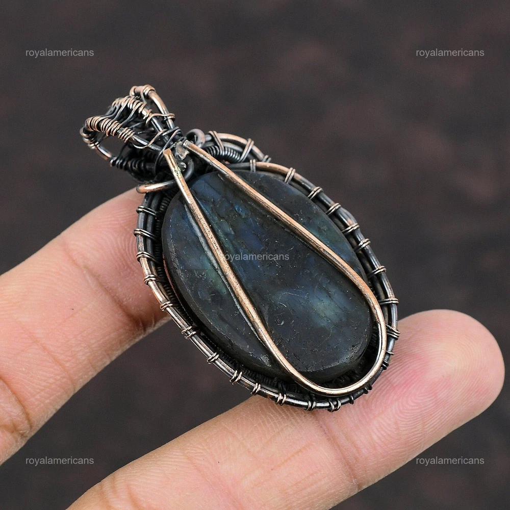 Note : Due to the natural formation of this gemstone. Slight variation in design and color are to be expected. Welcome to Royalamericans Mothers day Deal Natural Labradorite Copper Handmade Engagement Pendant Jewelry Handmade Pendant, Wire Wrapped Pendant, Wire Wrapped Jewelry, Copper Pendant, Copper Wire Pendant, Wrapped Jewelry, Wire Wrap Pendant, Wire Wrap Jewelry SKU : UFWP-360 Gemstone : Labradorite Stone Shape : Oval Metal Purity : Unknown Copper Length : 56 Millimeters Width : 31 Millimeters Copper has been used for jewelry making for thousands of years, dating back to ancient civilizations such as the Egyptians, Romans, and Aztecs. Copper was valued for its beauty, versatility, and durability, and was often used to make everything from jewelry and coins to cookware and tools. In addition to its historical significance, copper jewelry also offers several benefits. Copper is a natural conductor of heat and electricity, which makes it ideal for energy healing and therapeutic purposes. Wearing copper jewelry is believed to have various health benefits, such as improving circulation, reducing inflammation, and boosting the immune system. Some people also believe that copper jewelry has the ability to balance energy and improve mood. For Mother's Day Gift For Father's Day Gift For Promise For Valentine's Day For Halloween Party For Christmas Day Gift For New Year Party For Mom For Her If you can't find the information you need or need some advice for your design? Feel free to contact us. We are fast to reply :) All our work is made by hand with Love and Care in our workshop Thank you so much for visiting and hope you enjoy shopping with us Royalamericans is committed to delivering the best quality sterling silver jewelry to customers. As a handmade jewelry manufacturer, we offer an extensive selection of copper gemstone jewelry that showcases the brilliance of our craftsmanship. We are an experienced handmade jewelry supplier with expertise in embellishing gemstones to suit every style. We offer you the liberty to create your jewelry ensemble with sparkling, earthy, and pure gemstones. Our Talented artisans masterfully handcraft each piece of jewelry you see here. Our pieces are made with genuine gemstones.