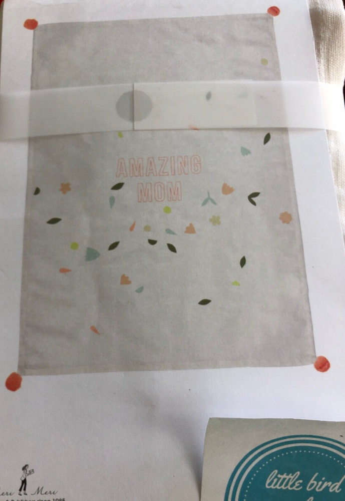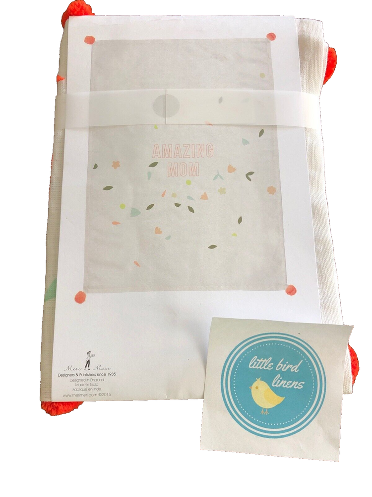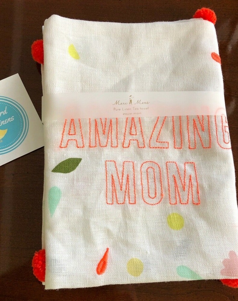 Meri Meri TEA TOWEL. Amazing Mom- machine stitched on front of towel. 100% Linen with pom poms at each corner. Approximately 20" x 28" Brand New- factory folded.