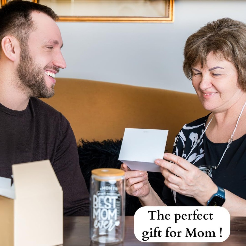 A FUNNY AND SWEET GIFT FOR MOM: Show mom how much you love her with this Mom Gift Set. Perfect as a New Mom Gift, First-Time Mom Gift, Gift for Mom from Son, Gift for Mom from Daughter, or Gift for Mother-in-Law. Also ideal for Bonus Moms or as Regalos para Mamá and Regalos para mi Madre. MOTHERS DAY GIFT FOR MOM: This Best Mom cup features loving and witty remarks designed to share smiles and laughter. It's ideal for Mom Gifts, Gifts for Mom, Best Mom Ever Gifts, Mom Birthday Gift for Mom, Funny Gifts Ideas For Mom. IN SLEEK PACKAGING: This gift set includes a beautifully designed gift box and one blank gift card, perfect for personalizing with your own thoughtful message. It also includes a 16 oz Glass Cup, a leak-proof Bamboo Lid, two reusable Glass Straws, and a Straw Brush Cleaner. PRACTICAL AND PORTABLE: Suitable for both hot and cold drinks, this cup is perfect for coffee, tea, smoothies, soda, beer, or cocktails. The bamboo lid and straw hole feature silicone seals to ensure leak-proof performance, whether at home or on the go. Fits in all cup holders! HIGH-QUALITY + NON-TOXIC: Made from 100% high-density borosilicate glass, this cup is free of lead, toxins, BPA, and BPS, ensuring safe use. The durable bamboo lid with a silicone seal enhances durability, while the reusable design helps reduce single-use plastic waste. Enjoy drinks free from harmful chemicals, with a pure, delicious taste.