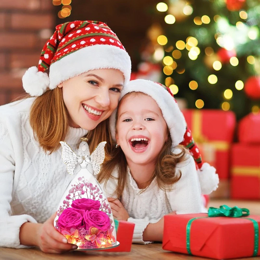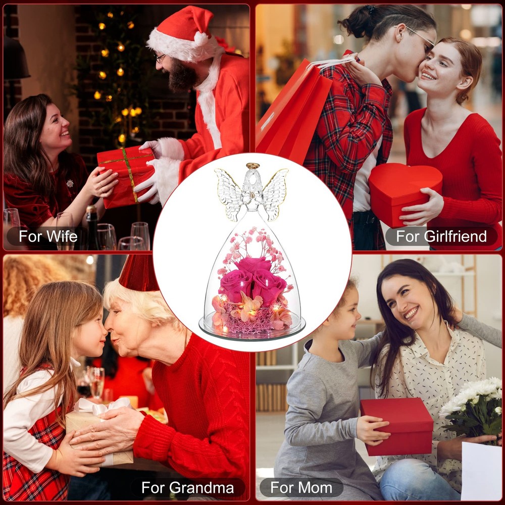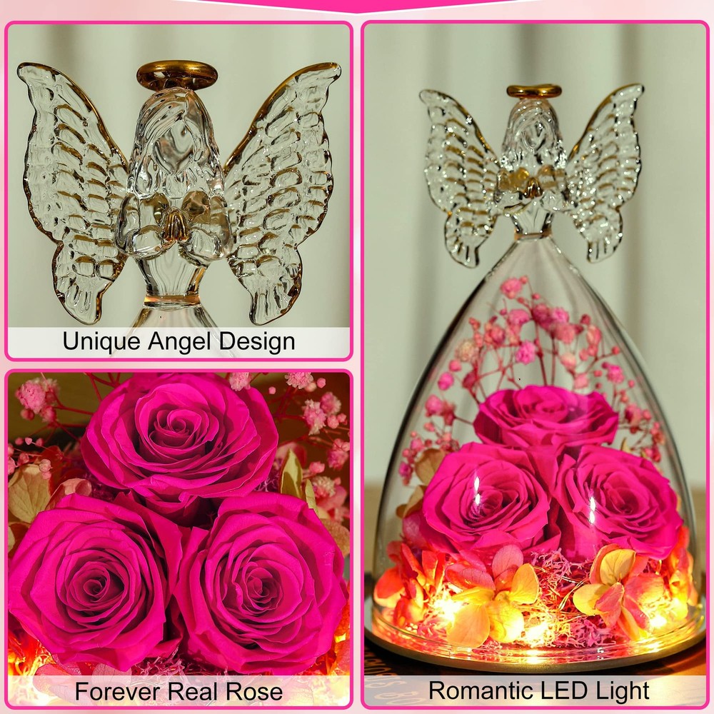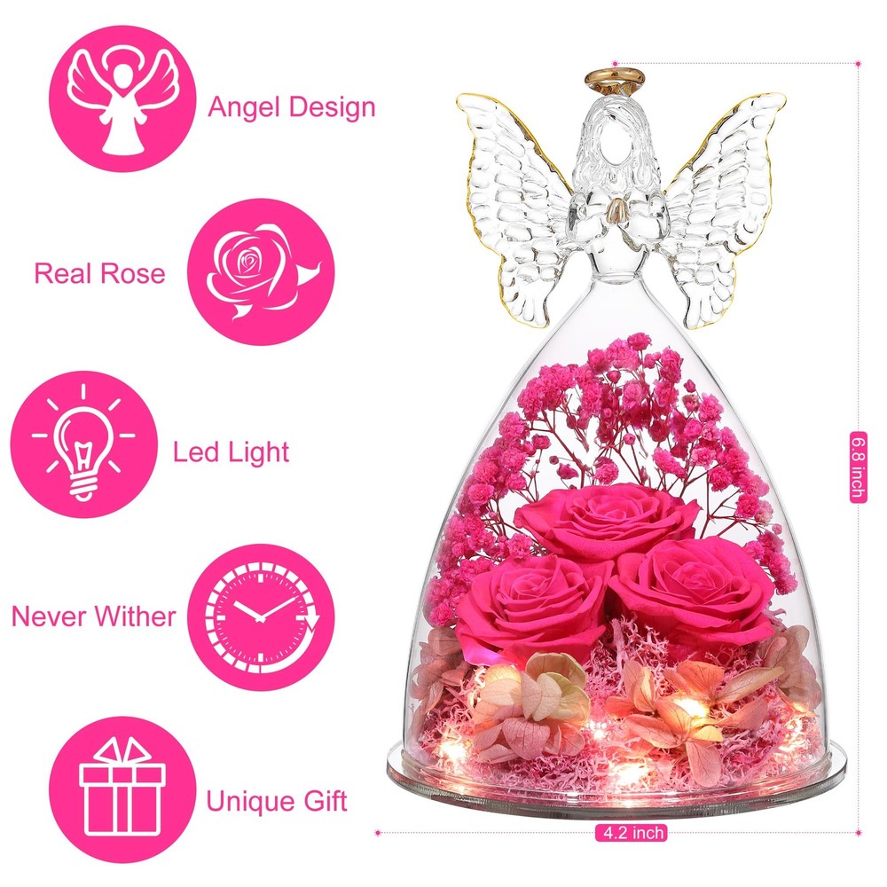 Angel Roses Mothers Day Mom Gifts for Women Preserved Flower Rose Forever Fresh Flowers for Delivery Prime Mother's Day Birthday Gifts for Grandma Patented Product for both Angel Figurines and Inside Decorative Flower Bouquet. Angel Rose Gifts,Three Forever Real Rose in Angel Figurines Gifts for Women, Angel Guardian with Rose Gift for Valentine Day Mothers Day Birthday Christmas Gift Mothers Day Gift and Rose flower for Valentines Day: It is the best gift for mother,grandmother,wife,fiancee,girlfriend, friends,colleagues and classmates on Mother's Day, Christmas, Valentine's Day 【Size】:The diameter of the angel is 11 cm (4.33 inches) and the height is 17 cm (6.7 inches)Glass Angel with three roses inside. 【No Withering, Easy to care,Gift for Women】Put it in cool place, it will stay for 3-5 years to forever. Your loved one will have a good mood when she looks at it everyday. Avoid Direct Sunlight Romantic Gift for her: Sending a romantic and surprise gift for the women who is important in your life on Romantic Valentine's Day, Mother's Day, Christmas, Thanksgiving, Wedding, Anniversaries, Marriage Proposals,New Year's Day or any other special occasion.
