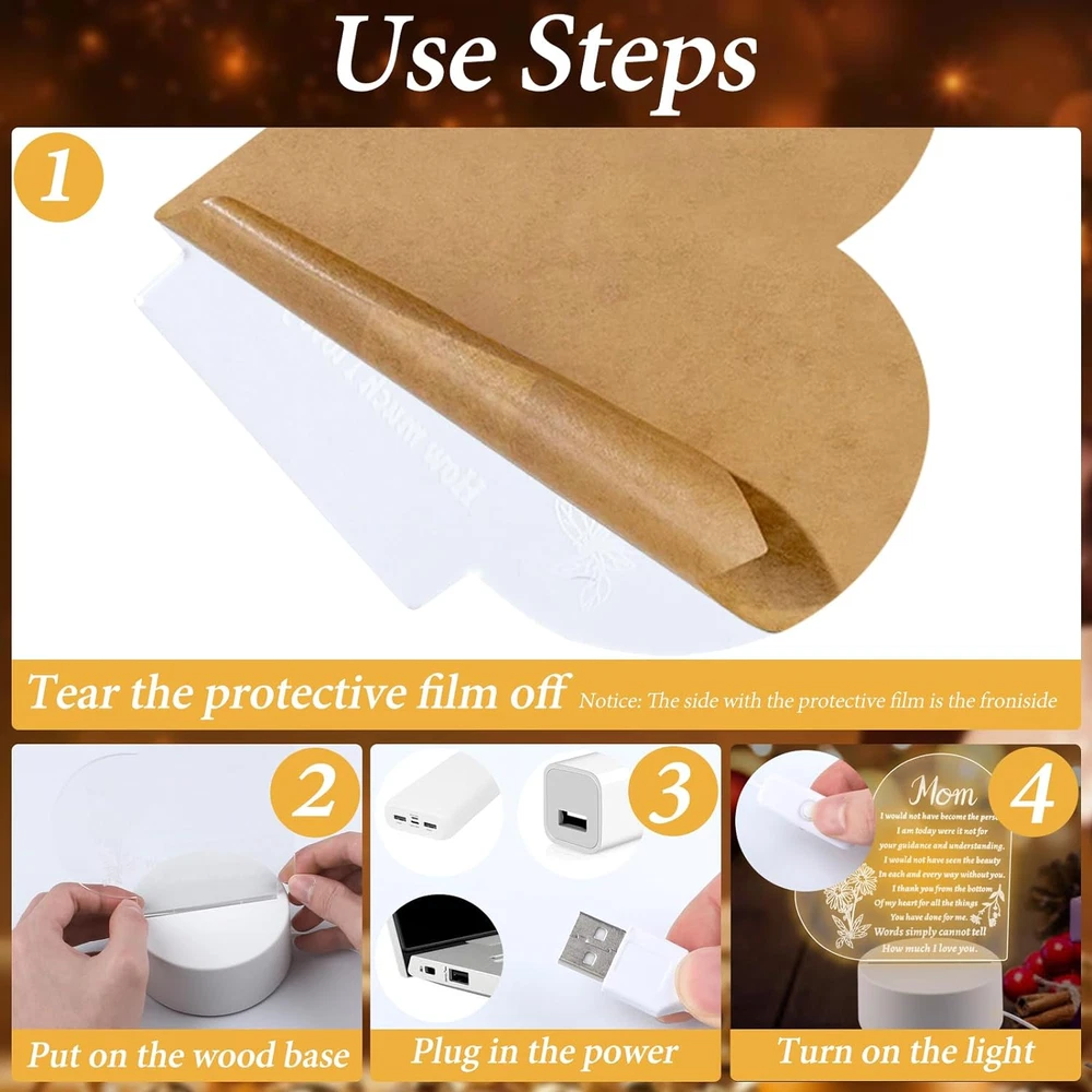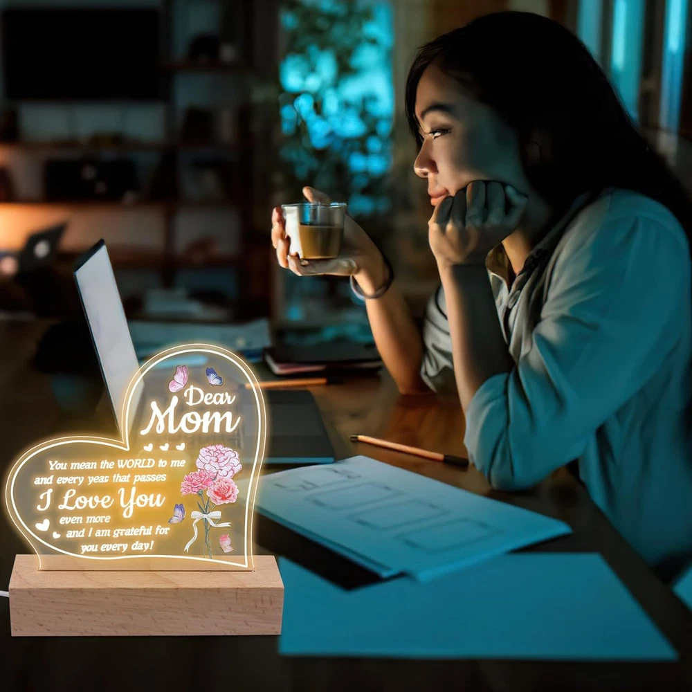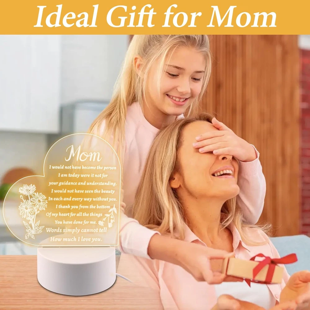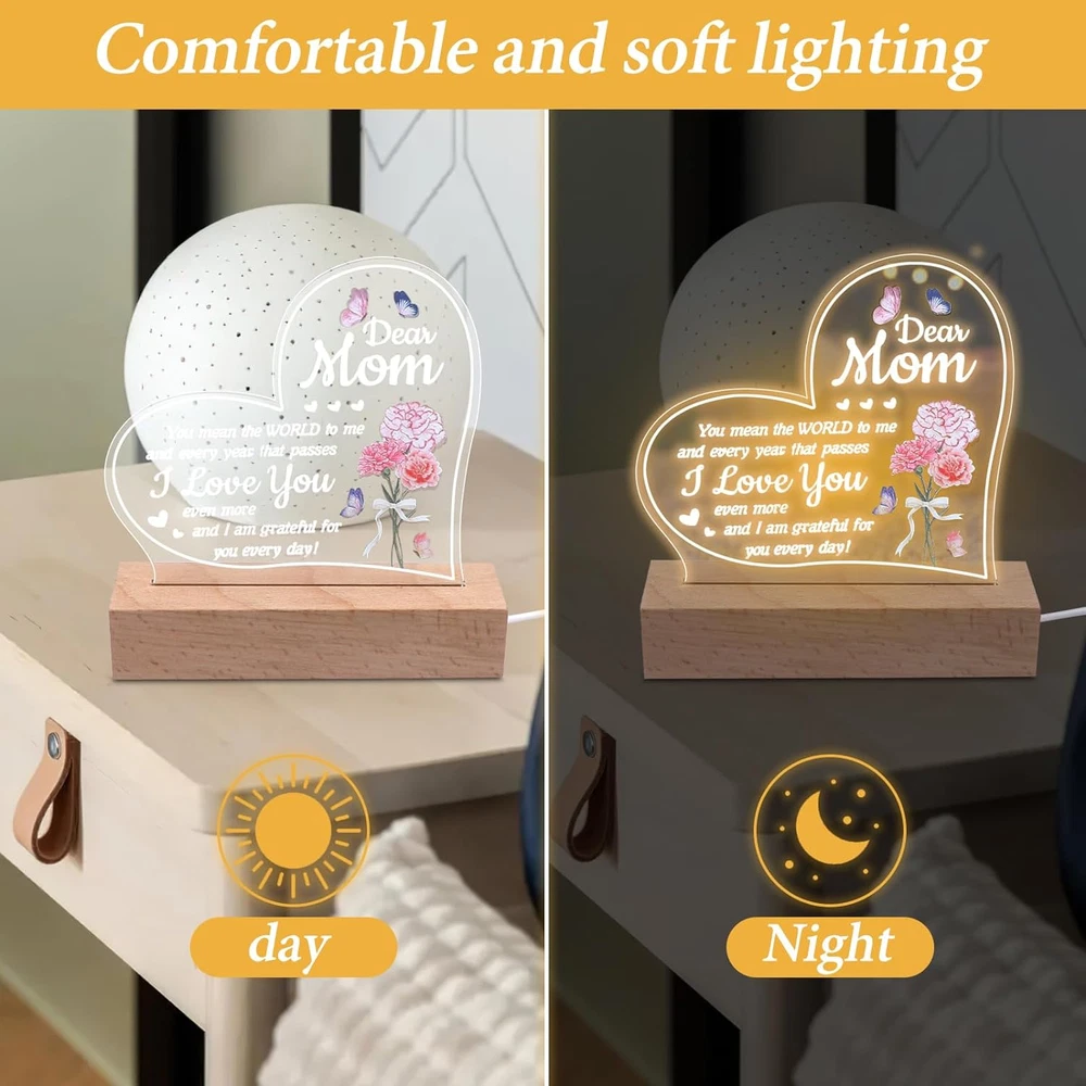Store New Arrivals Add to Favorite View Feedback Contact Mothers Day Gift from Daughter, Acrylic Night Light for Mothers Birthday Gifts Description Light Source Type CFL Style Art Deco Number of Items 1 Power Source 5V USB Control Method Touch Batteries Included? No Lamp Type Desk Lamp Room Type Living Room Product Dimensions 1"D x 1"W x 1"H Material Acrylic Included Components Dimmer Bulb Base Wedge Recommended Uses For Product Decoration Water Resistance Level Not Water Resistant Item Weight 9.2 ounces Connectivity Technology USB Special Features 3-Way Mounting Type Tabletop Color White Base Material Wood Is Waterproof False returns 30 Days Free Returns shipping Fast and Free Shipping satisfaction 100% Customer Satisfaction handling_time Normally 1 or 2 days only Gifts for Mom: Give this night light as a Mother's Day gift, Mom Birthday to the mom gifts,Let her feel your love for her.Unique mom gifts for Christmas, Mother Day gifts for mom, gifts for mom from daughter, Birthday presents for mom, Best mom gifts. Suitable for Any Occasion: This night light is Birthday Gifts,Chrismas Gift, Mother’s Day Gift Thanksgiving gift and all seasonal gift.You can decorate the bedroom, living room, dinning room. Warm Decorations: This night light is made of acrylic, even if you wake up in the middle of the night or work late at night, the light won't be too bright or harsh, creating an ideal sleeping and office environment for you or your loved ones. Security material: This night light is solid acrylic plate and high quality solid wood base.The lamp base is made of top-quality wood materials, environmentally friendly, pollution-free, odorless, and has no sharp edges .lightweight. The night light uses a standard USB port . Method of Use: There is a protective film on the night light You need to tear it off before use. ABOUT US We offer the best prices around on high quality products. Our E-store includes media such as books, movies, music and games while offering electronics, toys, sporting apparel, clothing, tools, general home, garden items and more. SHIPPING We offer free shipping to the lower 48 states and ship within 2 business days of payment, usually sooner. We do not accept P.O. Boxes. Please provide a physical address. We are always working hard to ensure your package arrives as soon as possible. Please understand that some factors like weather, high postal traffic, and the performance of shipping companies are outside of our control. RETURNS We offer a 30-Day Return Policy on items which you are not completely satisfied with. You have the option for a full-refund or an exchange of the item. No returns are available on items shipped outside of the USA. Free return. PAYMENT We accept PayPal. CONTACT US This page content is yet to come Please ad us to your favorite seller and visit again later Thank You CUSTOMER SATISFACTION We try our very best to make sure every customer is completely satisfied. If there's a problem, message us! We're happy to help. WE ACCEPT Paypal Credit or Debit Card Google Pay Apple Pay