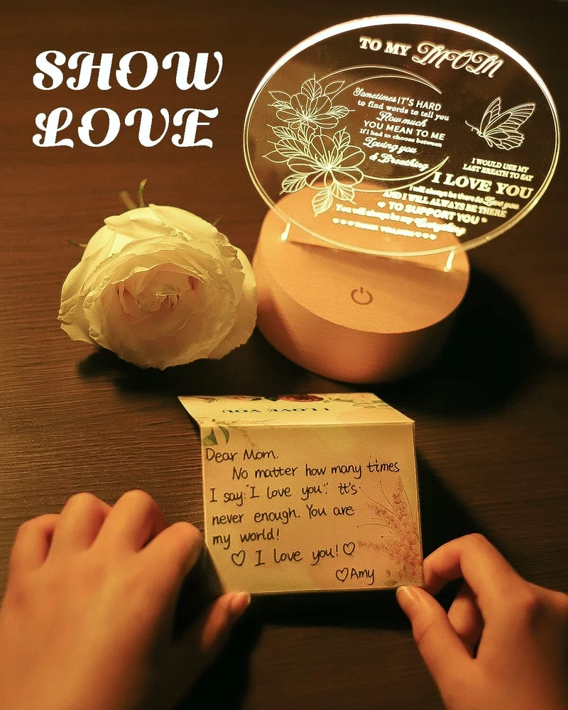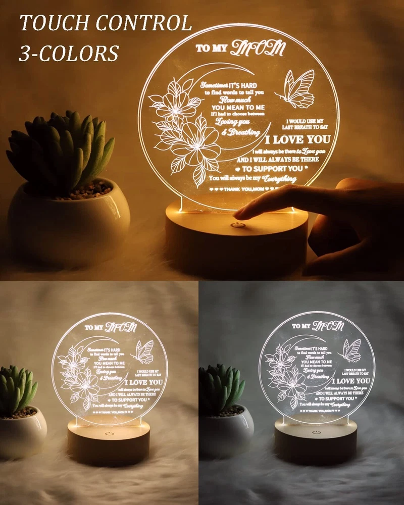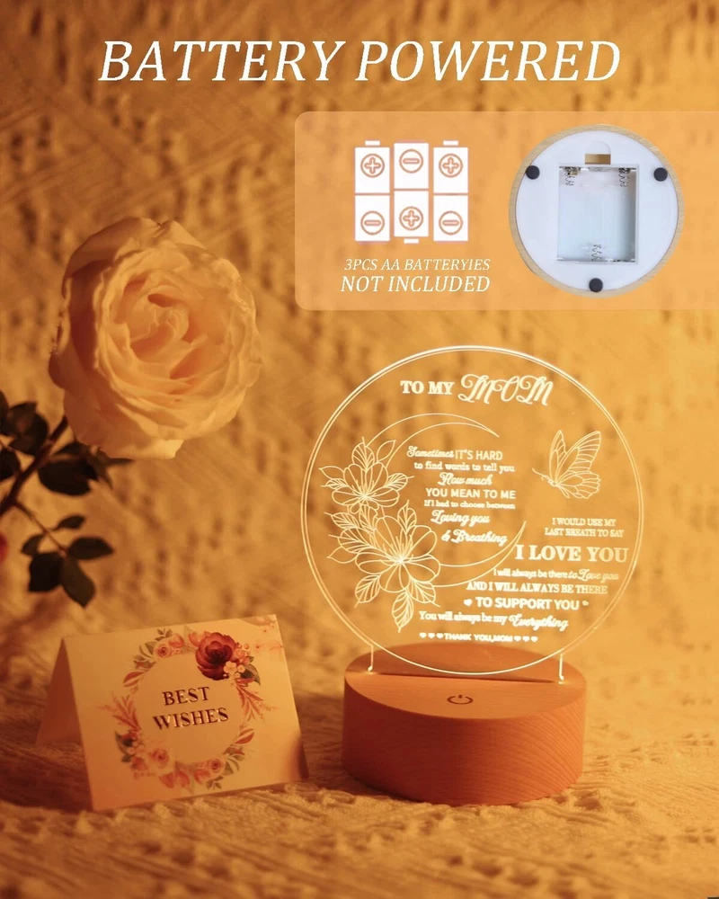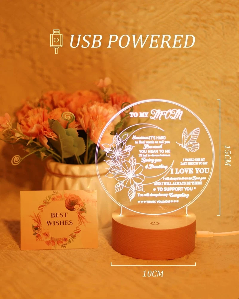 Mothers Day Gifts From Daughter Son,Mother's Day Gifts for Mom,Top Mother s Day Presents Ideas,Unique Mom Birthday Gift,3D Acrylic Night Lamp with Wooden Base and Greeting Card,3 Colors Touch Control amazon (dot) com/dp/B0BXJVL4XG It is from Amazon, brand-new, never-used, un-opened. Check the above Amazon link for more details if needed.