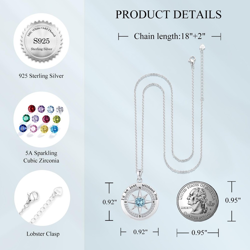 Mothers Day Gifts for Wife Compass Birthstone Necklace Wife Birthday Gift Ideas Anniversary Jewelry for Wife 925 Sterling Silver Wife Jewelry Birthday Gifts for Wife I'd Be Lost Without You Product Details Style: Compass-03-Mar.Aquamarine Brand: YOVOGO MPN: Does not apply UPC: Does not apply EAN: Does not apply Date First Available : October 6, 2024 Brand, Seller, or Collection Name: YOVOGO Metal: Sterling Silver Material: Cubic Zirconia Gem Type: Aquamarine Stone Weight: 0.1 carats