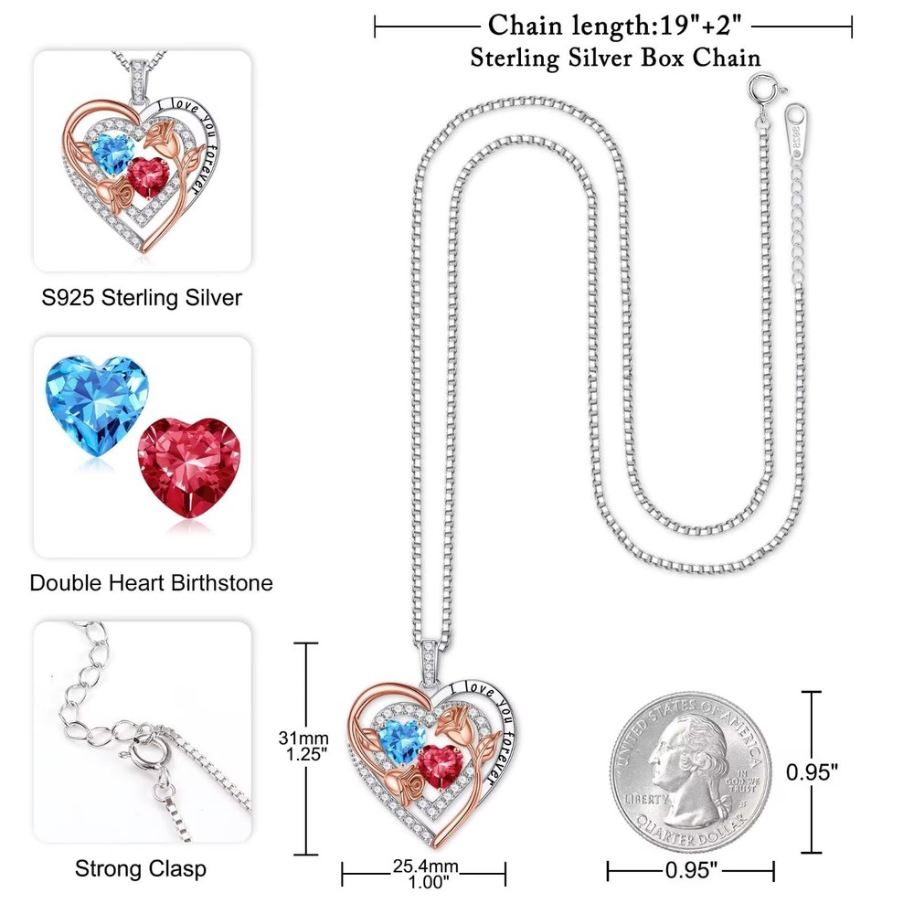 Jewelry Gifts: Mothers Day Gifts Birthday Gifts Anniversary Gifts Christmas Gifts Valentines Day Gifts Jewelry Attentiontion Please avoid contacting with the acid and alkali, corrosive substances. Please avoid the collision, so as to avoid surface scratches. Please avoid wearing it when sweating a lot, shower or sleep, etc. Please wipe them with soft cloth when you clean your jewelries. Best Gifts: The best gifts for your love, when she receive the gifts, we believe it is a surprise! UNIQUE GIFTS: The elaborate double birthstone necklace, one representing your birth month and one representing hers, represents the two of you forever tightly held together. Unique necklace send to the best women in your life and let her know how much she means to you. This birthstone necklace, a perfect gift for your love on Christmas, Anniversary and Birthday. MEANING: The heart pendant engraved with the words "I love you forever" symbolizes your forever love for the special women in your life. When she wear this heart necklace, she will never forget the long and deep love you shared. Perfect gifts for your mom, grandma, wife or any other people your love on Mother's Day, Birthday, Christmas, Valentine's Day or other special days. MATERIALS: The chain and pendant are both made of 925 Sterling Silver. This is a high quality stuff that will not fade, turn your skin to green, red or itchy. You can wear or give at ease. SIZE: Chain is 19 inches + 2 inches (Adjustable). This length works on practically anyone. It's a excellent gift choice for women daily wearing home or office. AFTER - SALES SERVICE: Your satisfaction is our top priority. If you are interested in or question the birthstone necklace, please contact us in time. We will reply you within 24 hours and give you a satisfactory answer.
