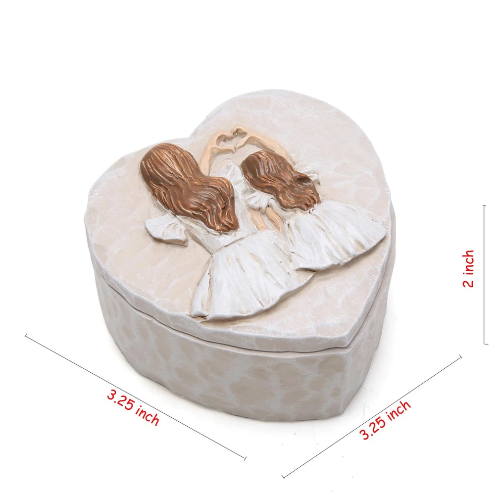 These decorative boxes are perfect for storing jewelry and unforgettable souvenir. On the upper lid, mother hugs daughter. This is the good gift for Mother's Day. It shows love from the mother to the daughter. In the box you can see the word ''Cherish The Wonderful Moment''. It is a good gift for mother, grandmother and the important women in your life. This makes you think of love and you will remember him/her when you see this box. Mother Birthday Gifts Decorations: environmentally friendly resin. This products is designed by our designer Jammy. Only our company has this design and we have the patent and the copyright. Mother's Day Gifts Decor: The design of the jewelry box is inspired by the deep emotional bond between mother and daughter. Two small figure sculptures, one representing the mother and the other representing the daughter, put their shoulders on each other, conveying the silent affection and mutual support. The affection between mother and daughter makes this jewelry box full of precious memories. When you open the box, it can evoke memories of family love, growth, and common experiences. This heart-shaped jewelry box presents an exquisite woodcut effect, and the wood grain flows naturally on the box body, adding a deep artistic sense to the jewelry box. It also gives the jewelry box a rustic and timeless quality. The image of mother and daughter with each other's shoulders and hand gestures form a heart shape, symbolizing the spiritual connection between two generations. No matter how time changes, no matter how far the distance is, each other's emotions are closely linked. Jewelry Box Decor: As a special anniversary gift, this jewelry box can permanently record the important moments of mother and daughter, becoming a symbol of memories of their shared experience. It can be placed in the living room, bedroom or study, etc., it will add a warm atmosphere to the space and remind family members to value family affection. This jewelry box also makes an excellent Mother's Day gift, and birthday gift, conveying strong mother-daughter sentiments.
