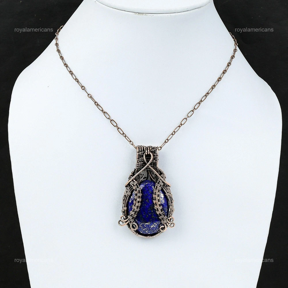 Note : Due to the natural formation of this gemstone. Slight variation in design and color are to be expected. Welcome to Royalamericans Mothers day Sale Oval Lapis Lazuli Gemstone Copper Wire Wrapped Pendant Jewelry Handmade Pendant, Wire Wrapped Pendant, Wire Wrapped Jewelry, Copper Pendant, Copper Wire Pendant, Wrapped Jewelry, Wire Wrap Pendant, Wire Wrap Jewelry SKU : UFWP-1507 Gemstone : Lapis Lazuli Stone Shape : Oval Metal Purity : Unknown Copper Length : 65 Millimeters Width : 40 Millimeters Copper has been used for jewelry making for thousands of years, dating back to ancient civilizations such as the Egyptians, Romans, and Aztecs. Copper was valued for its beauty, versatility, and durability, and was often used to make everything from jewelry and coins to cookware and tools. In addition to its historical significance, copper jewelry also offers several benefits. Copper is a natural conductor of heat and electricity, which makes it ideal for energy healing and therapeutic purposes. Wearing copper jewelry is believed to have various health benefits, such as improving circulation, reducing inflammation, and boosting the immune system. Some people also believe that copper jewelry has the ability to balance energy and improve mood. For Mother's Day Gift For Father's Day Gift For Promise For Valentine's Day For Halloween Party For Christmas Day Gift For New Year Party For Mom For Her If you can't find the information you need or need some advice for your design? Feel free to contact us. We are fast to reply :) All our work is made by hand with Love and Care in our workshop Thank you so much for visiting and hope you enjoy shopping with us Royalamericans is committed to delivering the best quality sterling silver jewelry to customers. As a handmade jewelry manufacturer, we offer an extensive selection of copper gemstone jewelry that showcases the brilliance of our craftsmanship. We are an experienced handmade jewelry supplier with expertise in embellishing gemstones to suit every style. We offer you the liberty to create your jewelry ensemble with sparkling, earthy, and pure gemstones. Our Talented artisans masterfully handcraft each piece of jewelry you see here. Our pieces are made with genuine gemstones.