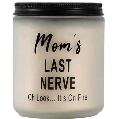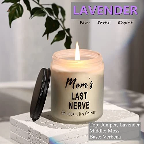 【Great Gift for Mom】It's a huge hit on many occasions,it's great 40th birthday gifts women,50th birthday gifts for women,60th birthday gifts for women,70th birthday gifts for women,retirement gifts for mom 【𝐈𝐦𝐩𝐫𝐞𝐬𝐬𝐢𝐯𝐞】Front has the:"Mom's LAST NERVE,Oh look it's on fire" and the Back side has a rather humorously printed " My favorite child gave me this candle." It is the little things that count. Small stuff like this will help add an extra spark of laughter in your family. 【𝐁𝐞𝐬𝐭 𝐌𝐞𝐦𝐨𝐫𝐲】 It is the little things that count.moms last nerve candle look its on fire.It's not only the gift for mom,A funny small stuff like this will help add an extra spark of laughter in your family and brighten up both of your days. 【𝐁𝐞𝐭𝐭𝐞𝐫 𝐅𝐨𝐫𝐦𝐮𝐥𝐚𝐭𝐢𝐨𝐧 𝐚𝐧𝐝 𝐏𝐫𝐨𝐜𝐞𝐬𝐬 】This candle is made from a special formula of 10% essential oils concentration ,the fragrances that are skillfully enhanced with all natural essential oils , you can keep the pleasant fragrance in a larger room and for a longer period of time than most similar candles of 6% or 8% on . 【Lavender Candle】Top: Juniper, Lavender; Middle: Moss; Base: Verbena.Jar Size: 2.75" x 2.75" x 3.55", 7oz soy wax,cotton wick,all-natural essential oils,clear burning for 45h+ hrs. 【MY FAVORITE CHILD GAVE ME THIS CANDLE】christian gifts for women,easter gifts for women.Stress Relief Gifts for Women,gifts for mom birthday unique,moms birthday gift ideas.birthday gifts for mom from son kangaroos_shipping Kindly note: If you would like to order more quantity than shown is available, you are welcome to place one order fox maximum available quantity and place one more order again because we always have more, than shows in available items. Regards