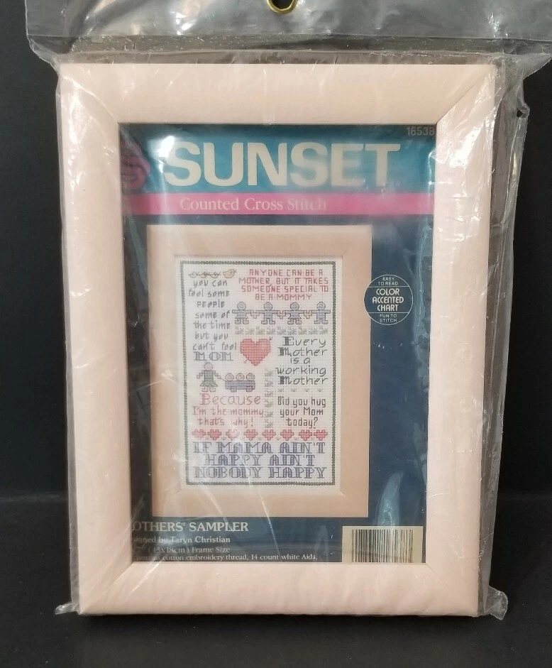 "Every mother is a working mother Because I'm the Mommy, thats why. Did you hug your mom today? You can fool some people, but you can't fool mom. Anyone can be a mother, but it takes someone special to be a Mommy. If Mommy ain't happy, ain't nobody happy" Mothers Day Mom Tribute Sampler Counted Cross Stitch Kit Dimensions Sunset Vtg. Condition is New. Shipped with USPS First Class Package.