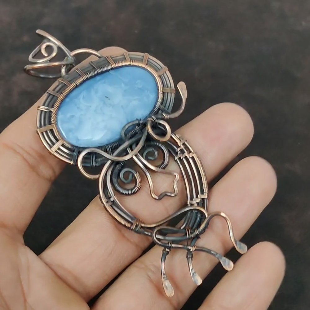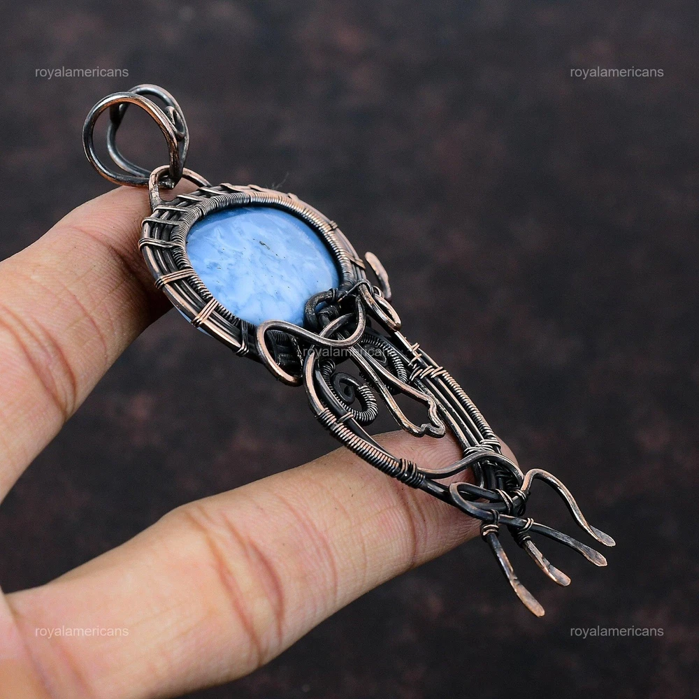Note : Due to the natural formation of this gemstone. Slight variation in design and color are to be expected. Welcome to Royalamericans Mothers day Sale Oval Owyhee Blue Opal Stone Copper Wire Wrapped Sister Pendant Handmade Pendant, Wire Wrapped Pendant, Wire Wrapped Jewelry, Copper Pendant, Copper Wire Pendant, Wrapped Jewelry, Wire Wrap Pendant, Wire Wrap Jewelry SKU : UFWP-1957 Gemstone : Owyhee Blue Opal Stone Shape : Oval Metal Purity : Unknown Copper Length : 95 Millimeters Width : 50 Millimeters Copper has been used for jewelry making for thousands of years, dating back to ancient civilizations such as the Egyptians, Romans, and Aztecs. Copper was valued for its beauty, versatility, and durability, and was often used to make everything from jewelry and coins to cookware and tools. In addition to its historical significance, copper jewelry also offers several benefits. Copper is a natural conductor of heat and electricity, which makes it ideal for energy healing and therapeutic purposes. Wearing copper jewelry is believed to have various health benefits, such as improving circulation, reducing inflammation, and boosting the immune system. Some people also believe that copper jewelry has the ability to balance energy and improve mood. For Mother's Day Gift For Father's Day Gift For Promise For Valentine's Day For Halloween Party For Christmas Day Gift For New Year Party For Mom For Her If you can't find the information you need or need some advice for your design? Feel free to contact us. We are fast to reply :) All our work is made by hand with Love and Care in our workshop Thank you so much for visiting and hope you enjoy shopping with us Royalamericans is committed to delivering the best quality sterling silver jewelry to customers. As a handmade jewelry manufacturer, we offer an extensive selection of copper gemstone jewelry that showcases the brilliance of our craftsmanship. We are an experienced handmade jewelry supplier with expertise in embellishing gemstones to suit every style. We offer you the liberty to create your jewelry ensemble with sparkling, earthy, and pure gemstones. Our Talented artisans masterfully handcraft each piece of jewelry you see here. Our pieces are made with genuine gemstones.