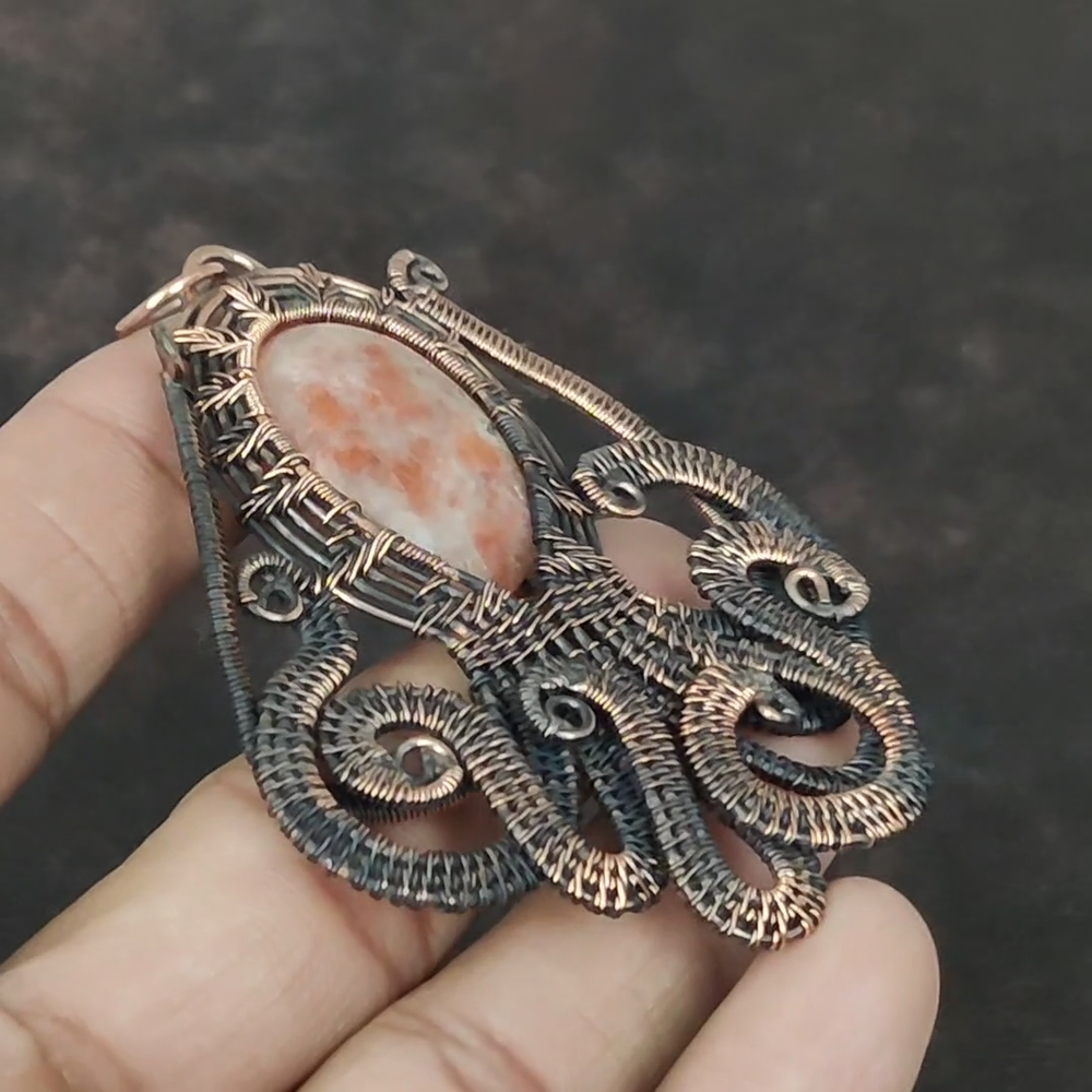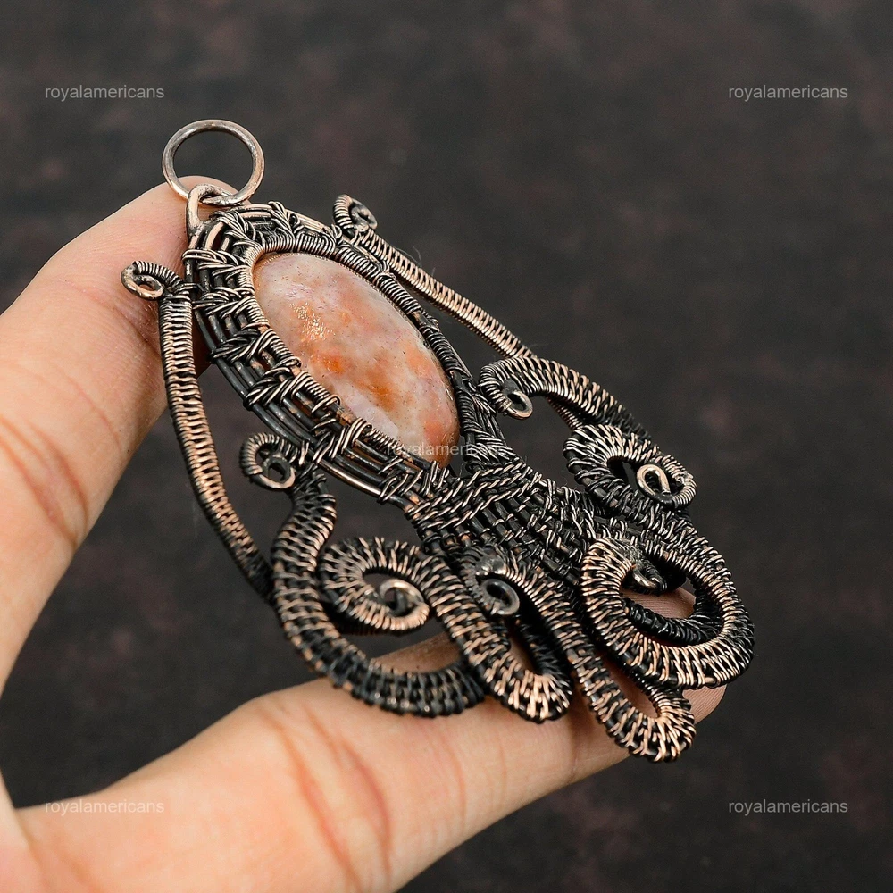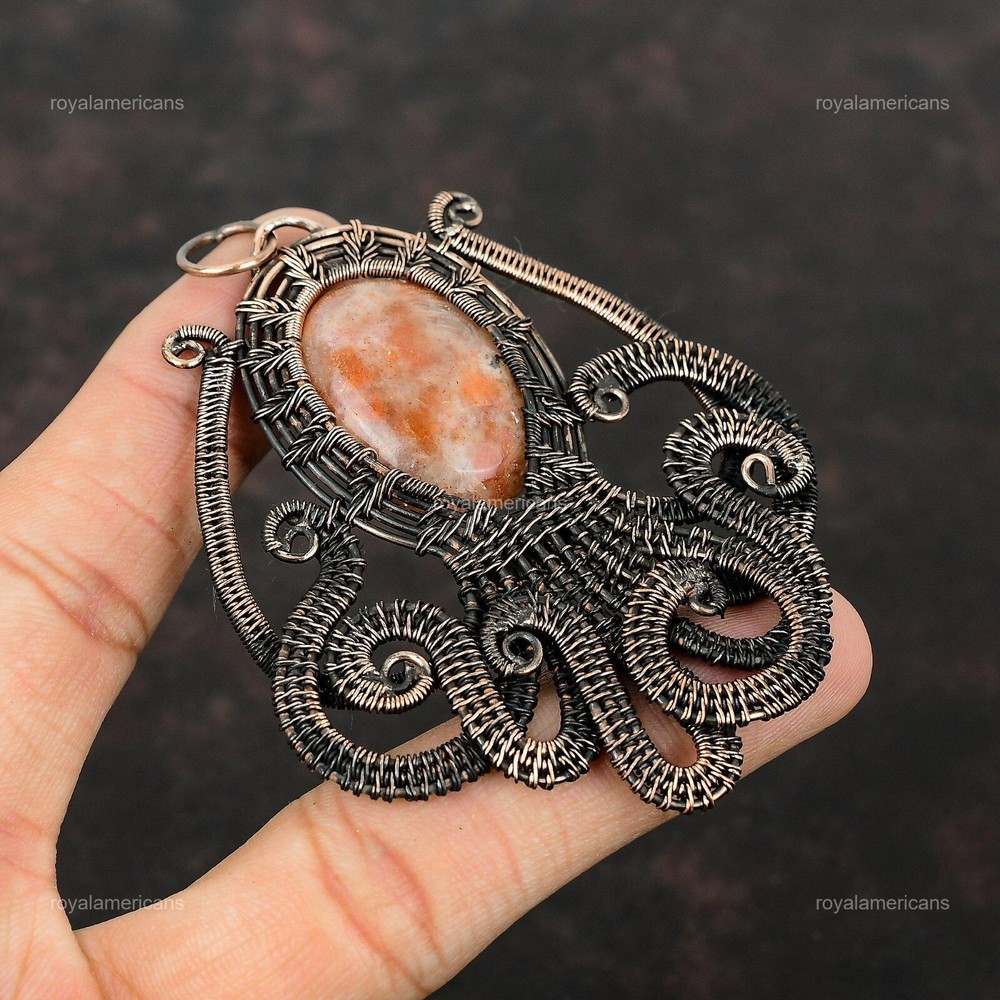 Note : Due to the natural formation of this gemstone. Slight variation in design and color are to be expected. Welcome to Royalamericans Mothers day Sale Oval Sunstone Stone Copper Wife Wire Wrap Boho Octopus Pendant Handmade Pendant, Wire Wrapped Pendant, Wire Wrapped Jewelry, Copper Pendant, Copper Wire Pendant, Wrapped Jewelry, Wire Wrap Pendant, Wire Wrap Jewelry SKU : UFWP-2005 Gemstone : Sunstone Stone Shape : Oval Metal Purity : Unknown Copper Length : 85 Millimeters Width : 67 Millimeters Copper has been used for jewelry making for thousands of years, dating back to ancient civilizations such as the Egyptians, Romans, and Aztecs. Copper was valued for its beauty, versatility, and durability, and was often used to make everything from jewelry and coins to cookware and tools. In addition to its historical significance, copper jewelry also offers several benefits. Copper is a natural conductor of heat and electricity, which makes it ideal for energy healing and therapeutic purposes. Wearing copper jewelry is believed to have various health benefits, such as improving circulation, reducing inflammation, and boosting the immune system. Some people also believe that copper jewelry has the ability to balance energy and improve mood. For Mother's Day Gift For Father's Day Gift For Promise For Valentine's Day For Halloween Party For Christmas Day Gift For New Year Party For Mom For Her If you can't find the information you need or need some advice for your design? Feel free to contact us. We are fast to reply :) All our work is made by hand with Love and Care in our workshop Thank you so much for visiting and hope you enjoy shopping with us Royalamericans is committed to delivering the best quality sterling silver jewelry to customers. As a handmade jewelry manufacturer, we offer an extensive selection of copper gemstone jewelry that showcases the brilliance of our craftsmanship. We are an experienced handmade jewelry supplier with expertise in embellishing gemstones to suit every style. We offer you the liberty to create your jewelry ensemble with sparkling, earthy, and pure gemstones. Our Talented artisans masterfully handcraft each piece of jewelry you see here. Our pieces are made with genuine gemstones.
