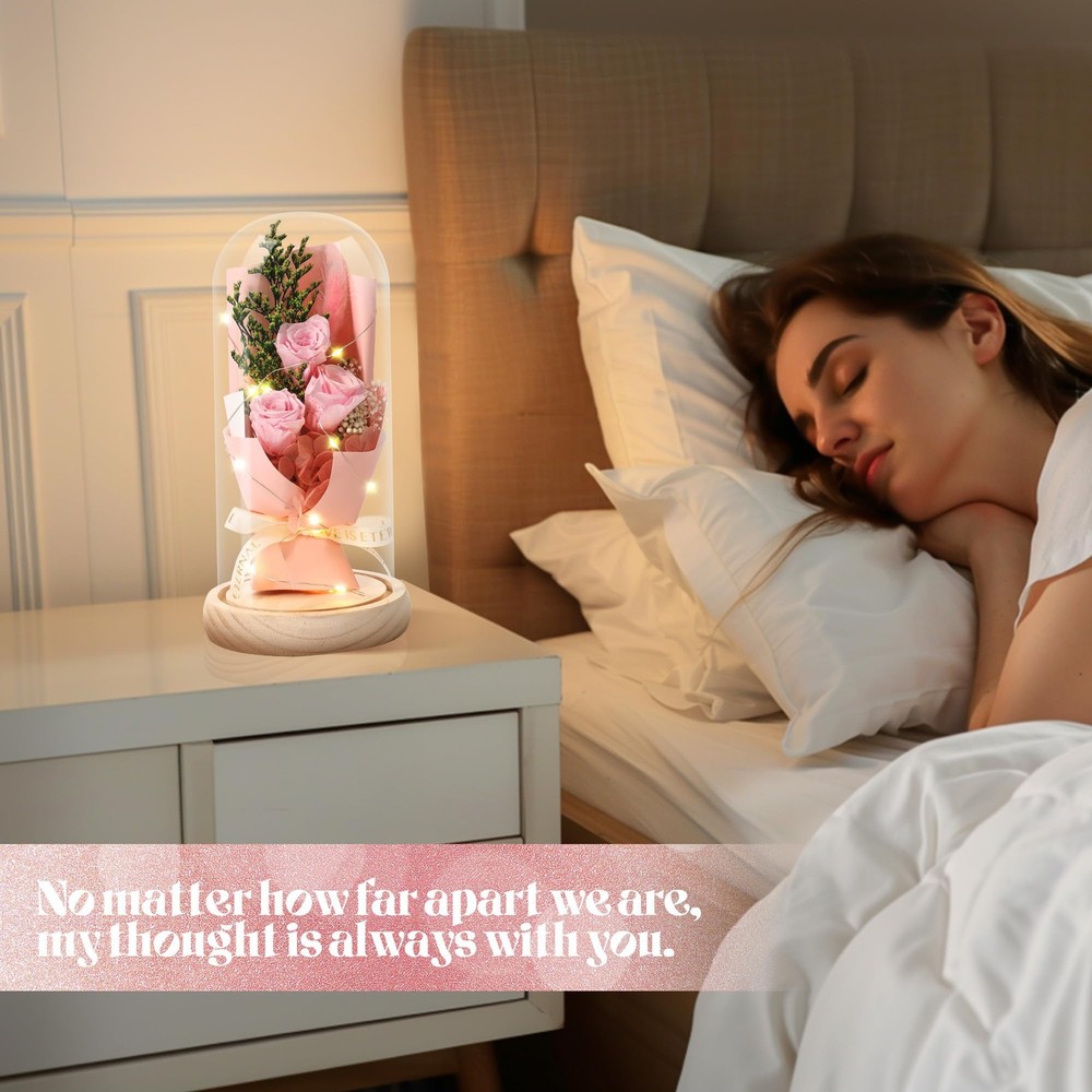 Preserved Flowers, Unique Rose Gift Forever Flower Bouquet in Glass Dome for Women and Mom, Home Decor Gifts for Birthday, Mother’s Day, Anniversary, Christmas, Wedding. 【One-of-a-kind Forever Rose Birthday Gifts for Mom】Mother' s Day Gifts Extend beauty and love, each preserved flower bouquet is made of unique roses, keep the original state for 3-5 years, same as the eternal love and beautiful her. Flowers bouquet for delivery prime 【Preserved Flower Bouquet Gifts For Mom】Mother' s Day Gifts Is not only the most popular gift in 2024 for her/wife/girlfriend/daughter/nana/mother-in-law/grandmother/godmother/sister/teacher/friend, but also a best decoration for room/home/bedroom/kitchen/aesthetic room/desk/office/table/indoor. It will be an unusual choice in your gift list on Mother's Day/Valentine's Day/graduation/anniversary/birthday/Christmas/Easter/wedding or other days when romantic is necessary. 【Special Valentine Gifts for Girlfriend Loved Ones】Mother' s Day Gifts No need daily maintenance, no cause pollen allergy, will not wither, just always beauty. Our preserved flower bouquet in glass dome are designed with warm and soft yellow LED lighting, as a decorative craft with natural elements, it can exert a positive effect on emotion and creative power, it's a gift to feel loved, choose the Forever flower for the special people, love and friendship. 【Express Your Love Mother Day Gifts for Women】Mother' s Day Gifts Roses are the symbol of love, friendship, courage, there is no better way to express your love than roses that last forever! It's an inspiring gift that will bring strength and good mood to the recipient. We offer 4 types of preserved flowers, red, purple, pink and yellow and orange mixed roses, choose gifts for your loved ones. 【Friendly Tips】1. The glass dome cannot be opened, cause that will damage the natural flowers. 2. Because it is purely handmade, the similarity of the actual objects is about 95%. 3. Avoid direct sunlight, keep dry, that will contribute to the extension of the shelf life of preserved flower.