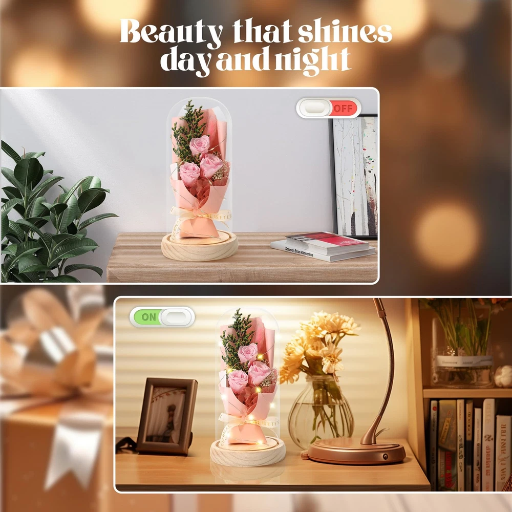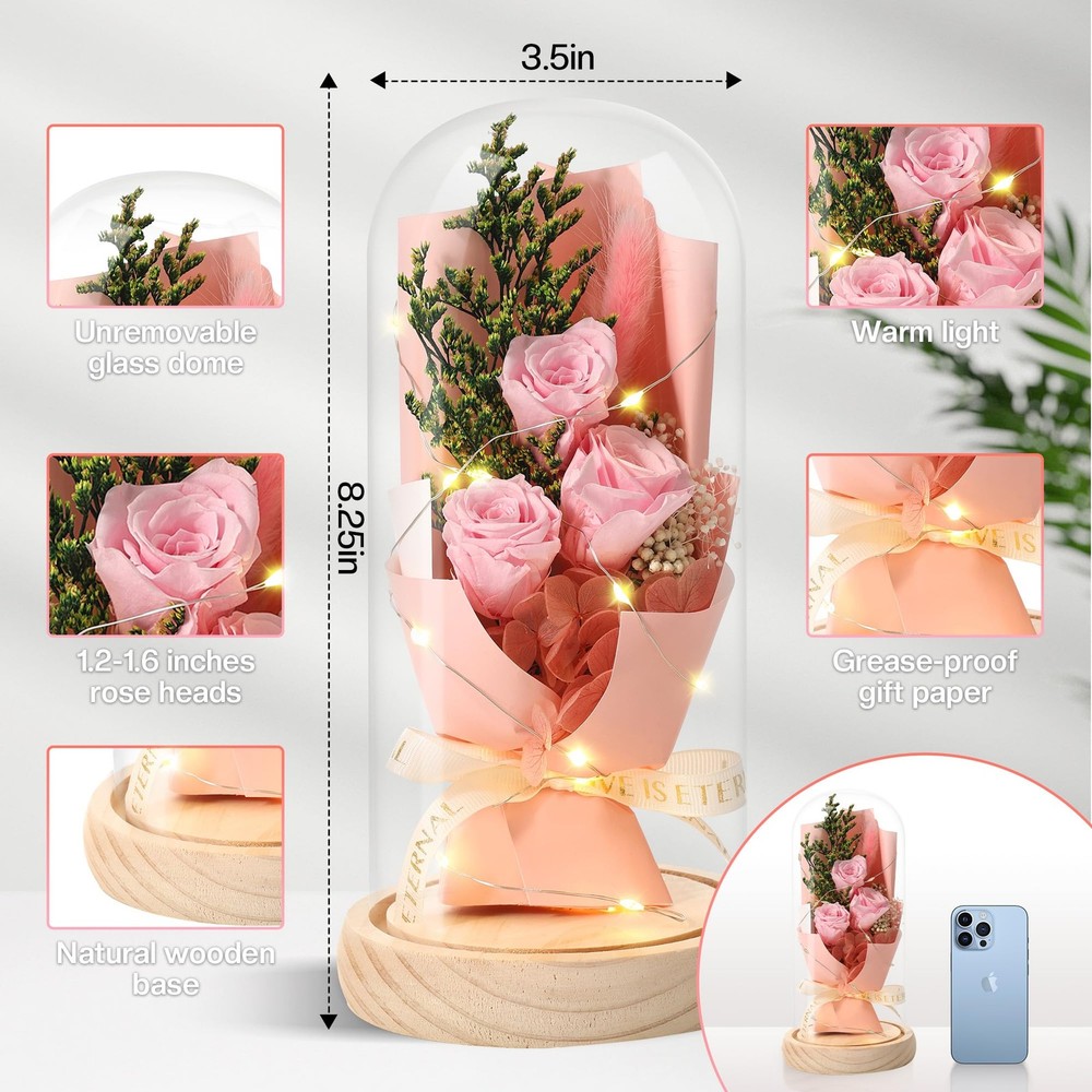 Preserved Flowers, Unique Rose Gift Forever Flower Bouquet in Glass Dome for Women and Mom, Home Decor Gifts for Birthday, Mother’s Day, Anniversary, Christmas, Wedding. 【One-of-a-kind Forever Rose Birthday Gifts for Mom】Mother' s Day Gifts Extend beauty and love, each preserved flower bouquet is made of unique roses, keep the original state for 3-5 years, same as the eternal love and beautiful her. Flowers bouquet for delivery prime 【Preserved Flower Bouquet Gifts For Mom】Mother' s Day Gifts Is not only the most popular gift in 2024 for her/wife/girlfriend/daughter/nana/mother-in-law/grandmother/godmother/sister/teacher/friend, but also a best decoration for room/home/bedroom/kitchen/aesthetic room/desk/office/table/indoor. It will be an unusual choice in your gift list on Mother's Day/Valentine's Day/graduation/anniversary/birthday/Christmas/Easter/wedding or other days when romantic is necessary. 【Special Valentine Gifts for Girlfriend Loved Ones】Mother' s Day Gifts No need daily maintenance, no cause pollen allergy, will not wither, just always beauty. Our preserved flower bouquet in glass dome are designed with warm and soft yellow LED lighting, as a decorative craft with natural elements, it can exert a positive effect on emotion and creative power, it's a gift to feel loved, choose the Forever flower for the special people, love and friendship. 【Express Your Love Mother Day Gifts for Women】Mother' s Day Gifts Roses are the symbol of love, friendship, courage, there is no better way to express your love than roses that last forever! It's an inspiring gift that will bring strength and good mood to the recipient. We offer 4 types of preserved flowers, red, purple, pink and yellow and orange mixed roses, choose gifts for your loved ones. 【Friendly Tips】1. The glass dome cannot be opened, cause that will damage the natural flowers. 2. Because it is purely handmade, the similarity of the actual objects is about 95%. 3. Avoid direct sunlight, keep dry, that will contribute to the extension of the shelf life of preserved flower.