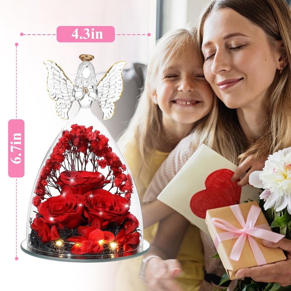 6.7 Inch Height Large Angel Figurines with Real Rose, Preserved Real Flower Rose for Valentine's Day Anniversary Christmas Angel Gifts Roses for Her, Mom, Girlfriend Patented Flower Bouquet and Angel Figurines, Forever Real Three Roses, Rose of love gifts for her: The preserved rose flower that never withers means eternal love, best gift to express love for your loved ones, romantic gift for her; Elegant Angel Figurines,Gift for Women: Angel represents best wishes,warmth and guardian, perfect gifts gifts for girlfriend,wife, fiance,mom Unique Gift,Mothers Day Gift: Angel with Rose is a symbol of love and best wishes, the angel with preserved real flower rose will be a lovely gift for Valentine's Day,Thanksgiving, Christmas, birthday, Mother's Day,anniversaries, or any other special occasions and festivals, which will show your eternal love for him or her. 【What you get】Beauty Angel Figurines with Real Rose inside,Gift Card,Gift Box,Gift for Angel Lovers and Rose Lovers,No Women Would Refuse a Gift with Love and Blessing Which Our Angel Rose Represents; Large Size,Patented Flower Bouquet Design: The diameter of the angel is 11 cm (4.33 inches) and the height is 17 cm (6.7 inches),We are the only one with Large Angels, Also got patent for the Flower Bouquet Design;