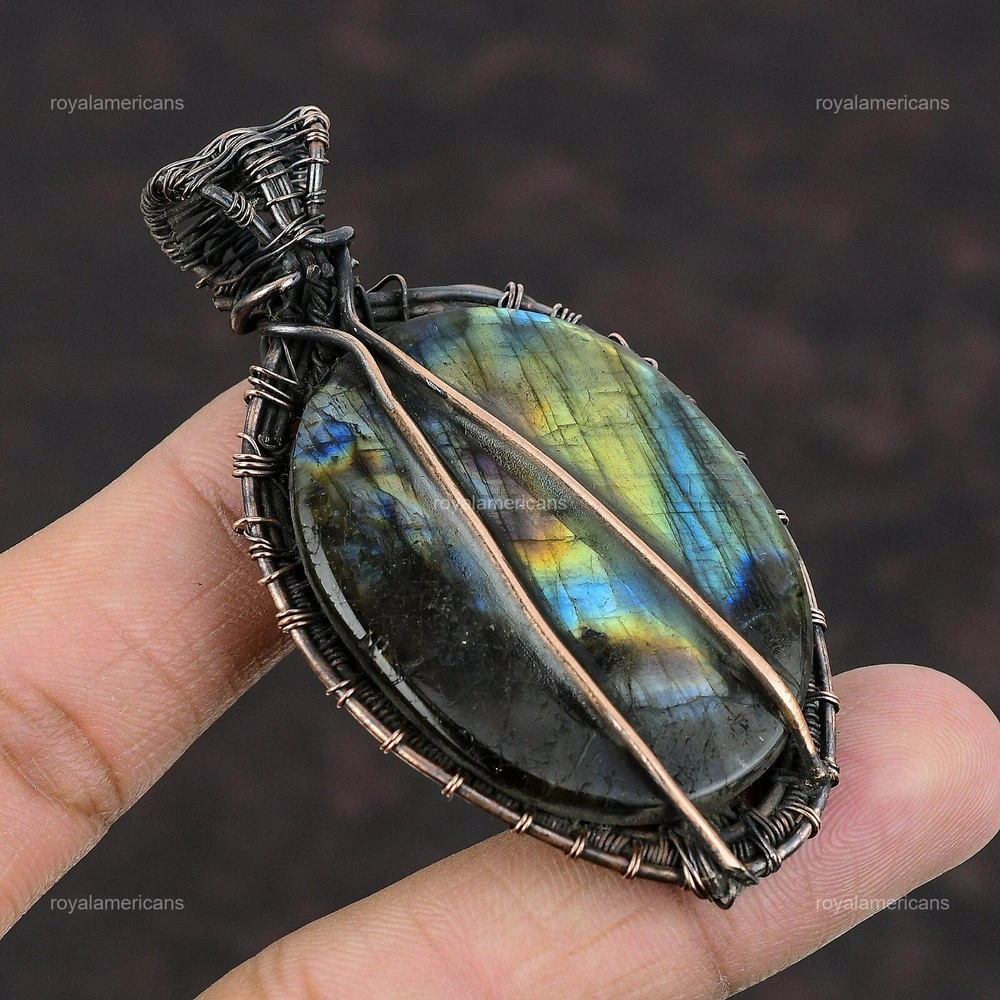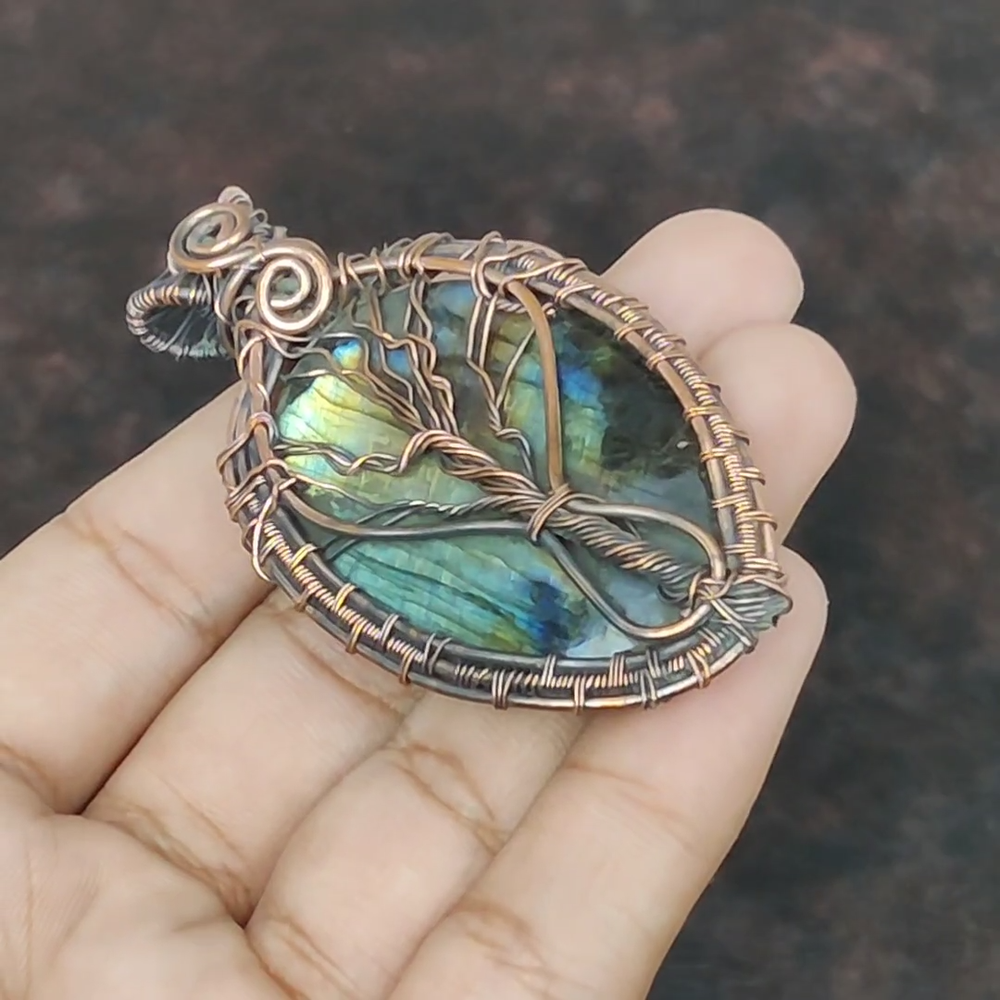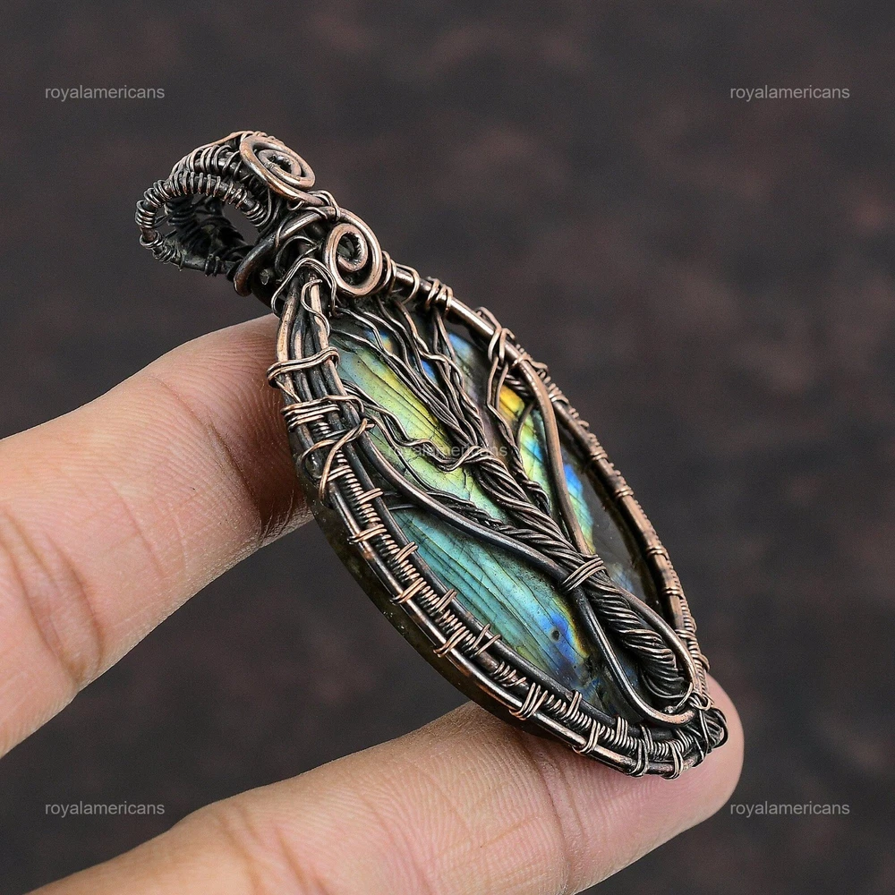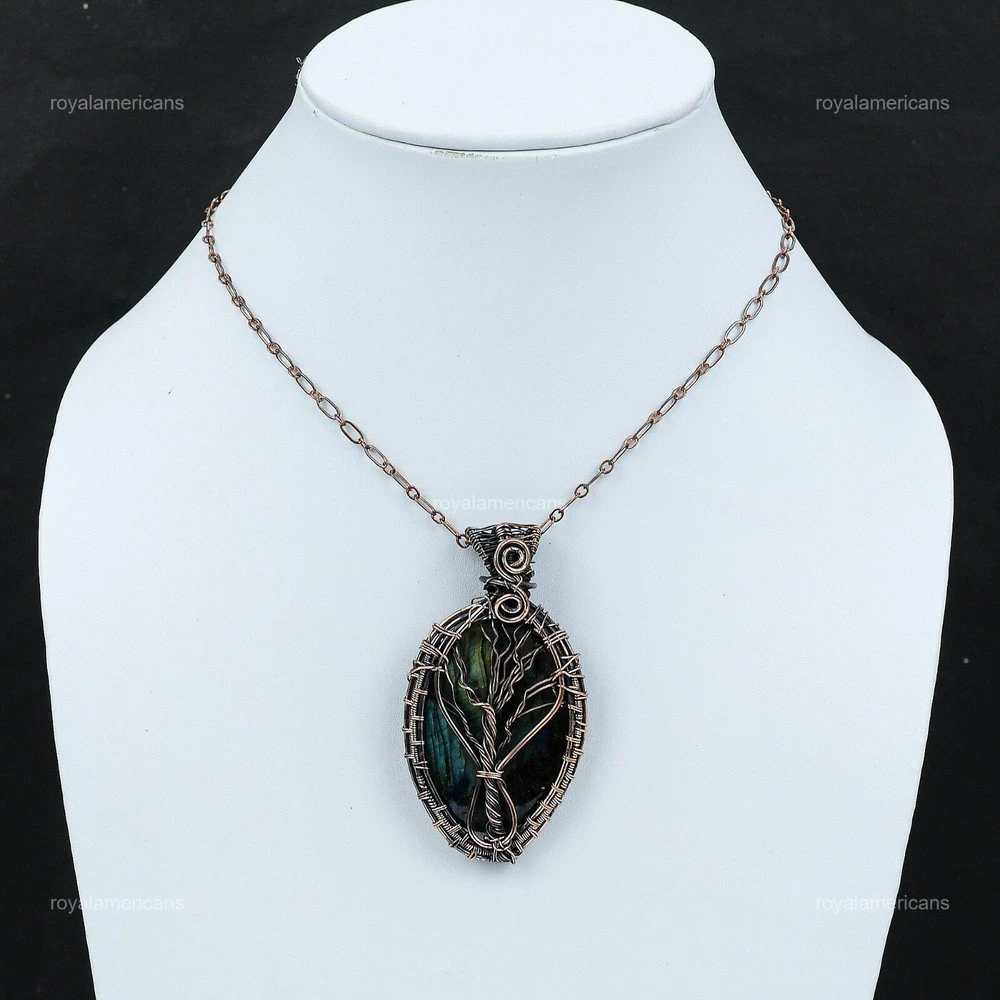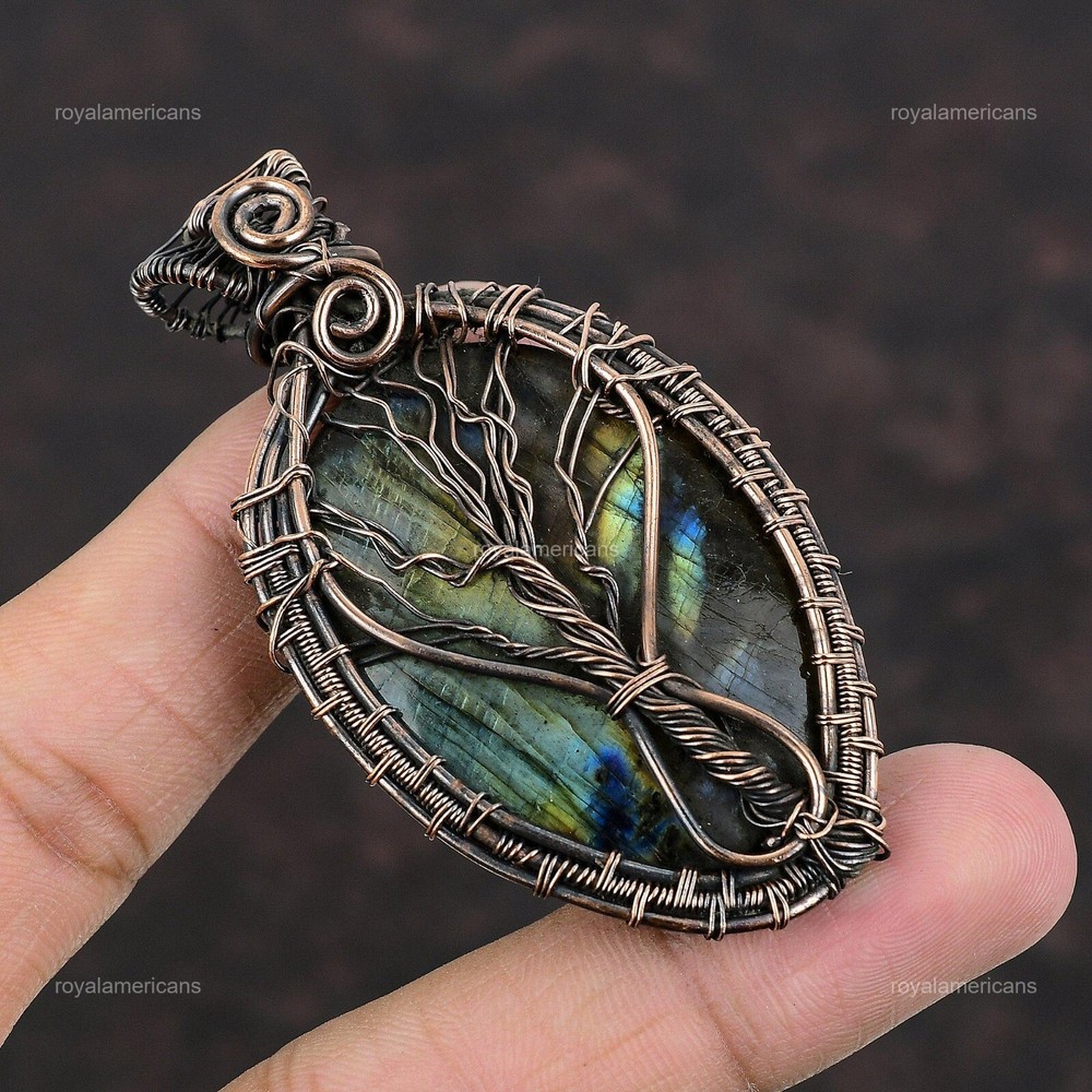 Note : Due to the natural formation of this gemstone. Slight variation in design and color are to be expected. Welcome to Royalamericans Mothers day Sale Copper Labradorite Stone Tree Of Life Sister Pendant Jewelry Handmade Pendant, Wire Wrapped Pendant, Wire Wrapped Jewelry, Copper Pendant, Copper Wire Pendant, Wrapped Jewelry, Wire Wrap Pendant, Wire Wrap Jewelry SKU : UFWP-356 Gemstone : Labradorite Stone Shape : Oval Metal Purity : Unknown Copper Length : 72 Millimeters Width : 40 Millimeters Copper has been used for jewelry making for thousands of years, dating back to ancient civilizations such as the Egyptians, Romans, and Aztecs. Copper was valued for its beauty, versatility, and durability, and was often used to make everything from jewelry and coins to cookware and tools. In addition to its historical significance, copper jewelry also offers several benefits. Copper is a natural conductor of heat and electricity, which makes it ideal for energy healing and therapeutic purposes. Wearing copper jewelry is believed to have various health benefits, such as improving circulation, reducing inflammation, and boosting the immune system. Some people also believe that copper jewelry has the ability to balance energy and improve mood. For Mother's Day Gift For Father's Day Gift For Promise For Valentine's Day For Halloween Party For Christmas Day Gift For New Year Party For Mom For Her If you can't find the information you need or need some advice for your design? Feel free to contact us. We are fast to reply :) All our work is made by hand with Love and Care in our workshop Thank you so much for visiting and hope you enjoy shopping with us Royalamericans is committed to delivering the best quality sterling silver jewelry to customers. As a handmade jewelry manufacturer, we offer an extensive selection of copper gemstone jewelry that showcases the brilliance of our craftsmanship. We are an experienced handmade jewelry supplier with expertise in embellishing gemstones to suit every style. We offer you the liberty to create your jewelry ensemble with sparkling, earthy, and pure gemstones. Our Talented artisans masterfully handcraft each piece of jewelry you see here. Our pieces are made with genuine gemstones.