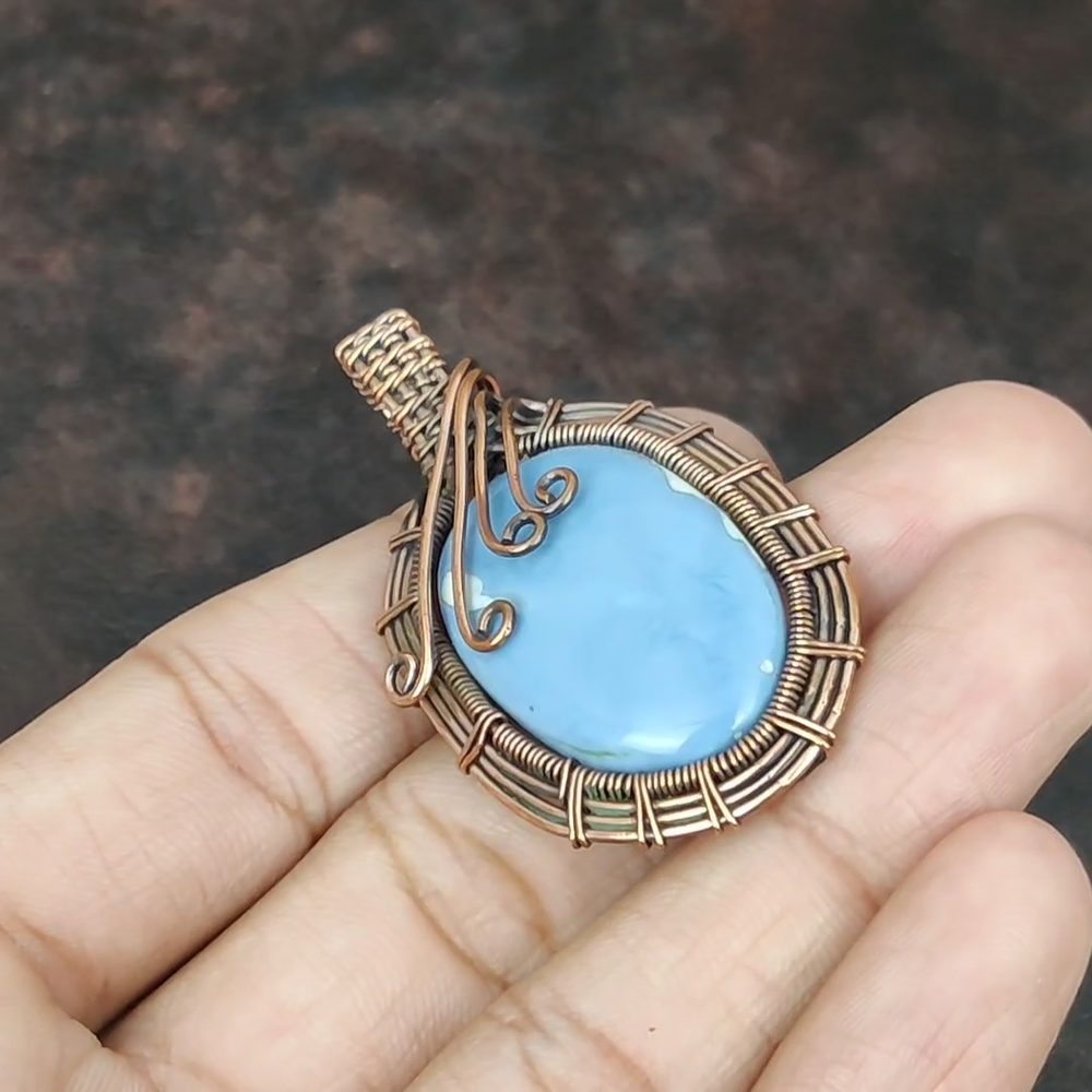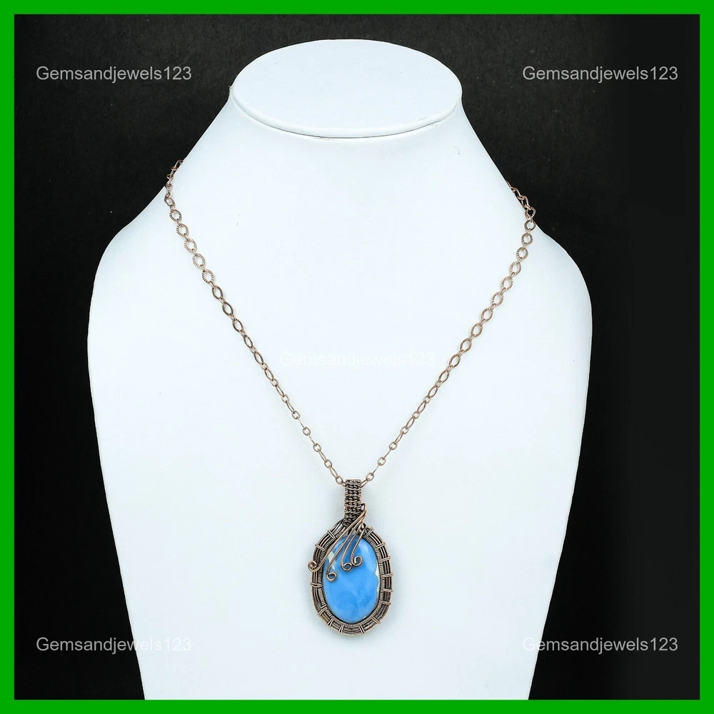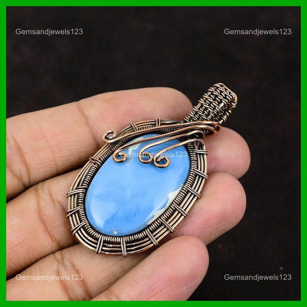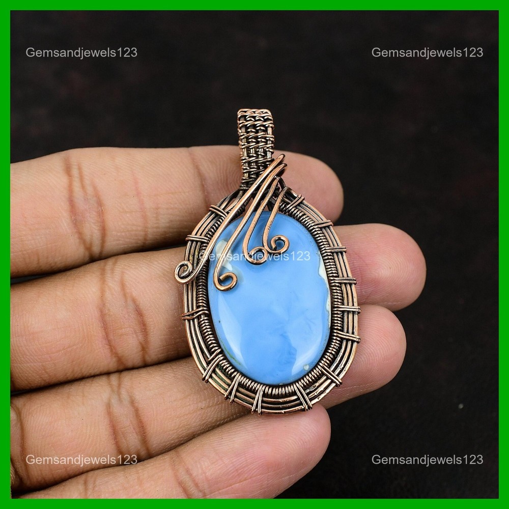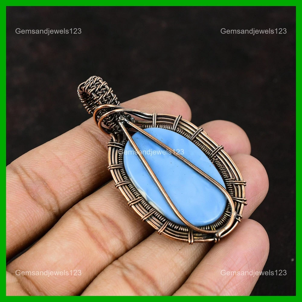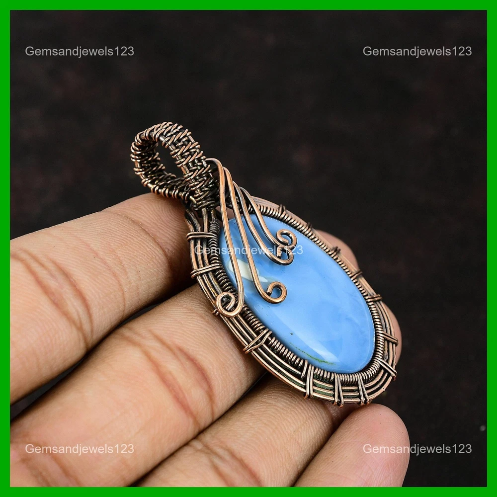 Note : Due to the natural formation of this gemstone. Slight Variation in design and color are to be expected. Welcome to gemsandjewels123 Mothers day Sale Copper Natural Owyhee Blue Opal Wire Wrapped Pendant Jewelry Handmade Pendant, Wire Wrapped Pendant, Wire Wrapped Jewelry, Copper Pendant, Copper Wire Pendant, Wrapped Jewelry, Wire Wrap Pendant, Wire Wrap Jewelry SKU : FWP-229 Gemstone : Owyhee Blue Opal Stone Shape : Oval Metal Purity : Unknown Copper Length : 60 Millimeters Width : 30 Millimeters Copper has been used for jewelry making for thousands of years, dating back to ancient civilizations such as the Egyptians, Romans, and Aztecs. Copper was valued for its beauty, versatility, and durability, and was often used to make everything from jewelry and coins to cookware and tools. In addition to its historical significance, copper jewelry also offers several benefits. Copper is a natural conductor of heat and electricity, which makes it ideal for energy healing and therapeutic purposes. Wearing copper jewelry is believed to have various health benefits, such as improving circulation, reducing inflammation, and boosting the immune system. Some people also believe that copper jewelry has the ability to balance energy and improve mood. For Mother's Day Gift For Father's Day Gift For Promise For Valentine's Day For Halloween Party For Christmas Day Gift For New Year Party For Mom For Her If you can't find the information you need or need some advice for your design? Feel free to contact us. We are fast to reply :) All our work is made by hand with Love and Care in our workshop Thank you so much for visiting and hope you enjoy shopping with us gemsandjewels123 is committed to delivering the best quality sterling silver jewelry to customers. As a handmade jewelry manufacturer, we offer an extensive selection of copper gemstone jewelry that showcases the brilliance of our craftsmanship. We are an experienced handmade jewelry supplier with expertise in embellishing gemstones to suit every style. We offer you the liberty to create your jewelry ensemble with sparkling, earthy, and pure gemstones. Our Talented artisans masterfully handcraft each piece of jewelry you see here. Our pieces are made with genuine gemstones. The one-of-a-kind piece you see here is the same exact piece you will receive.