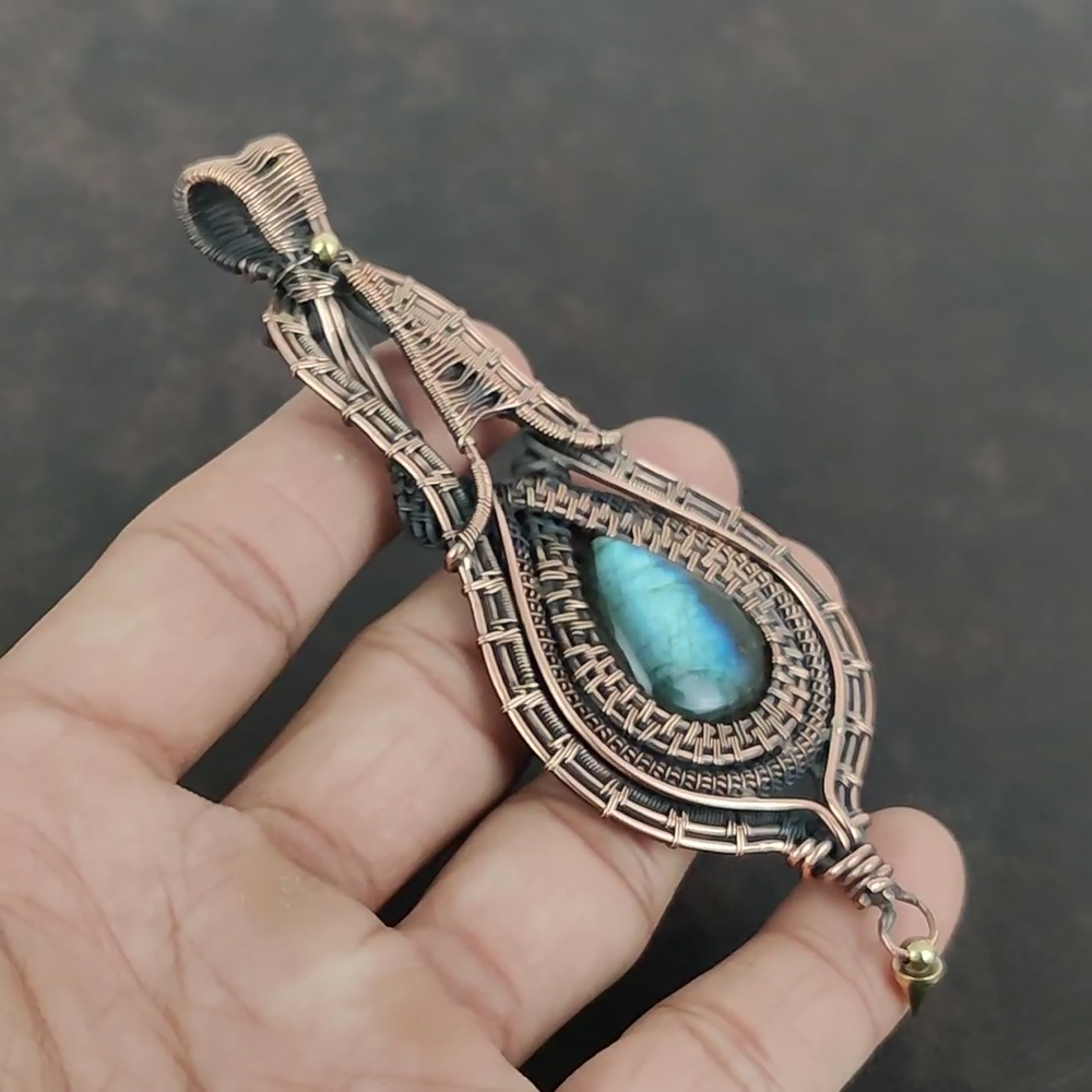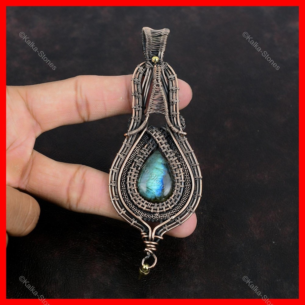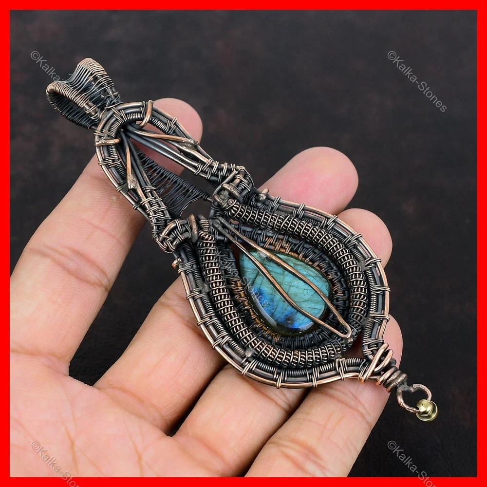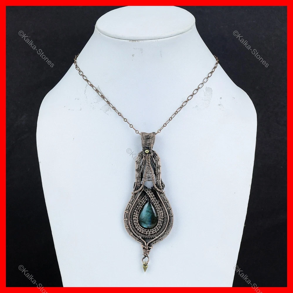 Note : Due to the natural formation of this gemstone. Slight variation in design and color are to be expected. Welcome to Kalka Stones Mothers day Sale Copper Pear Labradorite Gemstone Wire Wrapped Pendant Jewelry Handmade Pendant, Wire Wrapped Pendant, Wire Wrapped Jewelry, Copper Pendant, Copper Wire Pendant, Wrapped Jewelry, Wire Wrap Pendant, Wire Wrap Jewelry SKU : VFWP-4606 Gemstone : Labradorite Stone Shape : Pear Metal Purity : Unknown Copper Length : 123 Millimeters Width : 45 Millimeters Copper has been used for jewelry making for thousands of years, dating back to ancient civilizations such as the Egyptians, Romans, and Aztecs. Copper was valued for its beauty, versatility, and durability, and was often used to make everything from jewelry and coins to cookware and tools. In addition to its historical significance, copper jewelry also offers several benefits. Copper is a natural conductor of heat and electricity, which makes it ideal for energy healing and therapeutic purposes. Wearing copper jewelry is believed to have various health benefits, such as improving circulation, reducing inflammation, and boosting the immune system. Some people also believe that copper jewelry has the ability to balance energy and improve mood. For Mother's Day Gift For Father's Day Gift For Promise For Valentine's Day For Halloween Party For Christmas Day Gift For New Year Party For Mom For Her If you can't find the information you need or need some advice for your design? Feel free to contact us. We are fast to reply :) All our work is made by hand with Love and Care in our workshop Thank you so much for visiting and hope you enjoy shopping with us Kalka Stones is committed to delivering the best quality jewelry to customers. As a handmade jewelry manufacturer, we offer an extensive selection of copper gemstone jewelry that showcases the brilliance of our craftsmanship. We are an experienced handmade jewelry supplier with expertise in embellishing gemstones to suit every style. We offer you the liberty to create your jewelry ensemble with sparkling, earthy, and pure gemstones. Our Talented artisans masterfully handcraft each piece of jewelry you see here. Our pieces are made with genuine gemstones.