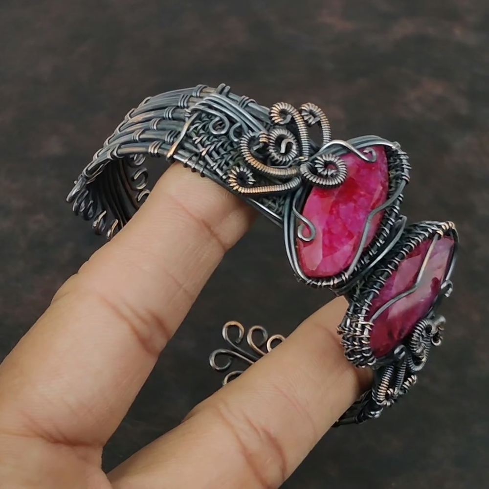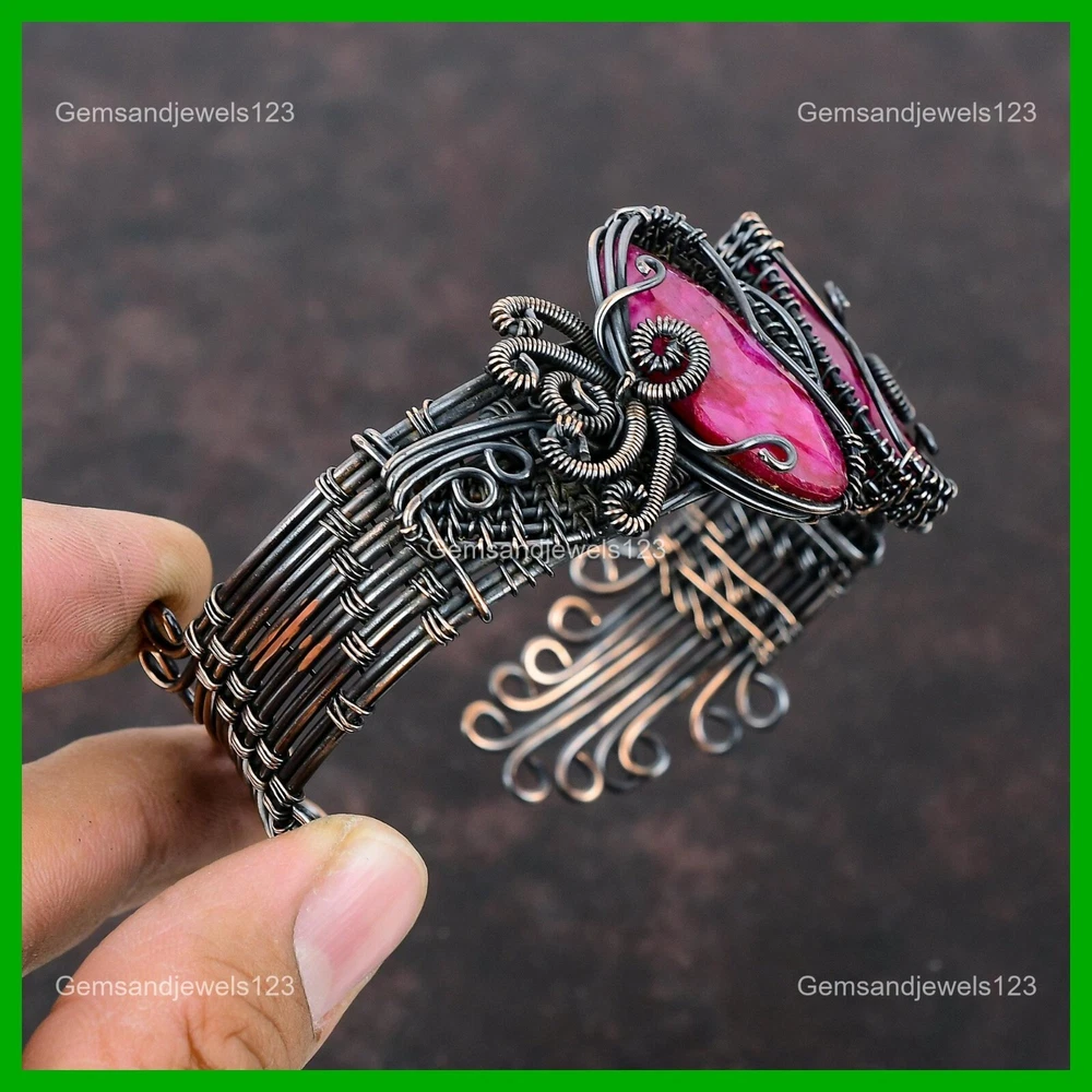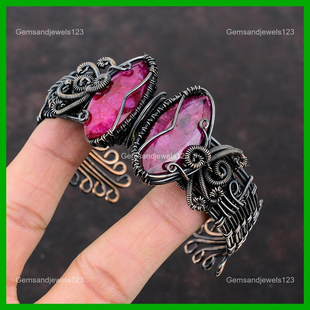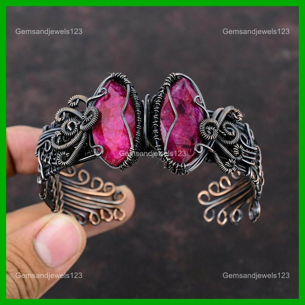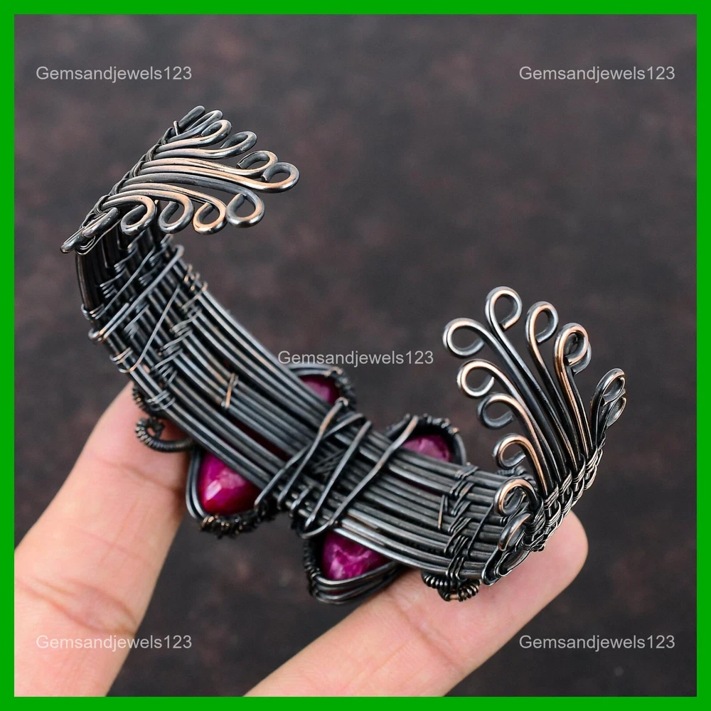 Note : Due to the natural formation of this gemstone. Slight Variation in design and color are to be expected. Welcome to gemsandjewels123 Mothers day Sale Natural Faceted Kashmir Rubi Copper Wire Wrapped Bangle Jewelry Handmade Bangle, Wire Wrapped Bangle, Wire Wrapped Jewelry, Copper Pendant, Copper Wire Bangle, Wrapped Jewelry, Wire Wrap Bangle, Wire Wrap Jewelry SKU : VFWC-162 Gemstone : Faceted Kashmir Rubi Stone Shape : Marquise Metal Purity : Unknown Copper Bangle Length : Adjustable Copper has been used for jewelry making for thousands of years, dating back to ancient civilizations such as the Egyptians, Romans, and Aztecs. Copper was valued for its beauty, versatility, and durability, and was often used to make everything from jewelry and coins to cookware and tools. In addition to its historical significance, copper jewelry also offers several benefits. Copper is a natural conductor of heat and electricity, which makes it ideal for energy healing and therapeutic purposes. Wearing copper jewelry is believed to have various health benefits, such as improving circulation, reducing inflammation, and boosting the immune system. Some people also believe that copper jewelry has the ability to balance energy and improve mood. For Mother's Day Gift For Father's Day Gift For Promise For Valentine's Day For Halloween Party For Christmas Day Gift For New Year Party For Mom For Her If you can't find the information you need or need some advice for your design? Feel free to contact us. We are fast to reply :) All our work is made by hand with Love and Care in our workshop Thank you so much for visiting and hope you enjoy shopping with us gemsandjewels123 is committed to delivering the best quality sterling silver jewelry to customers. As a handmade jewelry manufacturer, we offer an extensive selection of copper gemstone jewelry that showcases the brilliance of our craftsmanship. We are an experienced handmade jewelry supplier with expertise in embellishing gemstones to suit every style. We offer you the liberty to create your jewelry ensemble with sparkling, earthy, and pure gemstones. Our Talented artisans masterfully handcraft each piece of jewelry you see here. Our pieces are made with genuine gemstones. The one-of-a-kind piece you see here is the same exact piece you will receive.