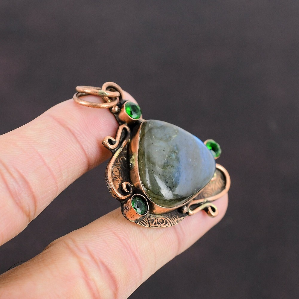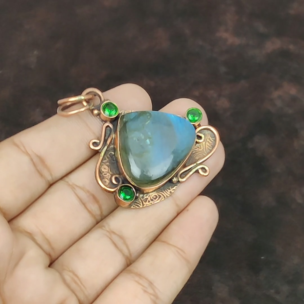Note : Due to the natural formation of this gemstone. Slight variation in design and color are to be expected. Welcome to Silver Creation Mothers day Sale Copper Natural Labradorite Chrome Diopside Handcrafted Pendant Handmade Pendant, Wire Wrapped Pendant, Wire Wrapped Jewelry, Copper Pendant, Copper Wire Pendant, Wrapped Jewelry, Wire Wrap Pendant, Wire Wrap Jewelry SKU : WP-416 Stone Shape : Pear Metal Purity : Unknown Copper Length : 50 Millimeters Width : 42 Millimeters Copper has been used for jewelry making for thousands of years, dating back to ancient civilizations such as the Egyptians, Romans, and Aztecs. Copper was valued for its beauty, versatility, and durability, and was often used to make everything from jewelry and coins to cookware and tools. In addition to its historical significance, copper jewelry also offers several benefits. Copper is a natural conductor of heat and electricity, which makes it ideal for energy healing and therapeutic purposes. Wearing copper jewelry is believed to have various health benefits, such as improving circulation, reducing inflammation, and boosting the immune system. Some people also believe that copper jewelry has the ability to balance energy and improve mood. For Mother's Day Gift For Father's Day Gift For Promise For Valentine' Day For Halloween Party For Christmas Day Gift For New Year Party For Mom For Her If you can't find the information you need or need some advice for your design? Feel free to contact us. We are fast to reply :) All our work is made by hand with Love and Care in our workshop Thank you so much for visiting and hope you enjoy shopping with us Silvercreations is committed to delivering the best quality sterling silver jewelry to customers. As a handmade jewelry manufacturer, we offer an extensive selection of copper gemstone jewelry that showcases the brilliance of our craftsmanship. We are an experienced handmade jewelry supplier with expertise in embellishing gemstones to suit every style. We offer you the liberty to create your jewelry ensemble with sparkling, earthy, and pure gemstones. Our Talented artisans masterfully handcraft each piece of jewelry you see here. Our pieces are made with genuine gemstones.