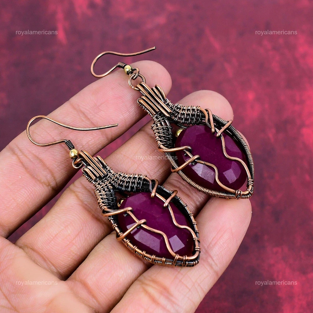 Note : Due to the natural formation of this gemstone. Slight variation in design and color are to be expected. Welcome to Royalamericans Mothers day Sale Kashmir Rubi Gemstone Boho Dangle Wire Wrapped Earrings Copper Handmade Earrings, Wire Wrapped Earrings, Wire Wrapped Jewelry, Copper Pendant, Copper Wire Earrings, Wrapped Jewelry, Wire Wrap Earrings, Wire Wrap Jewelry SKU : AE-26 Gemstone : Kashmir Rubi Stone Shape : Oval Metal Purity : Unknown Copper Length : 73 Millimeters Width : 23 Millimeters Copper has been used for jewelry making for thousands of years, dating back to ancient civilizations such as the Egyptians, Romans, and Aztecs. Copper was valued for its beauty, versatility, and durability, and was often used to make everything from jewelry and coins to cookware and tools. In addition to its historical significance, copper jewelry also offers several benefits. Copper is a natural conductor of heat and electricity, which makes it ideal for energy healing and therapeutic purposes. Wearing copper jewelry is believed to have various health benefits, such as improving circulation, reducing inflammation, and boosting the immune system. Some people also believe that copper jewelry has the ability to balance energy and improve mood. For Mother's Day Gift For Father's Day Gift For Promise For Valentine's Day For Halloween Party For Christmas Day Gift For New Year Party For Mom For Her If you can't find the information you need or need some advice for your design? Feel free to contact us. We are fast to reply :) All our work is made by hand with Love and Care in our workshop Thank you so much for visiting and hope you enjoy shopping with us Royalamericans is committed to delivering the best quality sterling silver jewelry to customers. As a handmade jewelry manufacturer, we offer an extensive selection of copper gemstone jewelry that showcases the brilliance of our craftsmanship. We are an experienced handmade jewelry supplier with expertise in embellishing gemstones to suit every style. We offer you the liberty to create your jewelry ensemble with sparkling, earthy, and pure gemstones. Our Talented artisans masterfully handcraft each piece of jewelry you see here. Our pieces are made with genuine gemstones.