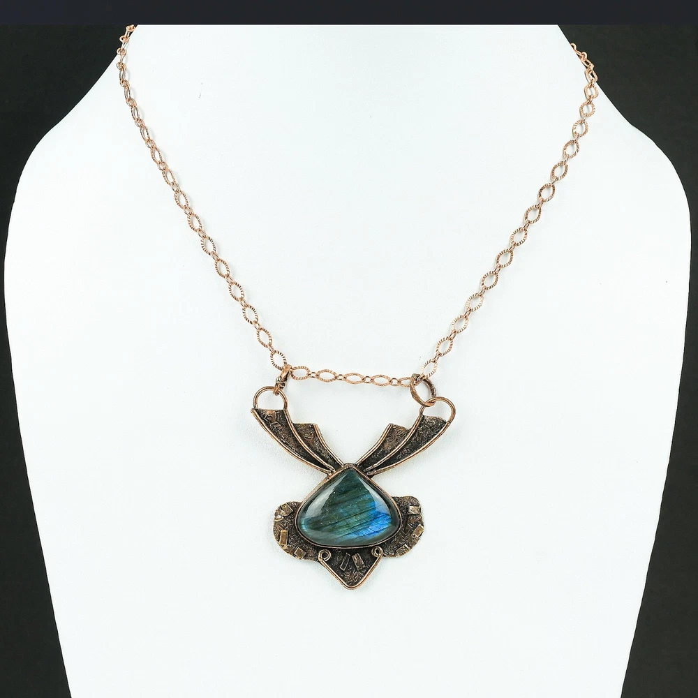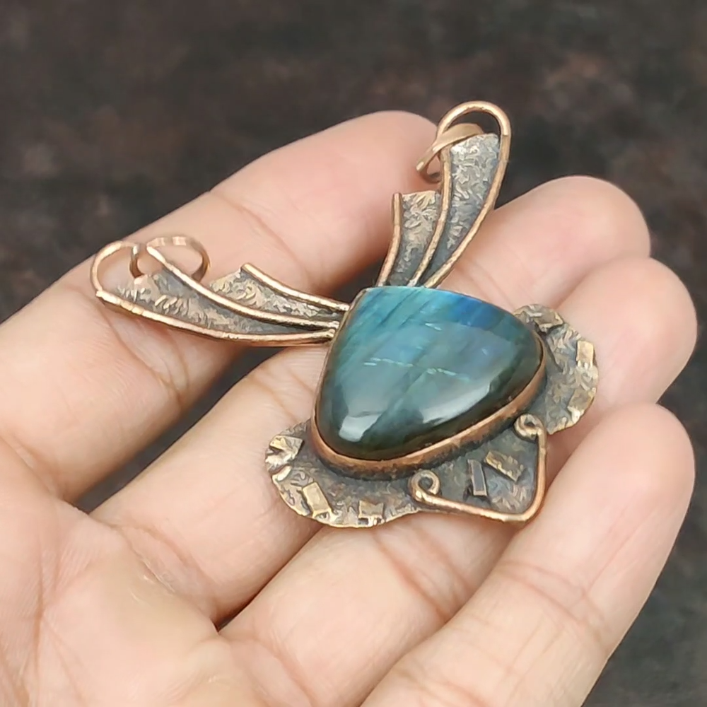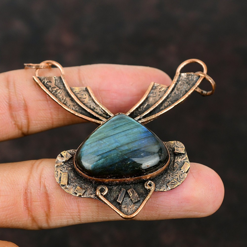 Note : Due to the natural formation of this gemstone. Slight variation in design and color are to be expected. Welcome to Silver Creation Mothers day Sale Pear Labradorite Stone Copper Third Eye Chakra Pendant Jewelry Handmade Pendant, Wire Wrapped Pendant, Wire Wrapped Jewelry, Copper Pendant, Copper Wire Pendant, Wrapped Jewelry, Wire Wrap Pendant, Wire Wrap Jewelry SKU : WP-12 Stone Shape : Pear Metal Purity : Unknown Copper Length : 70 Millimeters Width : 57 Millimeters Copper has been used for jewelry making for thousands of years, dating back to ancient civilizations such as the Egyptians, Romans, and Aztecs. Copper was valued for its beauty, versatility, and durability, and was often used to make everything from jewelry and coins to cookware and tools. In addition to its historical significance, copper jewelry also offers several benefits. Copper is a natural conductor of heat and electricity, which makes it ideal for energy healing and therapeutic purposes. Wearing copper jewelry is believed to have various health benefits, such as improving circulation, reducing inflammation, and boosting the immune system. Some people also believe that copper jewelry has the ability to balance energy and improve mood. For Mother's Day Gift For Father's Day Gift For Promise For Valentine' Day For Halloween Party For Christmas Day Gift For New Year Party For Mom For Her If you can't find the information you need or need some advice for your design? Feel free to contact us. We are fast to reply :) All our work is made by hand with Love and Care in our workshop Thank you so much for visiting and hope you enjoy shopping with us Silvercreations is committed to delivering the best quality sterling silver jewelry to customers. As a handmade jewelry manufacturer, we offer an extensive selection of copper gemstone jewelry that showcases the brilliance of our craftsmanship. We are an experienced handmade jewelry supplier with expertise in embellishing gemstones to suit every style. We offer you the liberty to create your jewelry ensemble with sparkling, earthy, and pure gemstones. Our Talented artisans masterfully handcraft each piece of jewelry you see here. Our pieces are made with genuine gemstones.