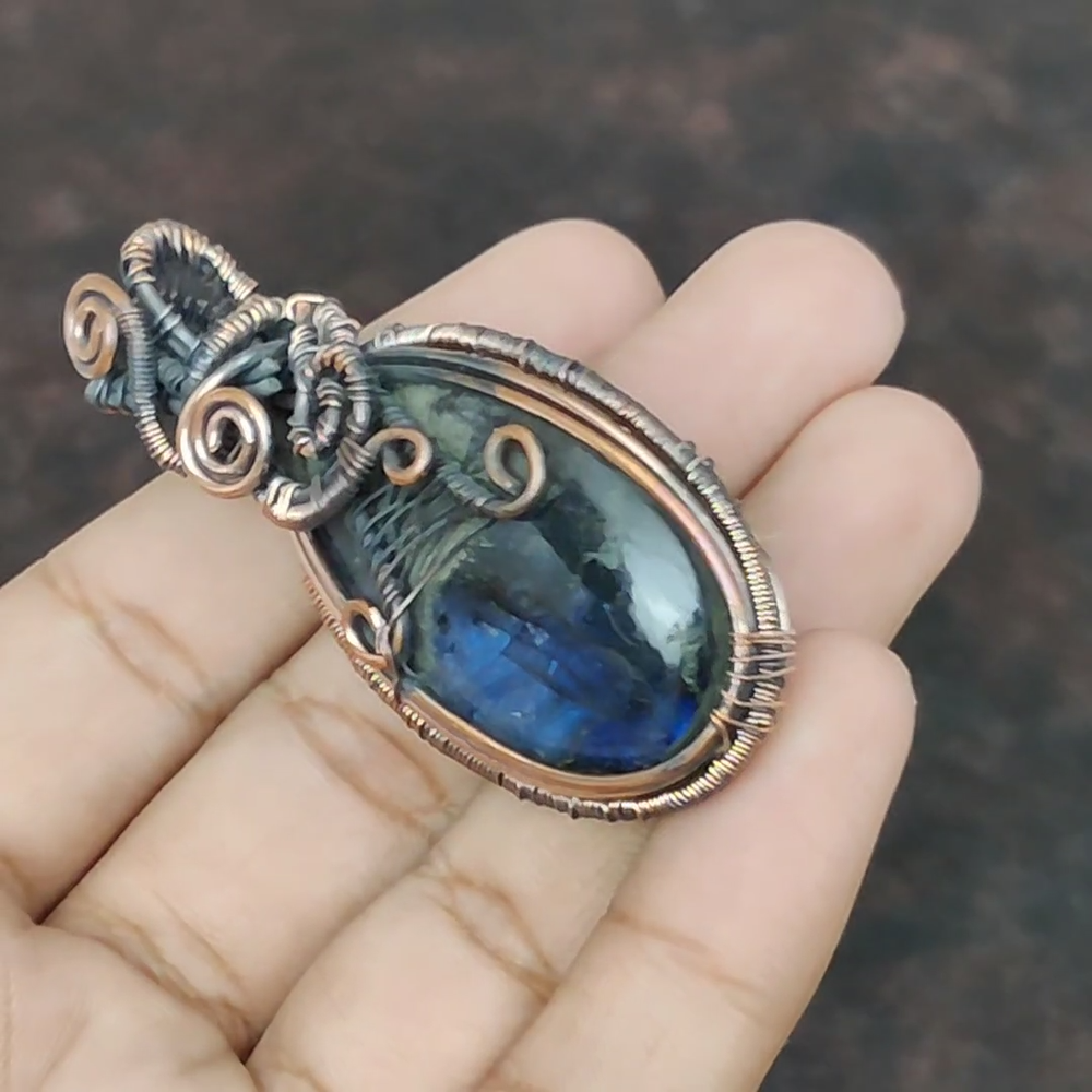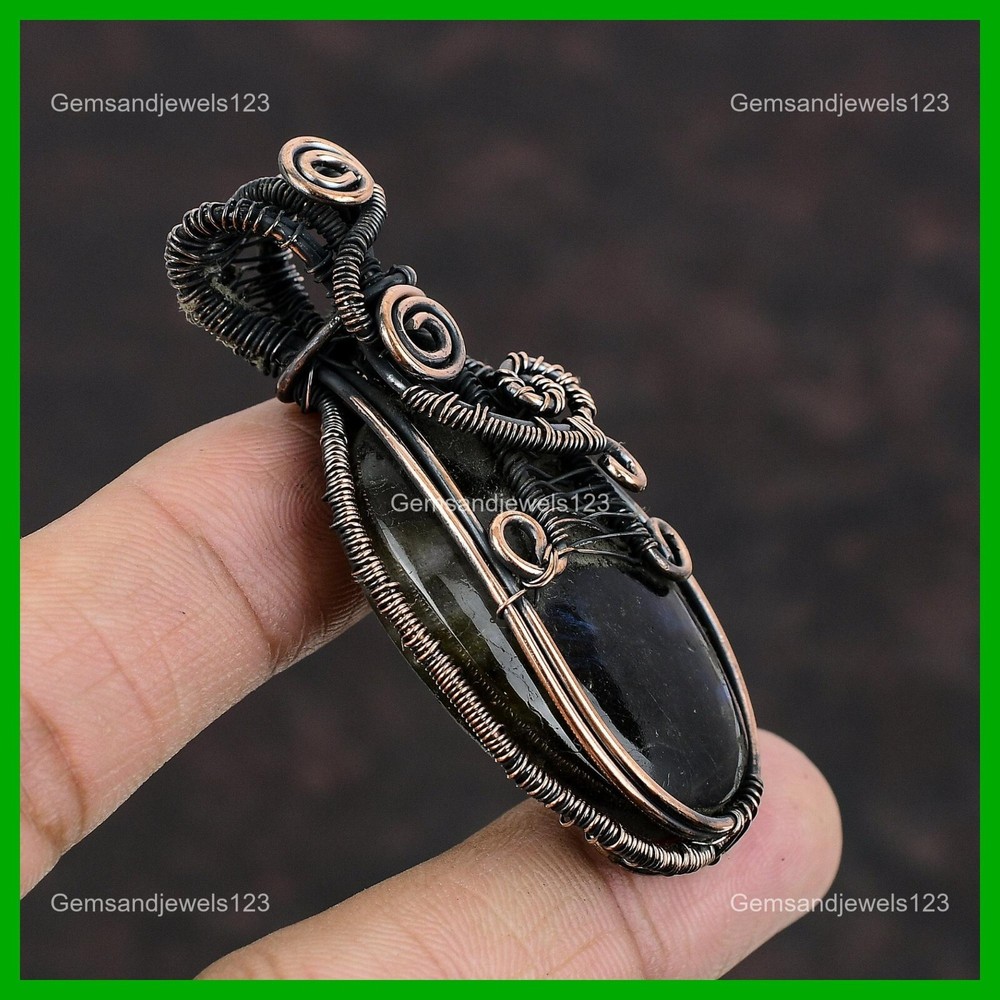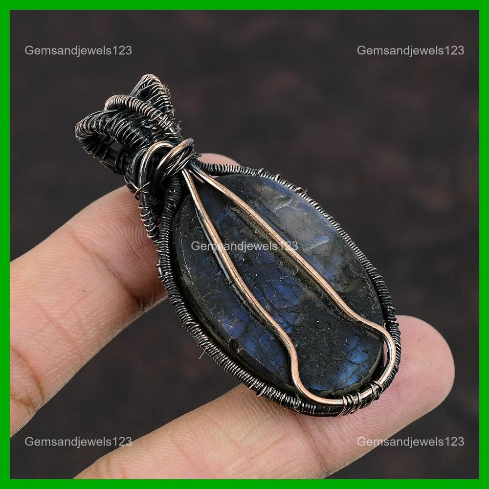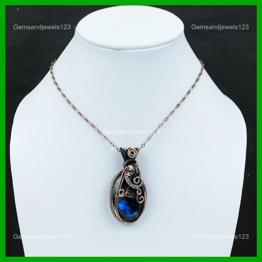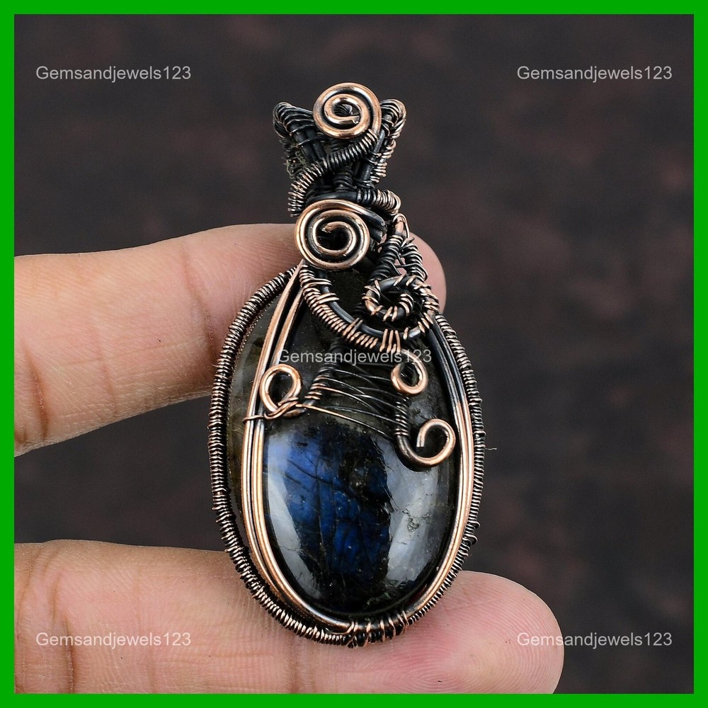 Note : Due to the natural formation of this gemstone. Slight Variation in design and color are to be expected. Welcome to gemsandjewels123 Mothers day Sale Oval Natural Labradorite Wire Wrapped Pendant Jewelry Copper Handmade Pendant, Wire Wrapped Pendant, Wire Wrapped Jewelry, Copper Pendant, Copper Wire Pendant, Wrapped Jewelry, Wire Wrap Pendant, Wire Wrap Jewelry SKU : VFWP-342 Gemstone : Labradorite Stone Shape : Oval Metal Purity : Unknown Copper Length : 63 Millimeters Width : 30 Millimeters Copper has been used for jewelry making for thousands of years, dating back to ancient civilizations such as the Egyptians, Romans, and Aztecs. Copper was valued for its beauty, versatility, and durability, and was often used to make everything from jewelry and coins to cookware and tools. In addition to its historical significance, copper jewelry also offers several benefits. Copper is a natural conductor of heat and electricity, which makes it ideal for energy healing and therapeutic purposes. Wearing copper jewelry is believed to have various health benefits, such as improving circulation, reducing inflammation, and boosting the immune system. Some people also believe that copper jewelry has the ability to balance energy and improve mood. For Mother's Day Gift For Father's Day Gift For Promise For Valentine's Day For Halloween Party For Christmas Day Gift For New Year Party For Mom For Her If you can't find the information you need or need some advice for your design? Feel free to contact us. We are fast to reply :) All our work is made by hand with Love and Care in our workshop Thank you so much for visiting and hope you enjoy shopping with us gemsandjewels123 is committed to delivering the best quality sterling silver jewelry to customers. As a handmade jewelry manufacturer, we offer an extensive selection of copper gemstone jewelry that showcases the brilliance of our craftsmanship. We are an experienced handmade jewelry supplier with expertise in embellishing gemstones to suit every style. We offer you the liberty to create your jewelry ensemble with sparkling, earthy, and pure gemstones. Our Talented artisans masterfully handcraft each piece of jewelry you see here. Our pieces are made with genuine gemstones. The one-of-a-kind piece you see here is the same exact piece you will receive.
