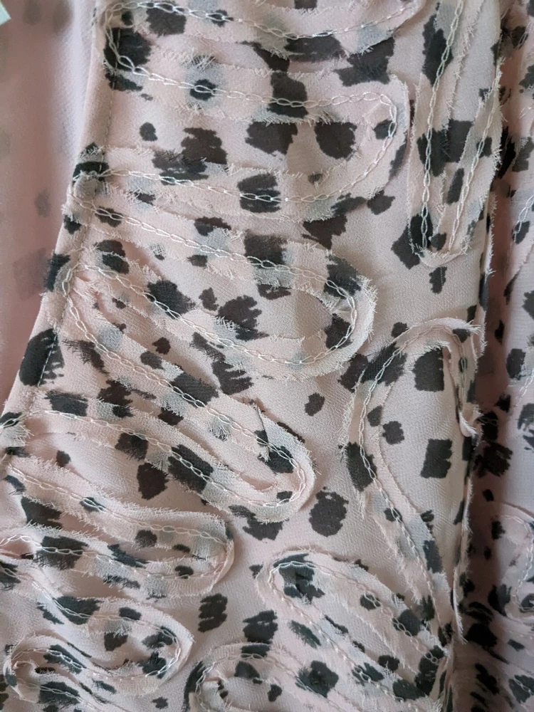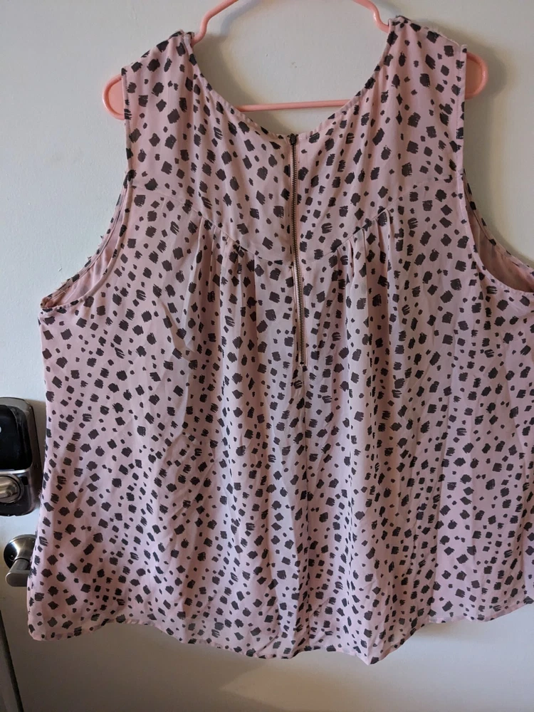 This Sejour blouse in size 24W features a striking soft pink sheer background with a gray & brown animal print, a V-neckline, and a sleeveless design. It also has a 10" zipper for closure. The relaxed fit and 100% polyester material make it comfortable for any occasion, including travel, party/cocktail, casual, workwear, or business. The blouse is perfect for spring and summer and would be a great addition to any wardrobe. It has a basic style with a fun animal print theme, and it is not considered vintage. The brand is Sejour, and it is a plus size top. Get ready to turn heads with this fabulous blouse! Fully lined. Front is textured. Back is gathered. Underarm to Underarm 27" Length 29"