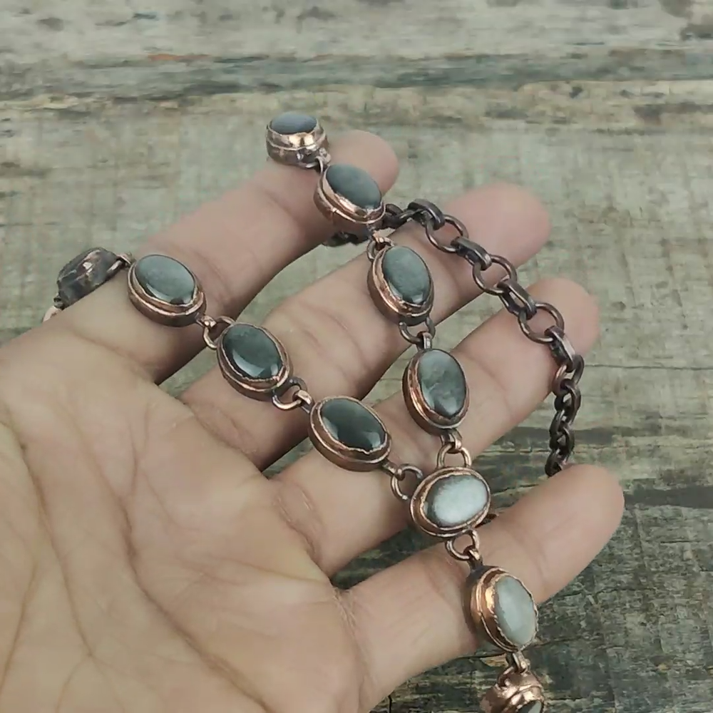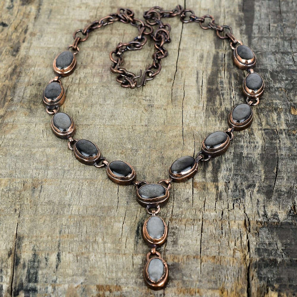 Note : Due to the natural formation of this gemstone. Slight variation in design and color are to be expected. Welcome to Silver Creation Mothers day Sale Silver Sheen Obsidian Stone Copper Chain Electroformed Necklace Handmade Necklace, Wire Wrapped Necklace, Wire Wrapped Jewelry, Copper Pendant, Copper Wire Necklace, Wrapped Jewelry, Wire Wrap Necklace, Wire Wrap Jewelry SKU : VZN-92 Stone Shape : Oval Metal Purity : Unknown Copper Length : 20 Inches Width : Inches Copper has been used for jewelry making for thousands of years, dating back to ancient civilizations such as the Egyptians, Romans, and Aztecs. Copper was valued for its beauty, versatility, and durability, and was often used to make everything from jewelry and coins to cookware and tools. In addition to its historical significance, copper jewelry also offers several benefits. Copper is a natural conductor of heat and electricity, which makes it ideal for energy healing and therapeutic purposes. Wearing copper jewelry is believed to have various health benefits, such as improving circulation, reducing inflammation, and boosting the immune system. Some people also believe that copper jewelry has the ability to balance energy and improve mood. For Mother's Day Gift For Father's Day Gift For Promise For Valentine' Day For Halloween Party For Christmas Day Gift For New Year Party For Mom For Her If you can't find the information you need or need some advice for your design? Feel free to contact us. We are fast to reply :) All our work is made by hand with Love and Care in our workshop Thank you so much for visiting and hope you enjoy shopping with us Silvercreations is committed to delivering the best quality sterling silver jewelry to customers. As a handmade jewelry manufacturer, we offer an extensive selection of copper gemstone jewelry that showcases the brilliance of our craftsmanship. We are an experienced handmade jewelry supplier with expertise in embellishing gemstones to suit every style. We offer you the liberty to create your jewelry ensemble with sparkling, earthy, and pure gemstones. Our Talented artisans masterfully handcraft each piece of jewelry you see here. Our pieces are made with genuine gemstones.