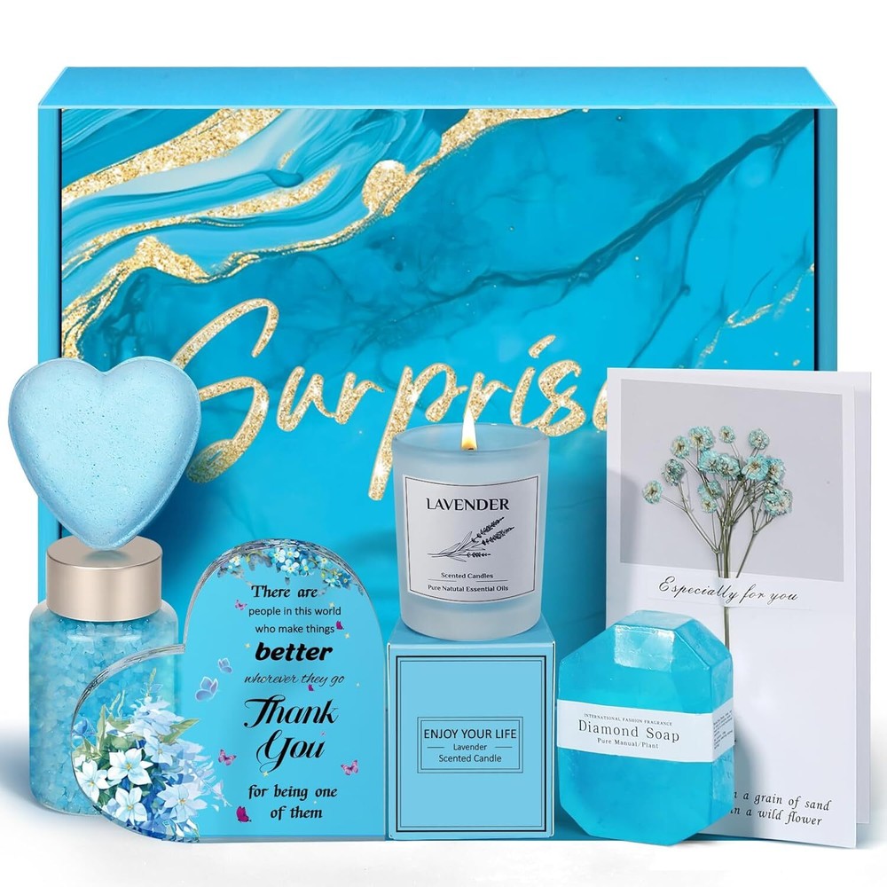 Mothers Day Gifts Basket for Mom from Daughter Son: Eletorot Relaxing Spa Gift B About this item: Practical 6-in-1 Thank You Gifts: Each gift basket contains 1*4.5x3.3 in heart-shaped acrylic keepsake, 1*lavender-scented candle, 1*diamond soap, 1*heart-shaped bath bomb, 1*bath salt, and 1*greeting card. Celebrate the extraordinary women in your life with this exquisite gift basket Unique Gifts: Simply show your appreciation with thank you gift for family, teachers, friends, coworkers, employee, bosses, volunteers, nurses, doctors, directors, assistant principal on Teacher's Day, administrative professional Day,Thanksgiving, anniversaries, birthdays, graduations. Appreciation Gift Decor: Express your gratitude with our heart-shaped acrylic keepsake with inspirational warmth message: "There are people in this world who make things better wherever they go thank you for being one of them.” Display it in their bedroom, office, or anywhere they'll see it often to keep the gratitude alive. An ideal gift for teachers, coworkers, or friends Send Her Fragrant Relaxed Bath Time: We have carefully selected each item in the thank you gift baskets. Indulge in the soothing aroma of bath salt, soaps, bath bombs, and scented candles, and treat her to a relaxing home spa experience that help soothe her mind and relax. Let’s remind her to enjoy happy days Elegantly Packaged, Ready to Gift: Presented in a beautifully designed gift basket, no need to repackage for gifting. This carefully curated gift set is a heartfelt way to express your thankfulness and appreciation to someone special in your life