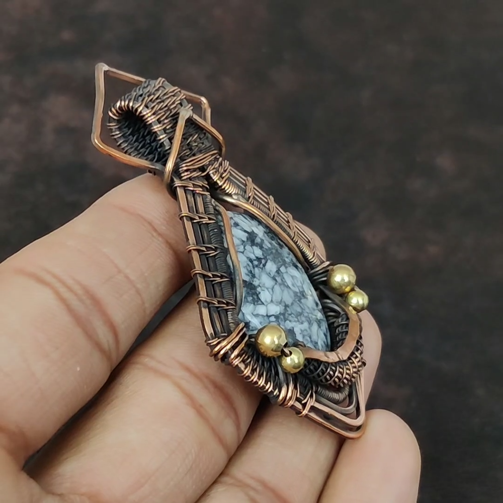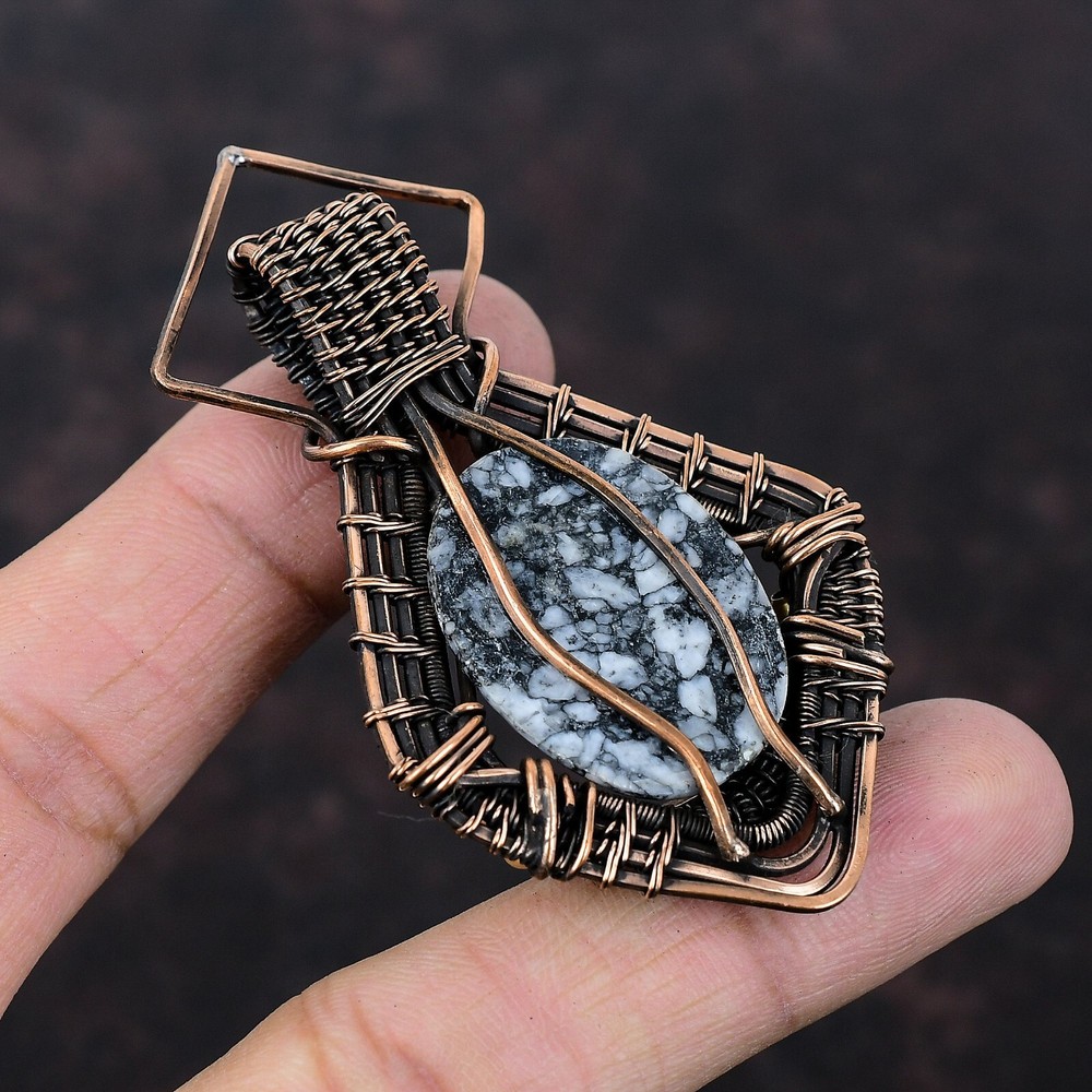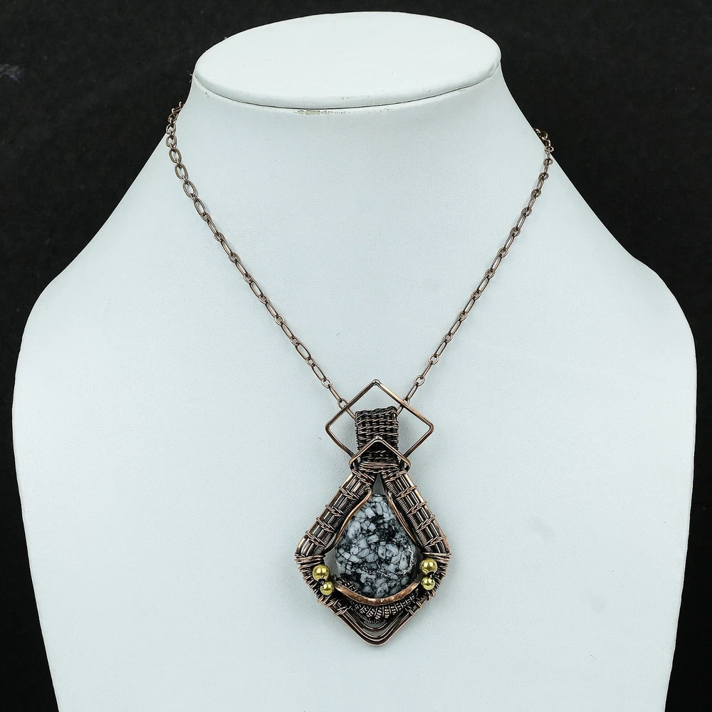 Note : Due to the natural formation of this gemstone. Slight variation in design and color are to be expected. Welcome to Silver Creation Mothers day Deal Copper Natural Pinolith Jasper Wire Wrapped New Pendant Jewelry Handmade Pendant, Wire Wrapped Pendant, Wire Wrapped Jewelry, Copper Pendant, Copper Wire Pendant, Wrapped Jewelry, Wire Wrap Pendant, Wire Wrap Jewelry SKU : VFWP-1777 Stone Shape : Oval Metal Purity : Unknown Copper Length : 71 Millimeters Width : 45 Millimeters Copper has been used for jewelry making for thousands of years, dating back to ancient civilizations such as the Egyptians, Romans, and Aztecs. Copper was valued for its beauty, versatility, and durability, and was often used to make everything from jewelry and coins to cookware and tools. In addition to its historical significance, copper jewelry also offers several benefits. Copper is a natural conductor of heat and electricity, which makes it ideal for energy healing and therapeutic purposes. Wearing copper jewelry is believed to have various health benefits, such as improving circulation, reducing inflammation, and boosting the immune system. Some people also believe that copper jewelry has the ability to balance energy and improve mood. For Mother's Day Gift For Father's Day Gift For Promise For Valentine' Day For Halloween Party For Christmas Day Gift For New Year Party For Mom For Her If you can't find the information you need or need some advice for your design? Feel free to contact us. We are fast to reply :) All our work is made by hand with Love and Care in our workshop Thank you so much for visiting and hope you enjoy shopping with us Silvercreations is committed to delivering the best quality sterling silver jewelry to customers. As a handmade jewelry manufacturer, we offer an extensive selection of copper gemstone jewelry that showcases the brilliance of our craftsmanship. We are an experienced handmade jewelry supplier with expertise in embellishing gemstones to suit every style. We offer you the liberty to create your jewelry ensemble with sparkling, earthy, and pure gemstones. Our Talented artisans masterfully handcraft each piece of jewelry you see here. Our pieces are made with genuine gemstones.