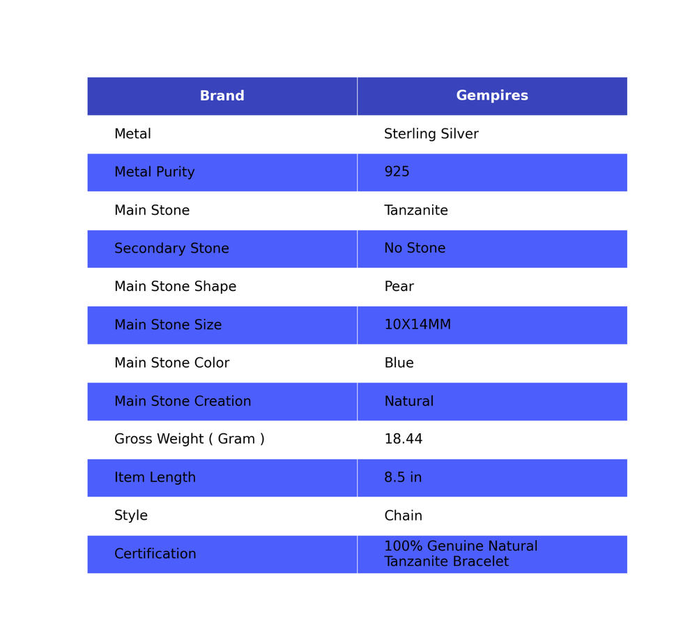 Welcome To Our Shop Gempires ------------------------------------------- Add vivacity to your glamorous look by wearing this Bracelets by Gempires. Featuring an ethnic handmade design, this Bracelet is embellished with Tanzanite for a more feminine effect. Wear these 925 Sterling Silver Bracelet with your best casual outfits to look iconic. Mothers day Sale Sterling Silver Tanzanite Stone Chain Wife New Bracelet Jewelry Check My Other Bracelet Listings : Click Here SKU:- RB-11-6 Metal:- Sterling Silver Metal Purity:- 925 Gemstone:- Tanzanite Gemstone Color:- Blue Gemstone Shape :- Pear Gemstone Creation :- Natural Stone Setting :- Bezel Bracelet Length:- 8.5 Inches Bracelet Width:- Inches ___________________________________________________________________ Shipping Handling - Free Standard Shipping all over the world Handling Time - 2 to 5 BUSINESS Days Delivery Time - 7 to 20 Days ( Various on destination ) _________________________________________________________________ Returns - 1.We provide a 100% Money Back Guarantee, excluding shipping costs, within 30 days from the date of item receipt. 2.The item must not be altered or damaged in any way shape or form. 3.Upon receipt of the aforementioned items, your payment will be promptly refunded. 4.Please be so kind as to contact us via email in order to acquire comprehensive return instructions before proceeding with the return of the merchandise. 5.Kindly be advised to allocate a maximum period of 1 business day for the processing of all returns, in order for the appropriate credit to be applied. 6.Sizing does not affect the return policy. _________________________________________________________________ FAQ's - Q.1 ARE THE ITEMS YOU ARE SELLING BRAND NEW? We exclusively offer brand-new products, refraining from the sale of pre-owned jewelry. Our entire jewelry collection is composed of 100% natural, conflict-free pieces. We do not engage in the trade of imitation or lab-grown gemstones and diamonds. Q.2 WHAT ARE YOUR BUSINESS HOURS? we operate 24x7 as we have a dedicated team who works in different shifts to deliver the services to our valuable customers. ________________________________________________________________ Gempires is committed to delivering customers an unparalleled experience through the provision of exquisite handmade jewelry, meticulously crafted to uphold the most exacting standards of quality. Our operations encompass dual roles as both discerning connoisseurs and skilled artisans within the realm of jewelry making. We proudly hold an extensive proficiency in the fine art of enhancing gemstones, allowing us to harmonize them seamlessly with diverse aesthetic inclinations. We are delighted to extend to you the privilege of curating your very own jewelry collection. This collection will be graced by the presence of genuine and splendid natural gemstones, each possessing an innate authenticity and beauty that is truly unparalleled. **** STAY BLESSED ALWAYS*****