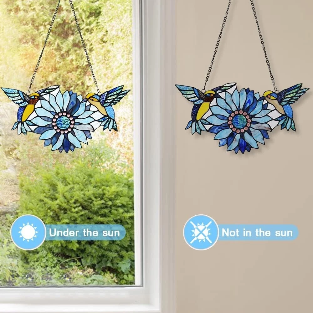 Mothers Day Sunflower Hummingbirds Gifts Stained Glass Window Hangings Suncatchers Tiffany Art Style Handicrafts Flower Birds Lovers Gifts for Home Window Decor Size: Stained glass window hangings is in inches Wide and inches Height, it comes with 33 inches long chain Handcrafted with care: Each stained glass panel is handcrafted by skilled artisans, ensuring attention to detail and quality. The vibrant colors and intricate design make it a stunning addition to any home decor. Stained glass Crafts product: Design with beautiful sunflower and 2 birds in stained glass stand two side of the sunflower, vividly presents the frolicking of birds and flowers. This stained glass art panels is marveled every time when the sunshine comes through window. Tiffany-style design: Inspired by the famous Tiffany style, this stained glass panel features a rich and luxurious feel. The use of stained glass and copper foil creates a beautiful shimmer and shine, adding a touch of elegance to any room. Beautiful gift: Stained glass window hangings is a special gift for family members,lover,friends,colleagues,because tiffany window hanging will add luster to their life Happy Mother's Day! Happy Mother's Day to the sweetest most loving and caring mama we have ever known! We are so blessed to be loved by you!
