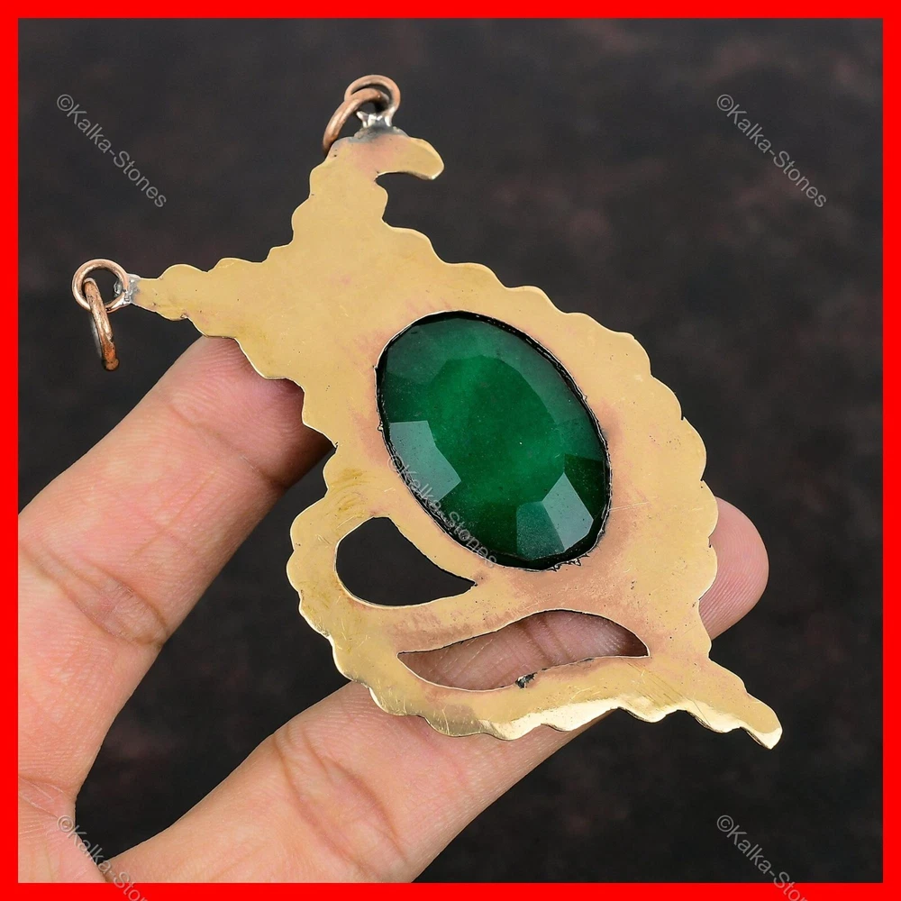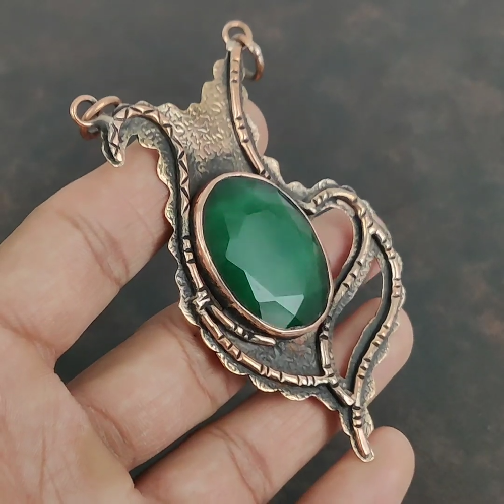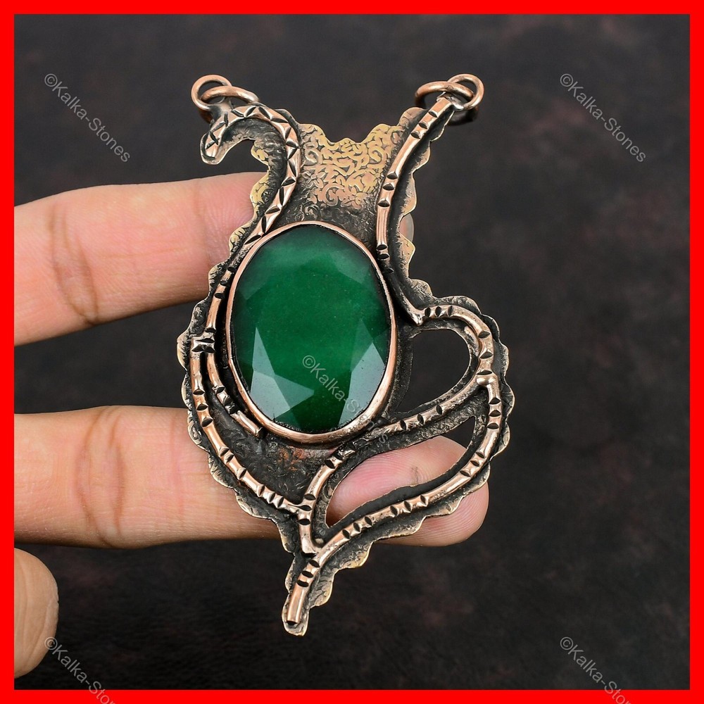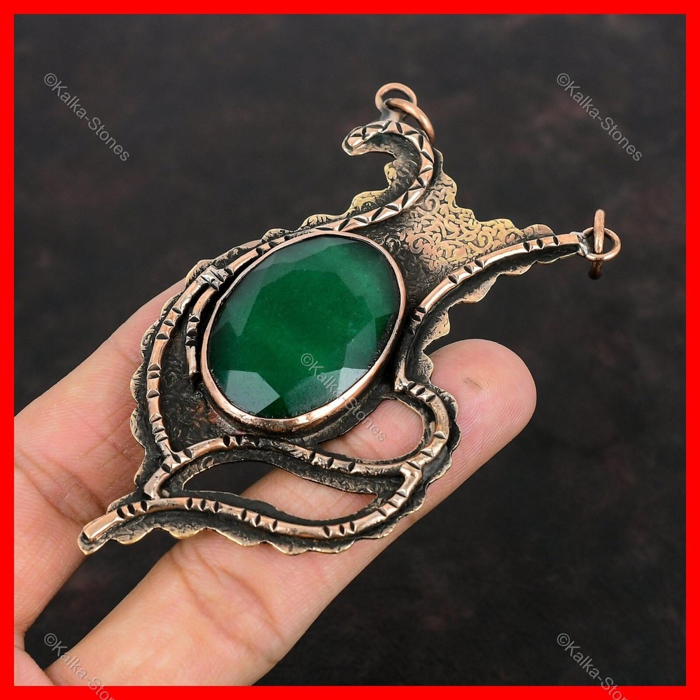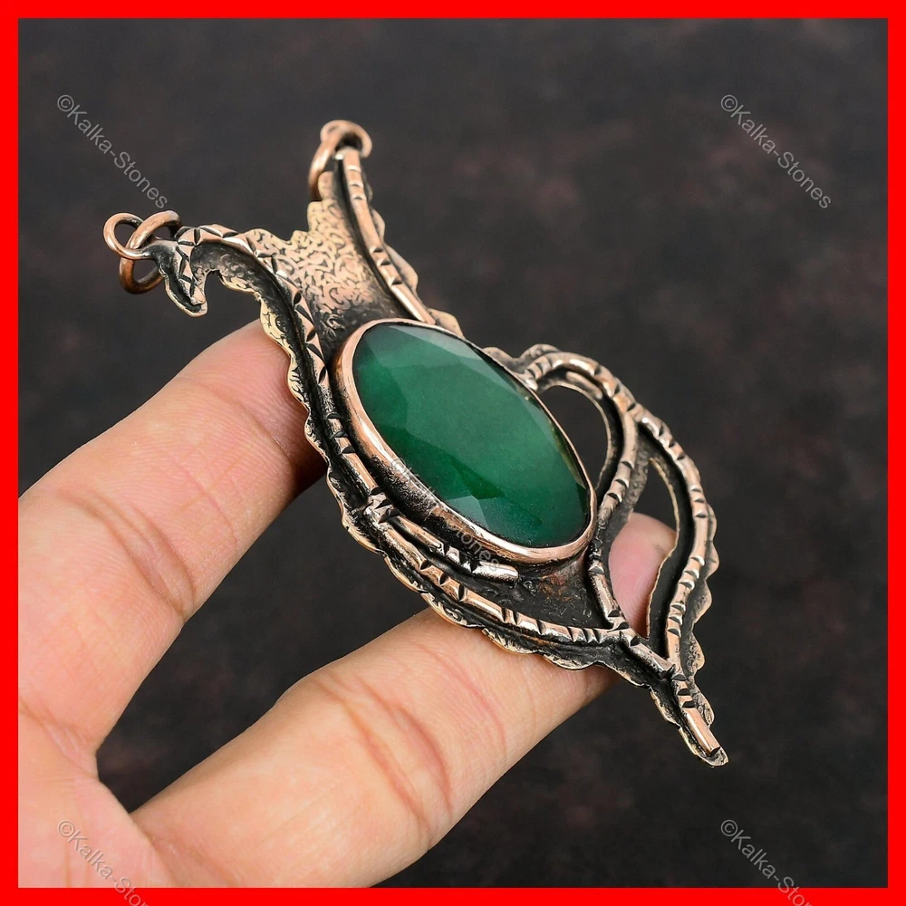 Note : Due to the natural formation of this gemstone. Slight variation in design and color are to be expected. Welcome to Kalka Stones Mothers day Deal Zambian Emerald Stone Sister Bezel Engagement Pendant Copper Handmade Pendant, Wire Wrapped Pendant, Wire Wrapped Jewelry, Copper Pendant, Copper Wire Pendant, Wrapped Jewelry, Wire Wrap Pendant, Wire Wrap Jewelry SKU : VWP-20 Gemstone : Zambian Emerald Stone Shape : Oval Metal Purity : Unknown Copper Length : 92 Millimeters Width : 53 Millimeters Copper has been used for jewelry making for thousands of years, dating back to ancient civilizations such as the Egyptians, Romans, and Aztecs. Copper was valued for its beauty, versatility, and durability, and was often used to make everything from jewelry and coins to cookware and tools. In addition to its historical significance, copper jewelry also offers several benefits. Copper is a natural conductor of heat and electricity, which makes it ideal for energy healing and therapeutic purposes. Wearing copper jewelry is believed to have various health benefits, such as improving circulation, reducing inflammation, and boosting the immune system. Some people also believe that copper jewelry has the ability to balance energy and improve mood. For Mother's Day Gift For Father's Day Gift For Promise For Valentine's Day For Halloween Party For Christmas Day Gift For New Year Party For Mom For Her If you can't find the information you need or need some advice for your design? Feel free to contact us. We are fast to reply :) All our work is made by hand with Love and Care in our workshop Thank you so much for visiting and hope you enjoy shopping with us Kalka Stones is committed to delivering the best quality jewelry to customers. As a handmade jewelry manufacturer, we offer an extensive selection of copper gemstone jewelry that showcases the brilliance of our craftsmanship. We are an experienced handmade jewelry supplier with expertise in embellishing gemstones to suit every style. We offer you the liberty to create your jewelry ensemble with sparkling, earthy, and pure gemstones. Our Talented artisans masterfully handcraft each piece of jewelry you see here. Our pieces are made with genuine gemstones.